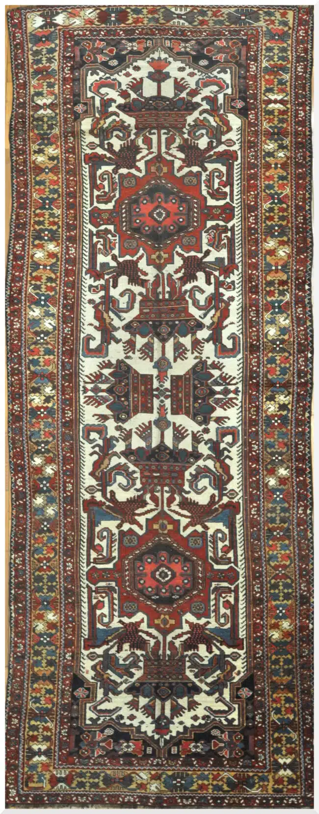 This Persian tribal runner showcases a bold and symmetrical composition centered on a large geometric medallion set against an ivory ground. The field is filled with angular tribal motifs and symbolic forms that reflect the strong visual language of traditional village and nomadic weaving.