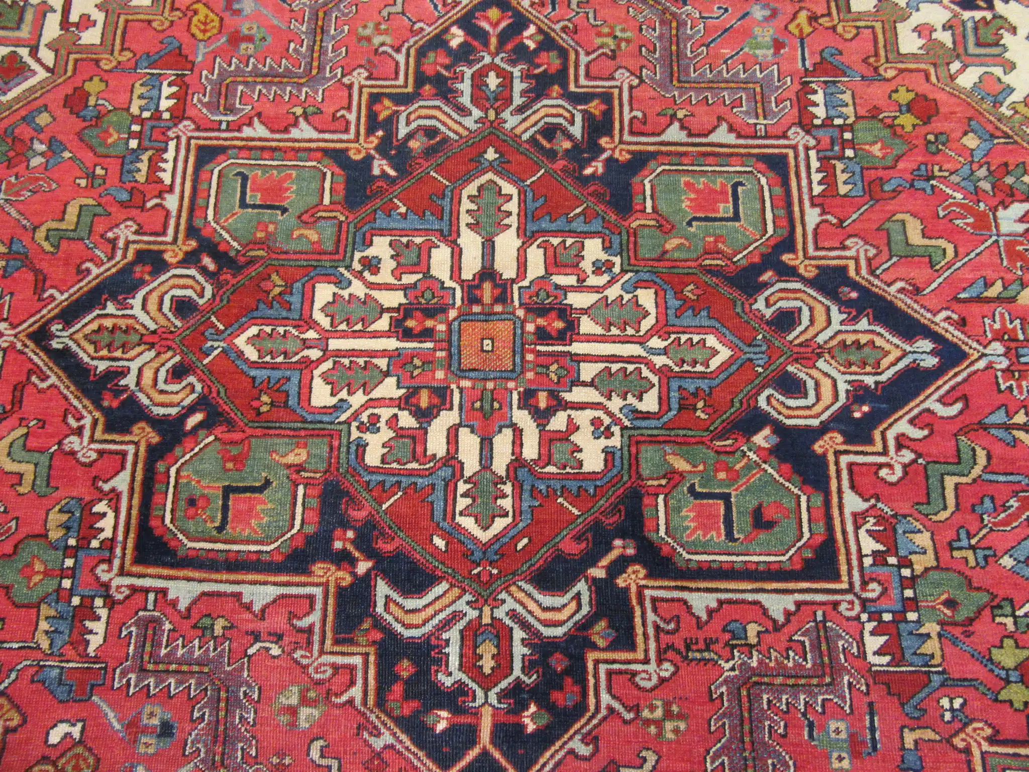 A bold and elegant 9′ x 12′ Persian Heriz rug featuring rich red tones, traditional geometric design, and hand-knotted wool craftsmanship, ideal for classic and luxury interiors.