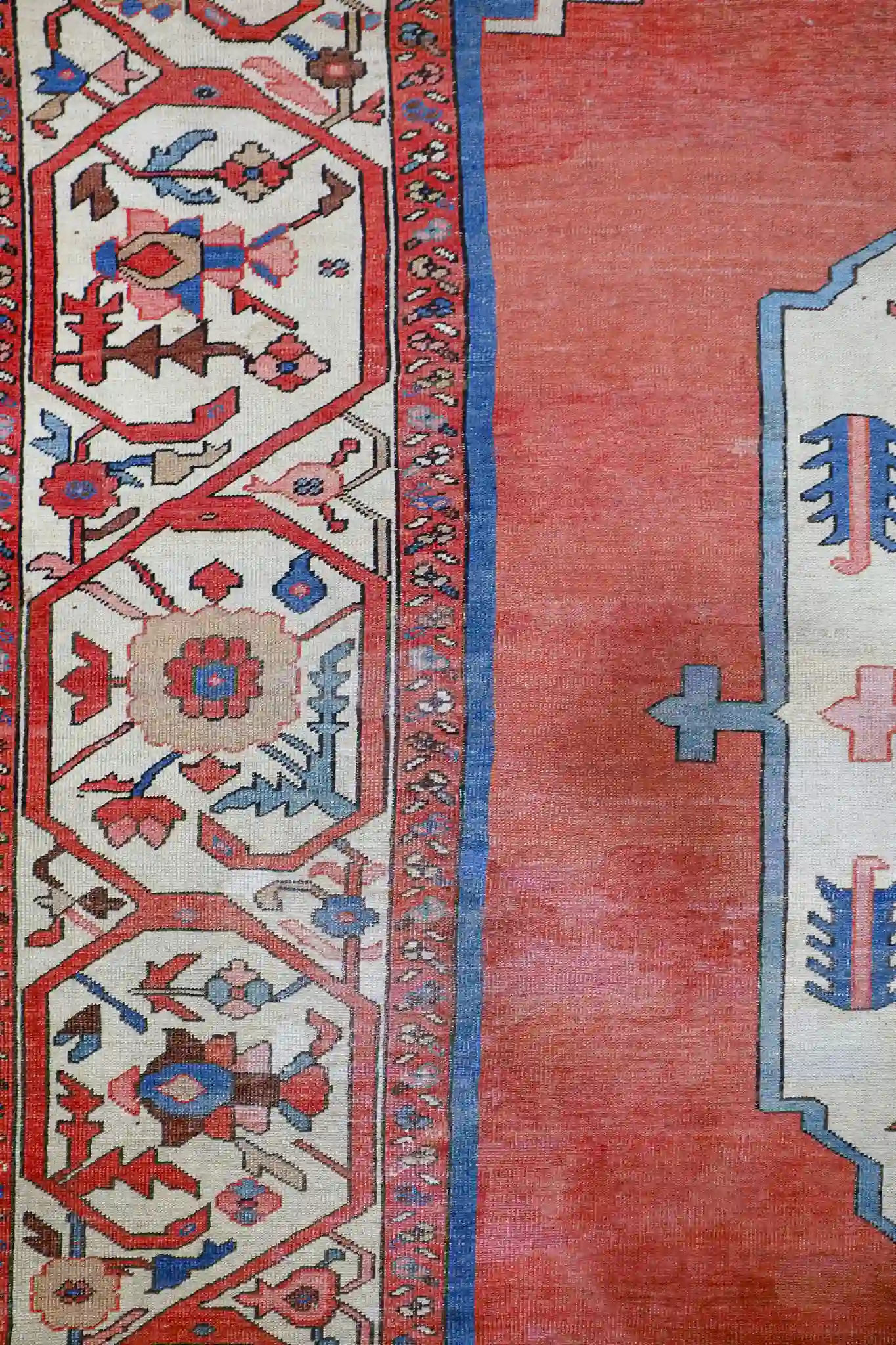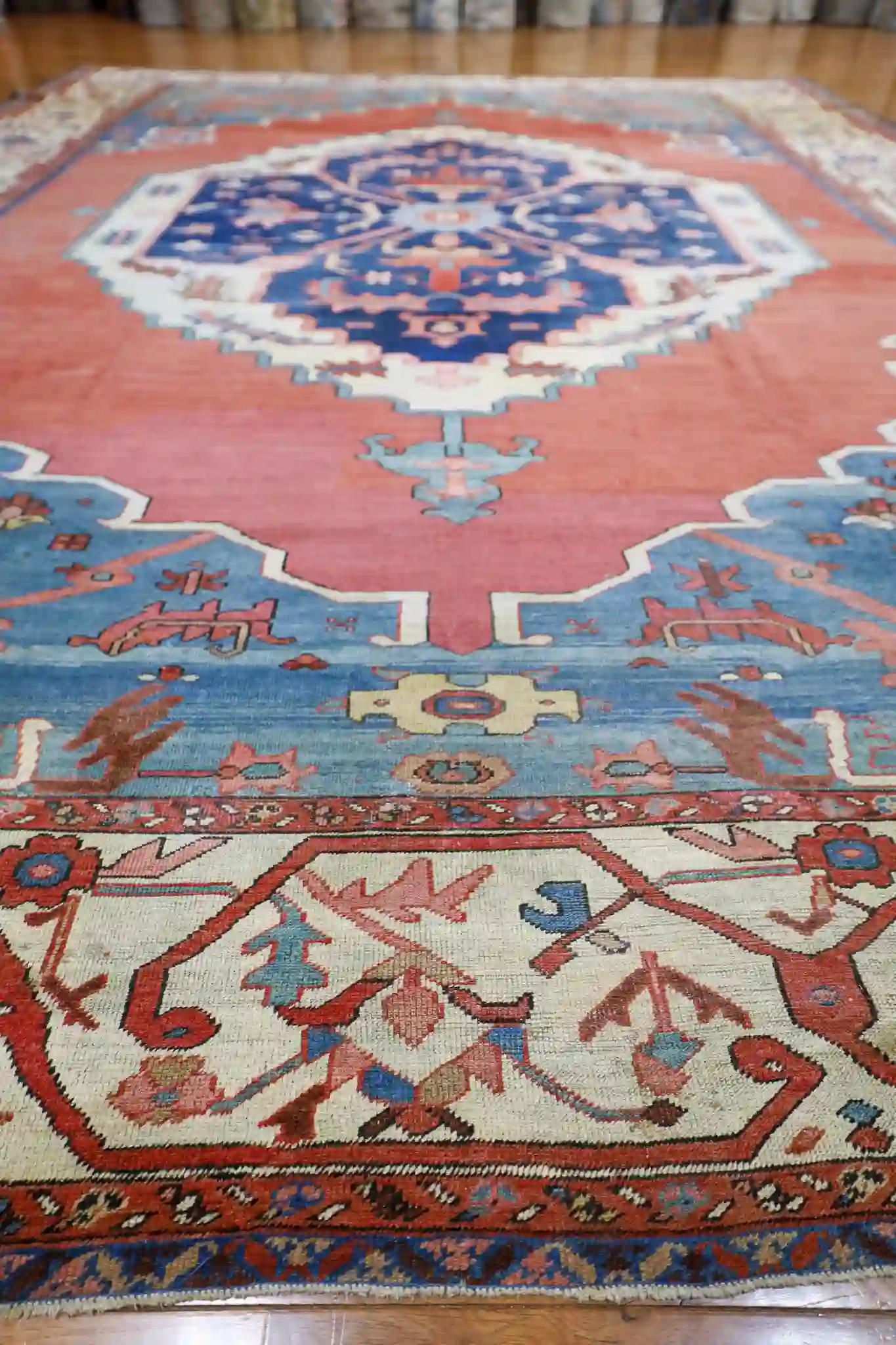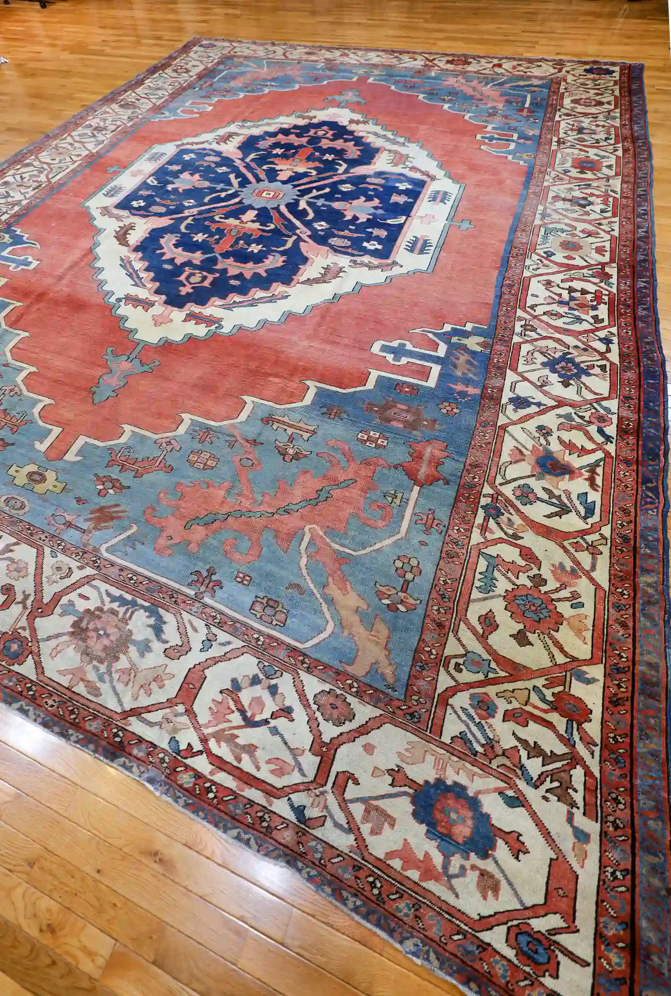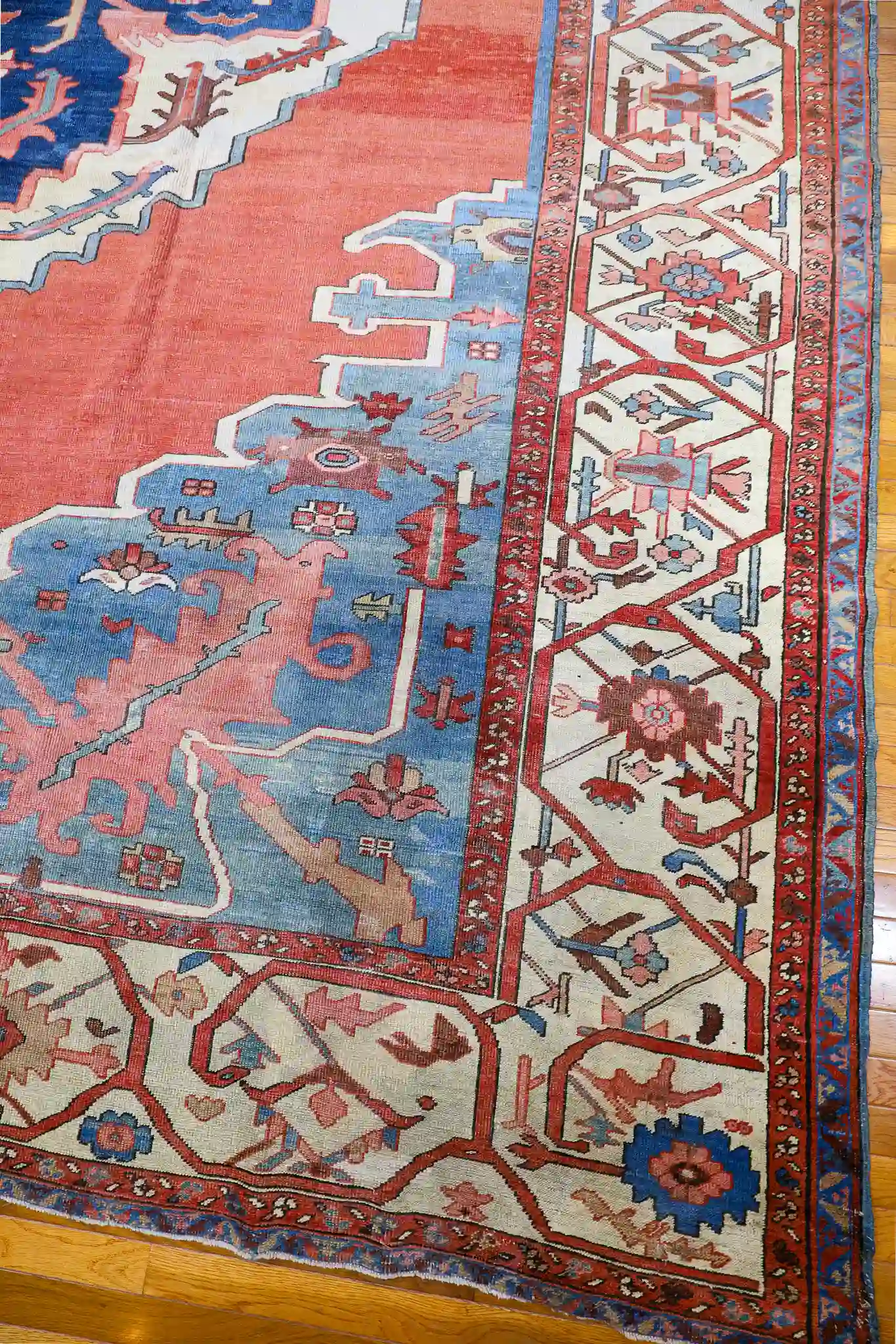 Serapi rugs from this period are prized for their strong, open geometric layouts inspired by Heriz weaving traditions, yet with a distinctive lighter and more spacious feel. The hand-knotted wool pile is thick and durable, showing the high knot count typical of quality antique Persian pieces. These rugs were made for long-term use and often develop a beautiful luster with age and gentle wear.