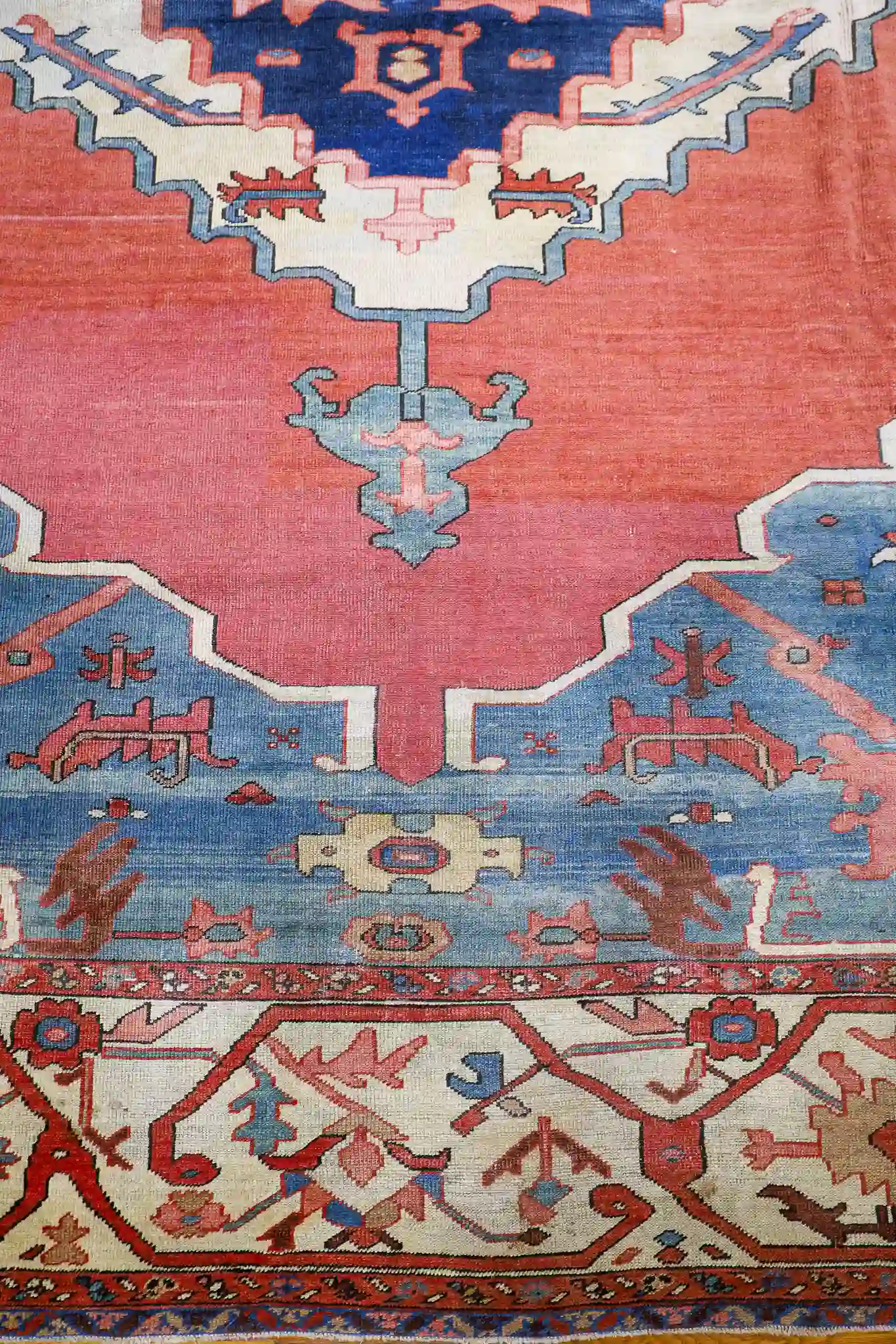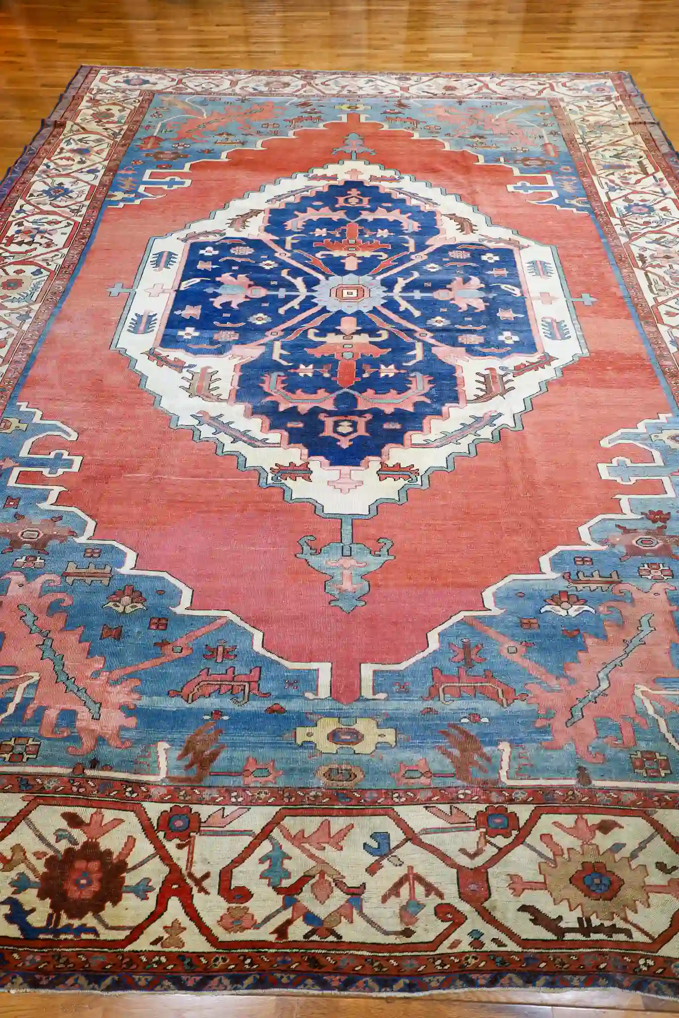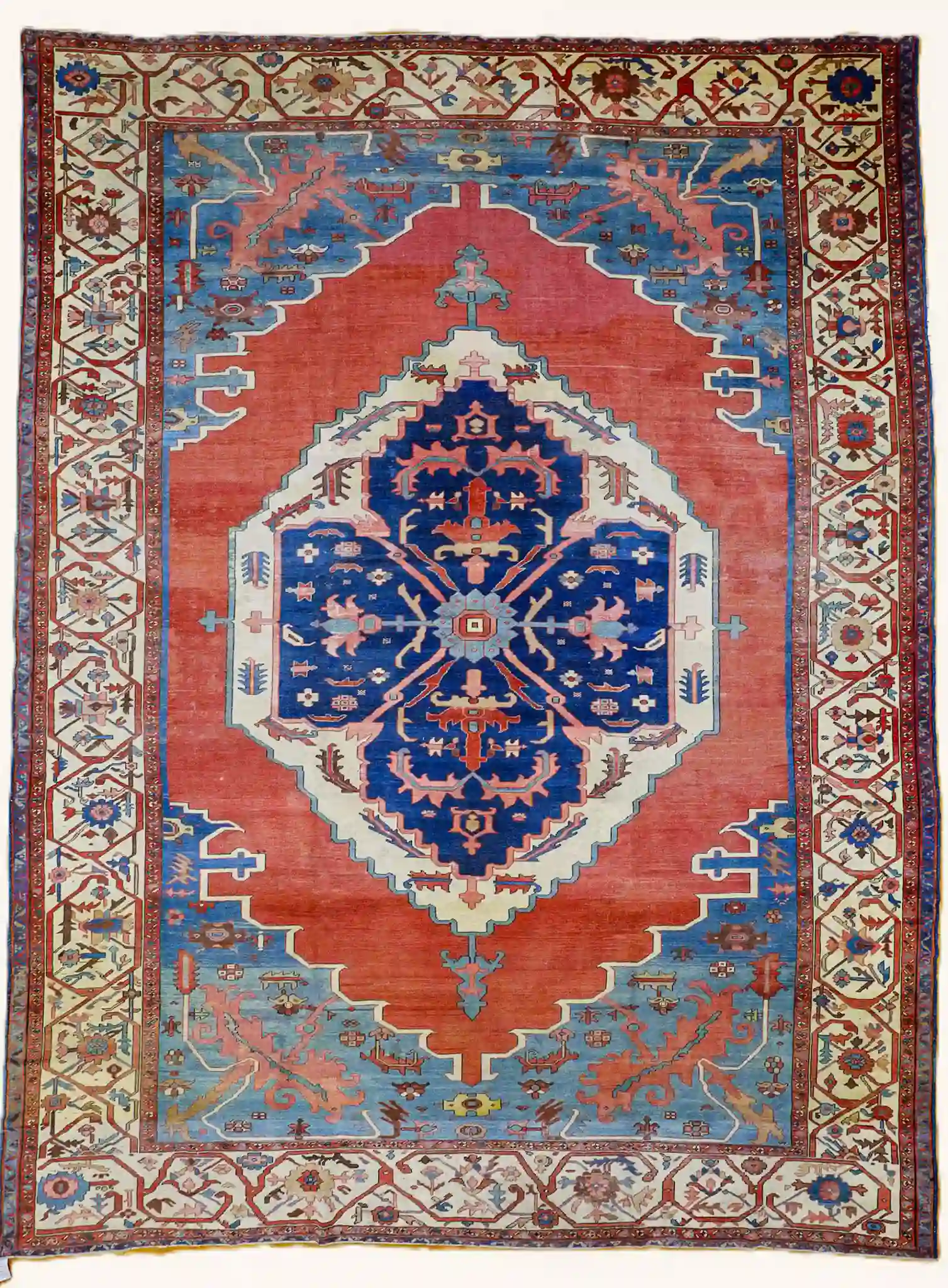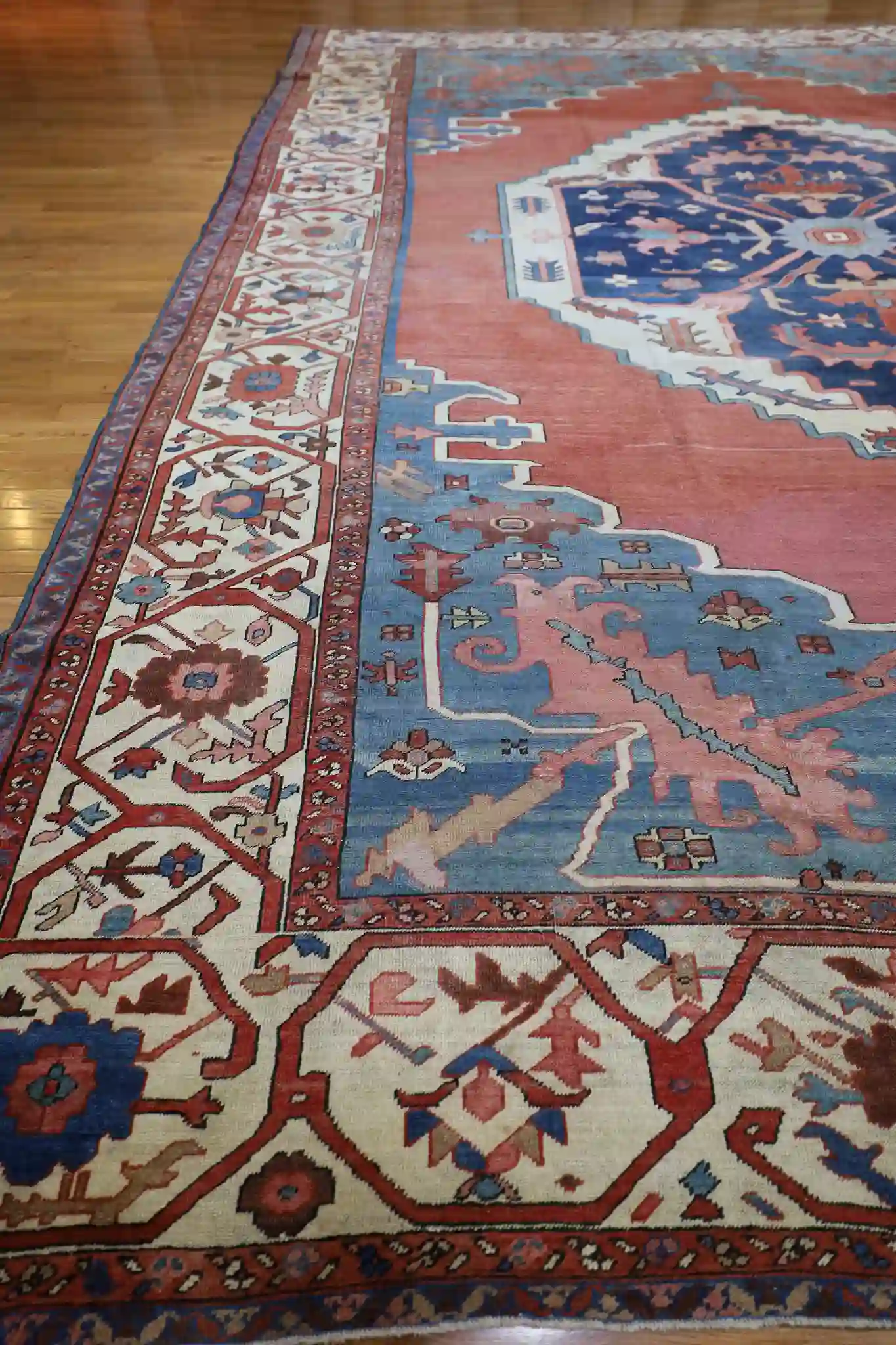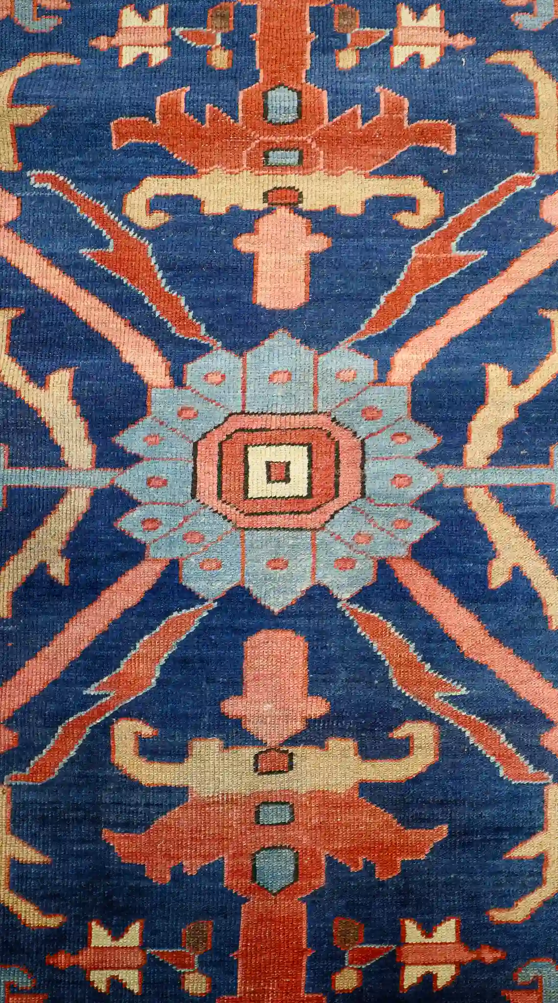 Serapi rugs from this period are prized for their strong, open geometric layouts inspired by Heriz weaving traditions, yet with a distinctive lighter and more spacious feel. The hand-knotted wool pile is thick and durable, showing the high knot count typical of quality antique Persian pieces. These rugs were made for long-term use and often develop a beautiful luster with age and gentle wear.