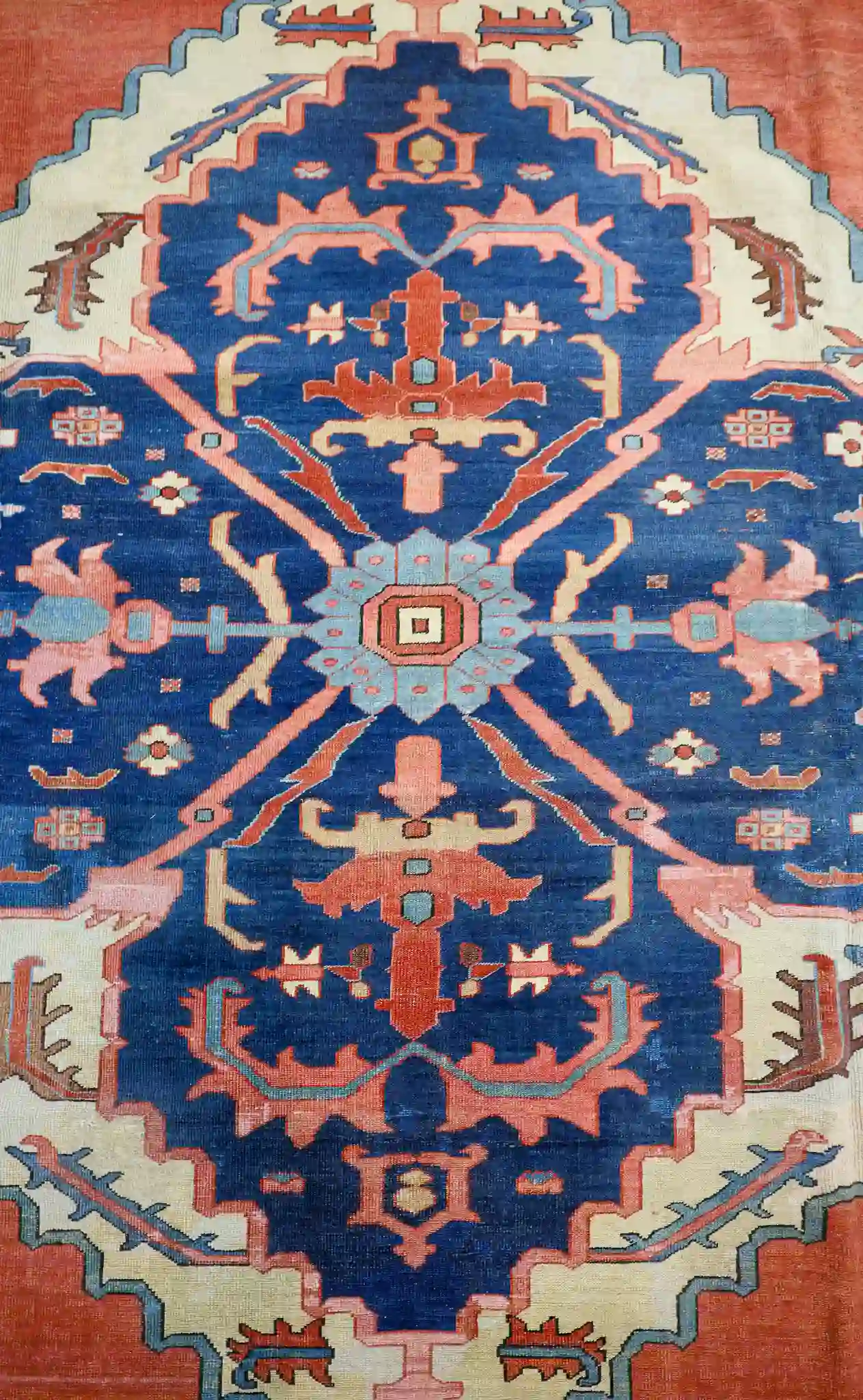 Terracotta red (main field), deep blue, navy, cream, soft turquoise, brown accents