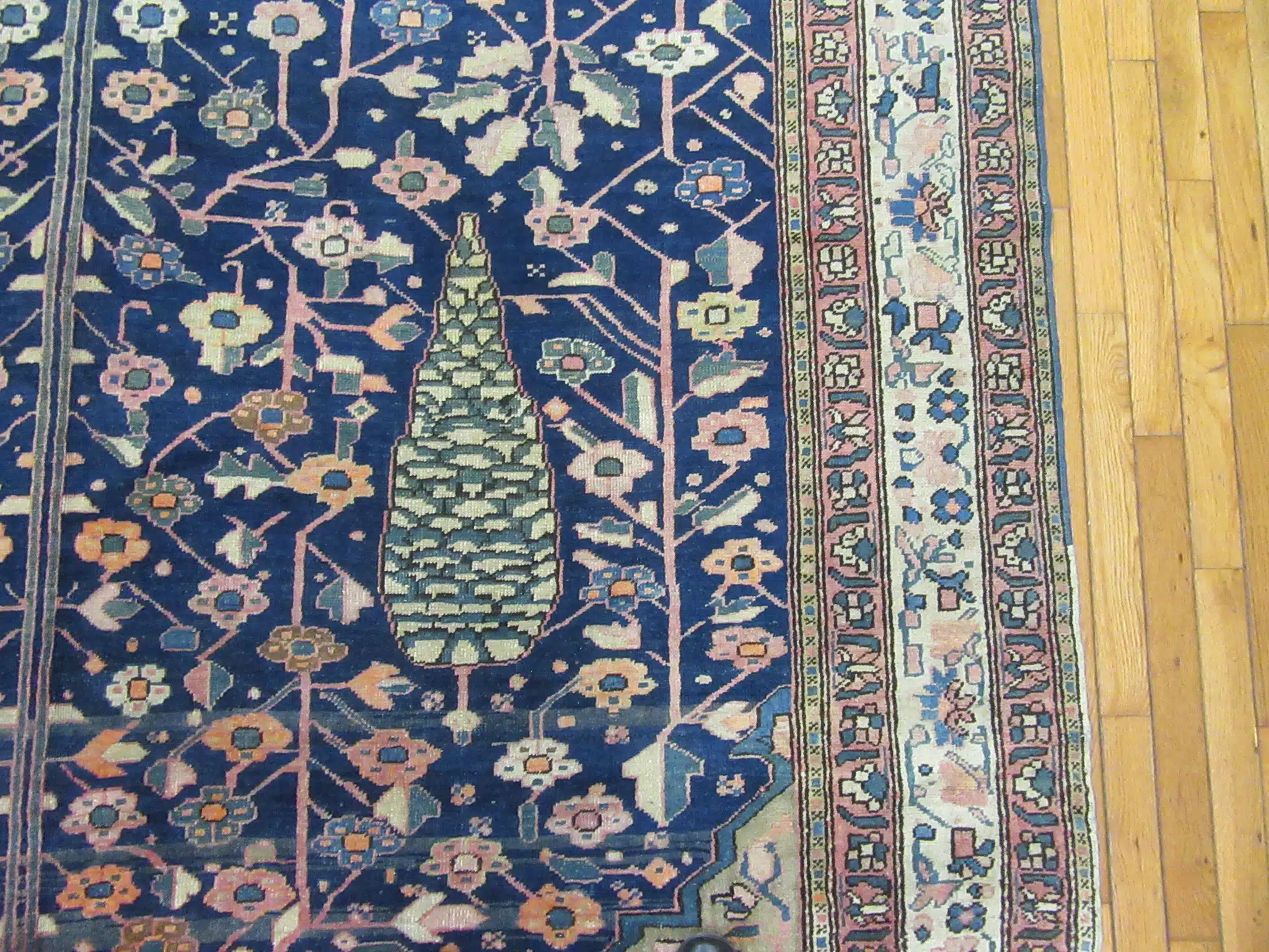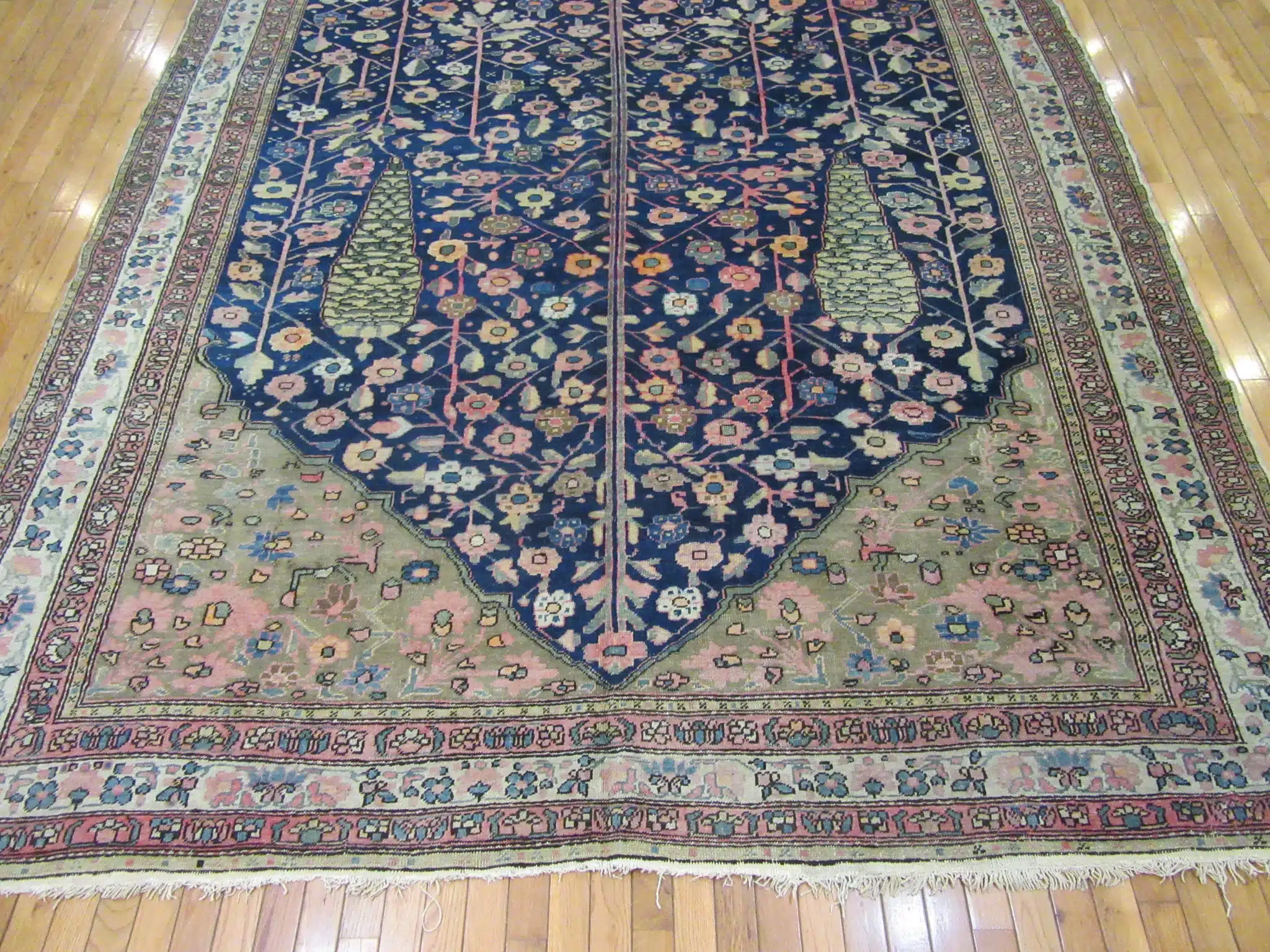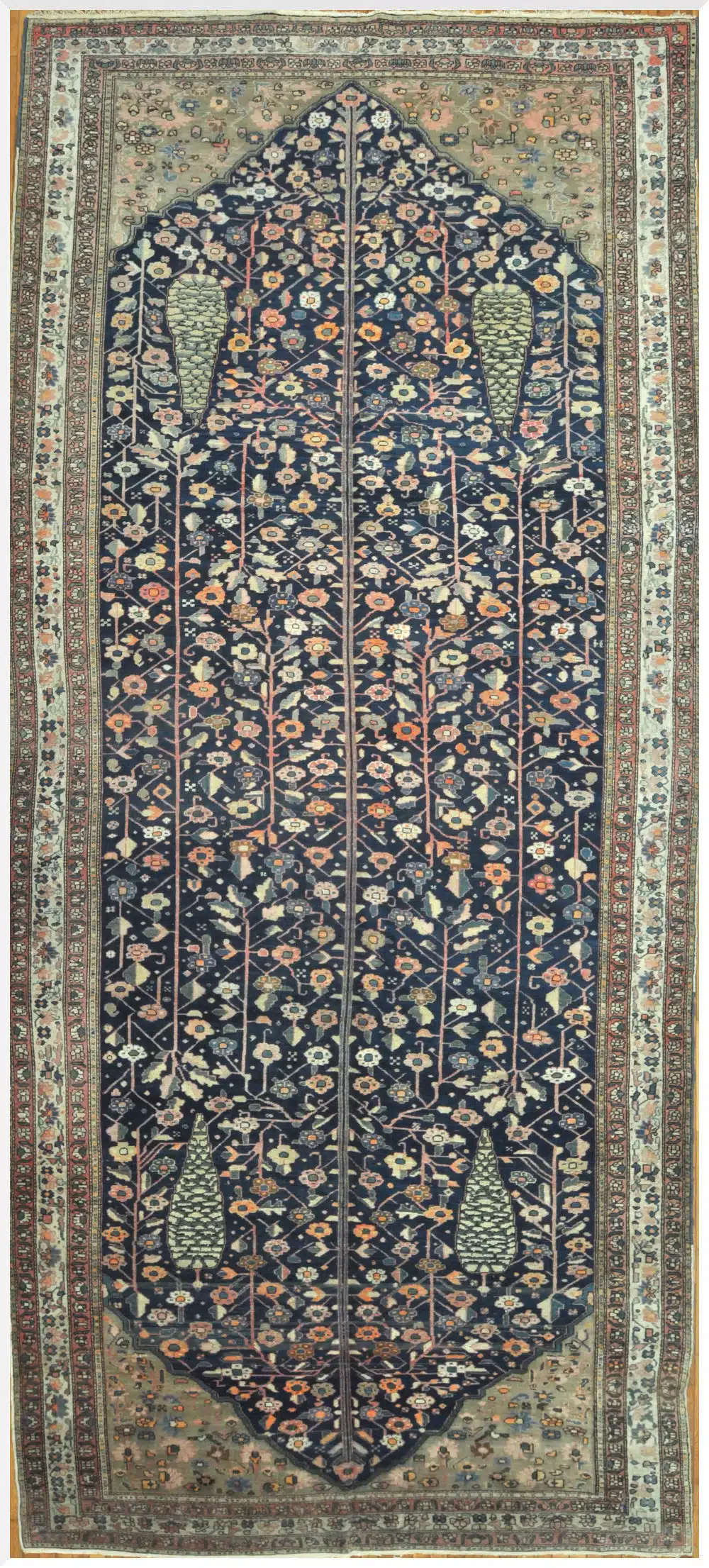 The lower portion of the field features stylized tree and boteh-inspired forms, while the upper section transitions into a dense lattice of floral elements, demonstrating the weaver’s mastery of pattern control and spacing. The intricate drawing and subtle color transitions give the rug depth and visual movement without overwhelming the design.