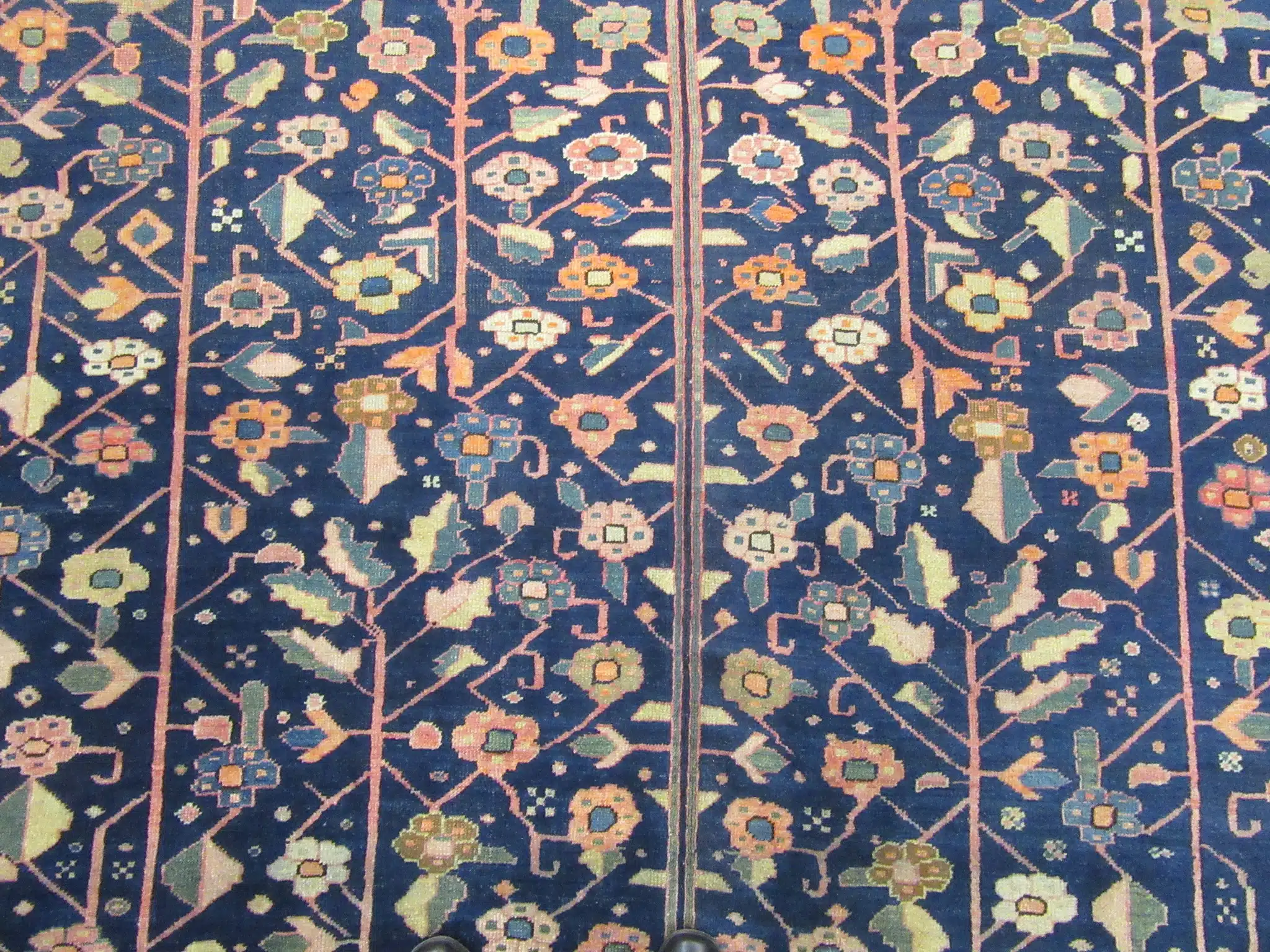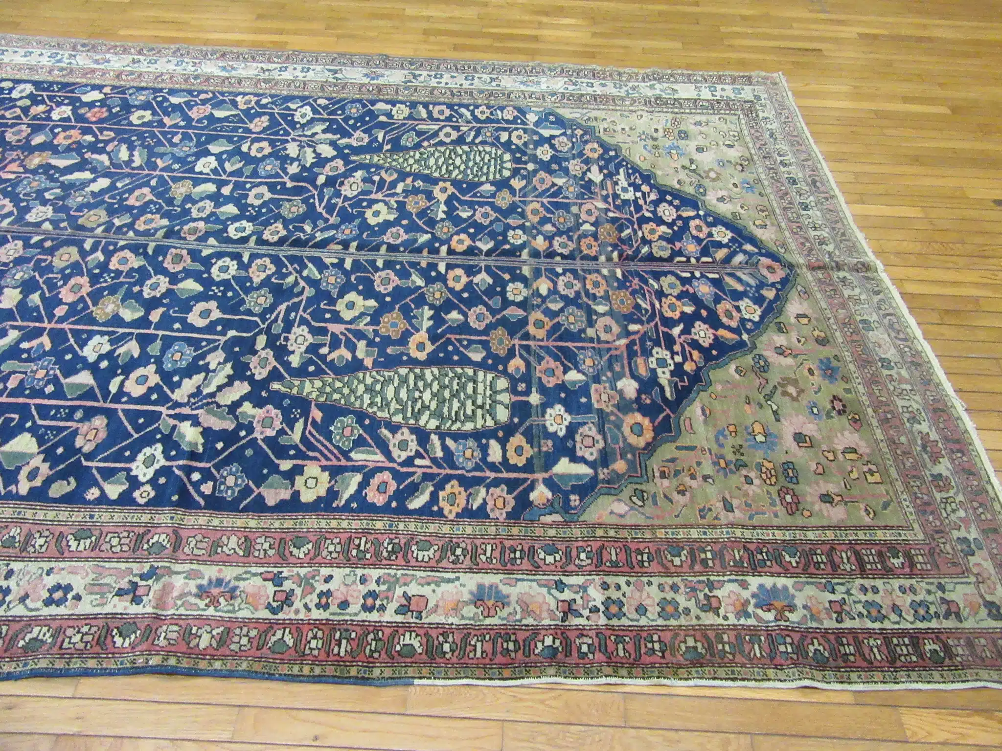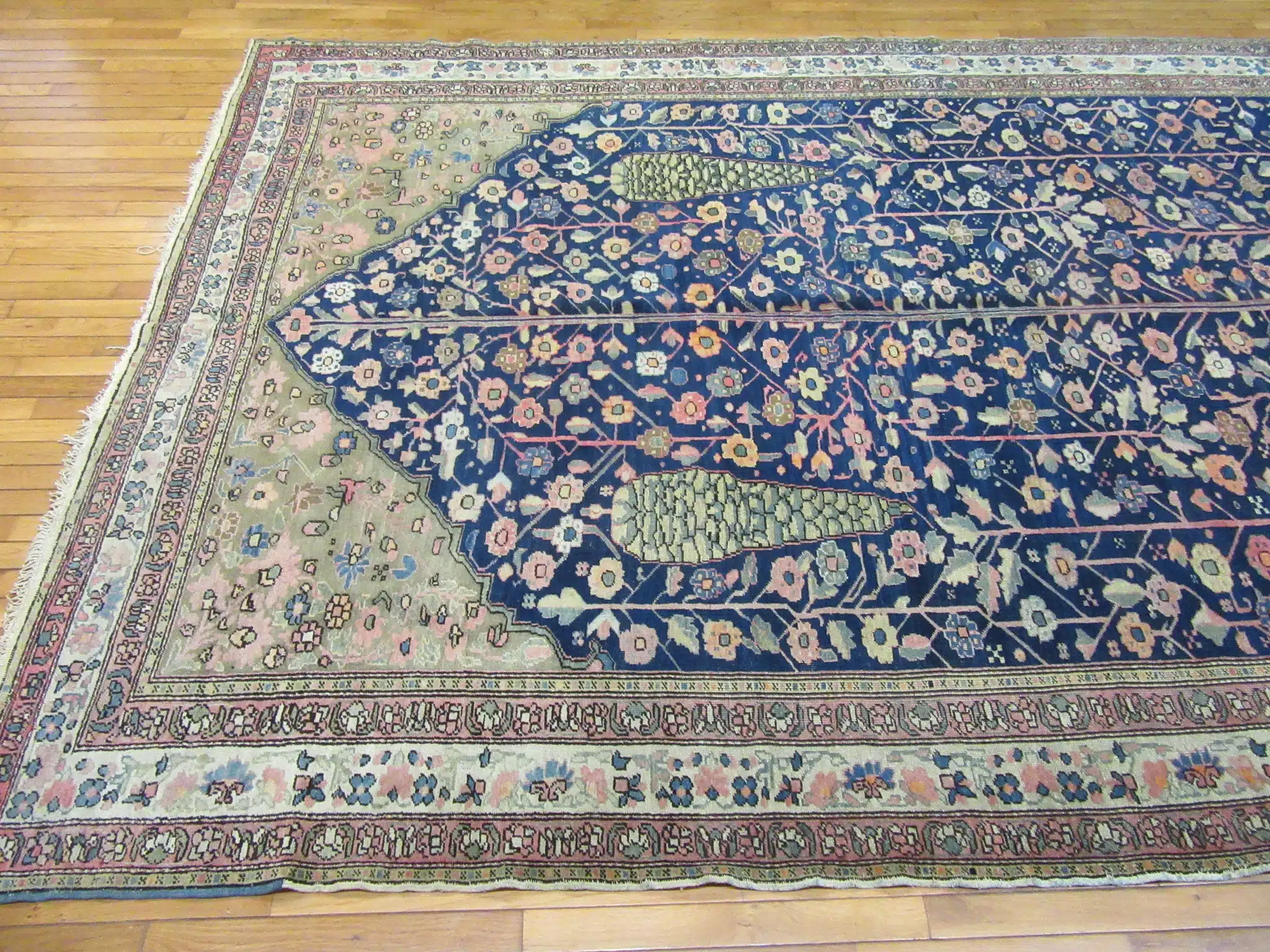 The lower portion of the field features stylized tree and boteh-inspired forms, while the upper section transitions into a dense lattice of floral elements, demonstrating the weaver’s mastery of pattern control and spacing. The intricate drawing and subtle color transitions give the rug depth and visual movement without overwhelming the design.