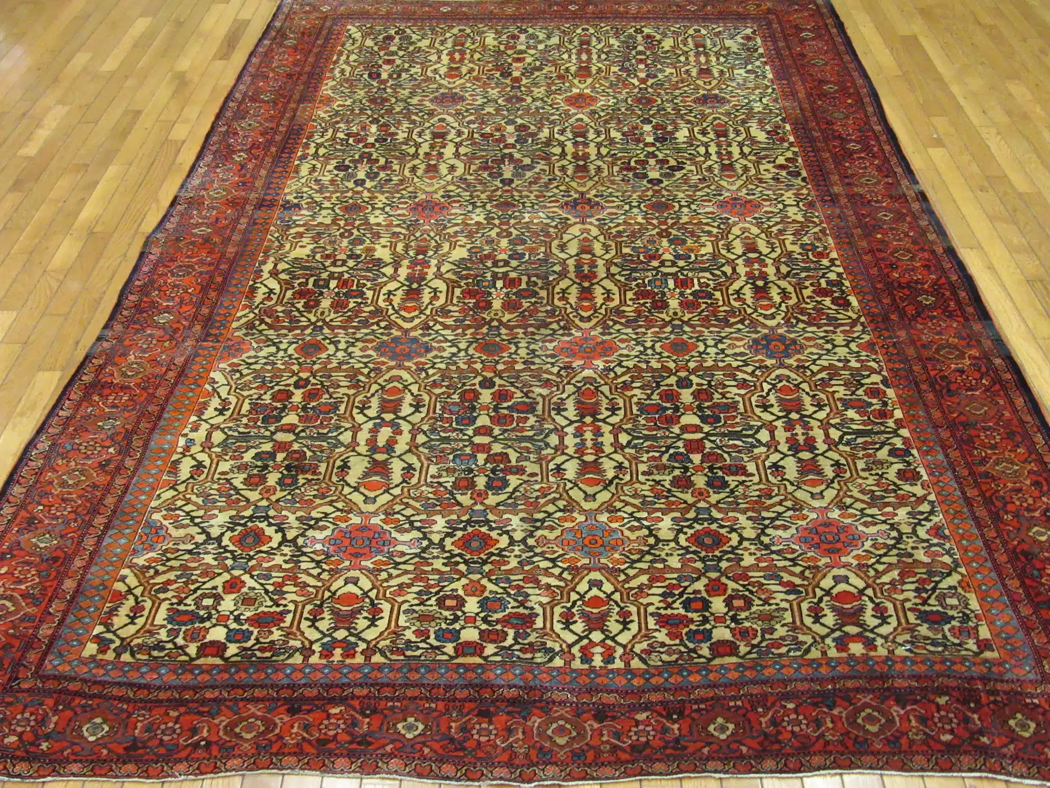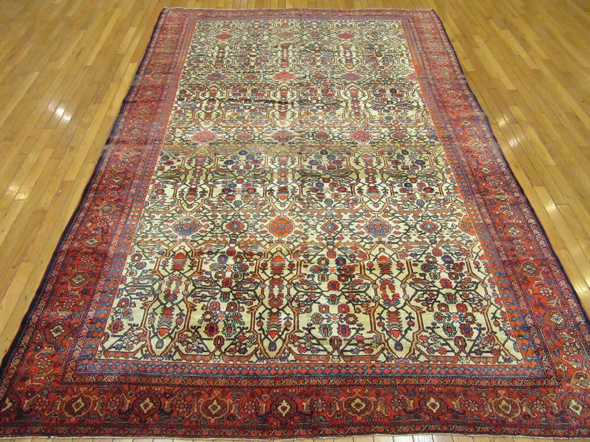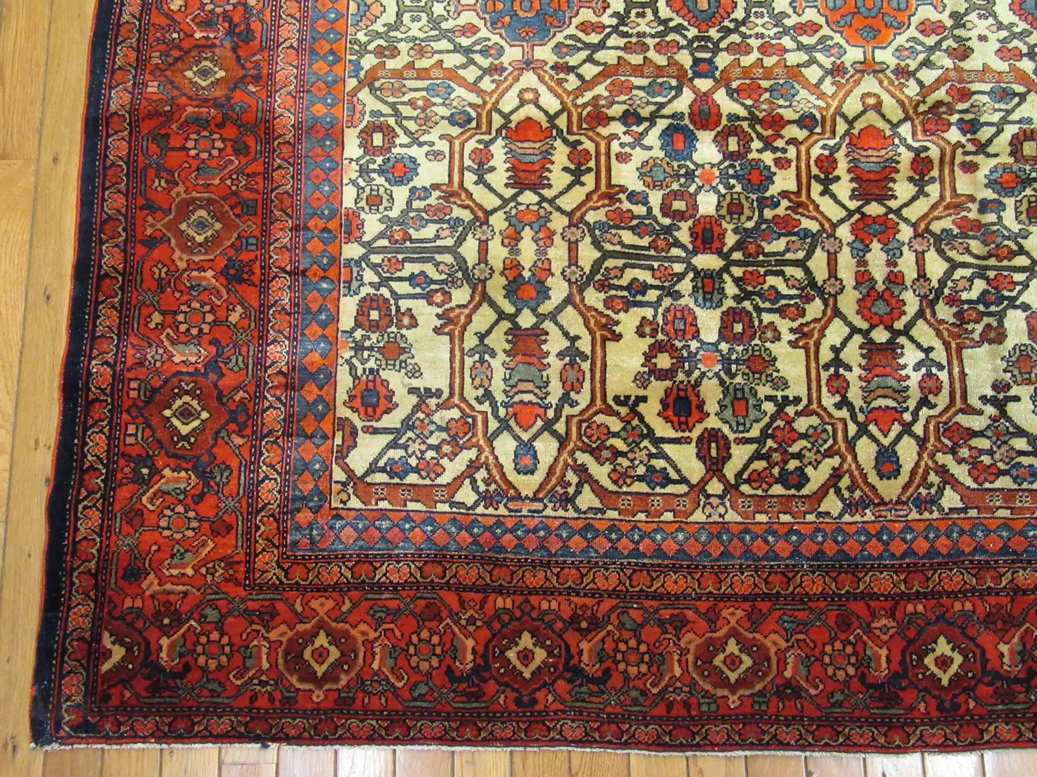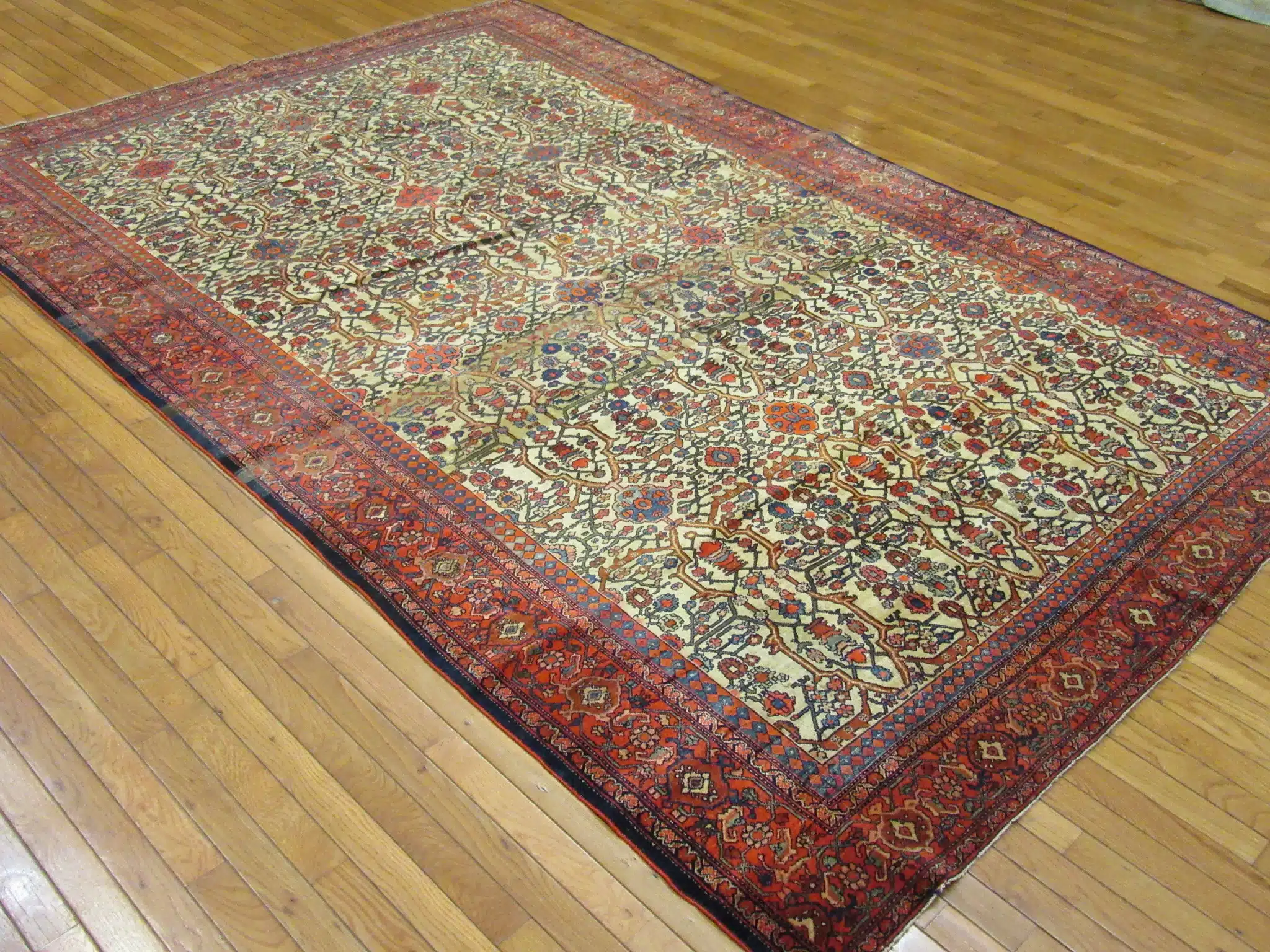 This antique Persian Sarouk Farahan rug from around 1900 showcases a detailed all-over pattern with intricate floral and vine motifs densely arranged across an ivory field. The design features classic Persian elements like palmettes, arabesques, and small geometric flowers in rich colors, surrounded by a bold red main border with repeating patterns. The piece displays the fine weaving and natural dye work typical of late 19th to early 20th century Sarouk Farahan production.