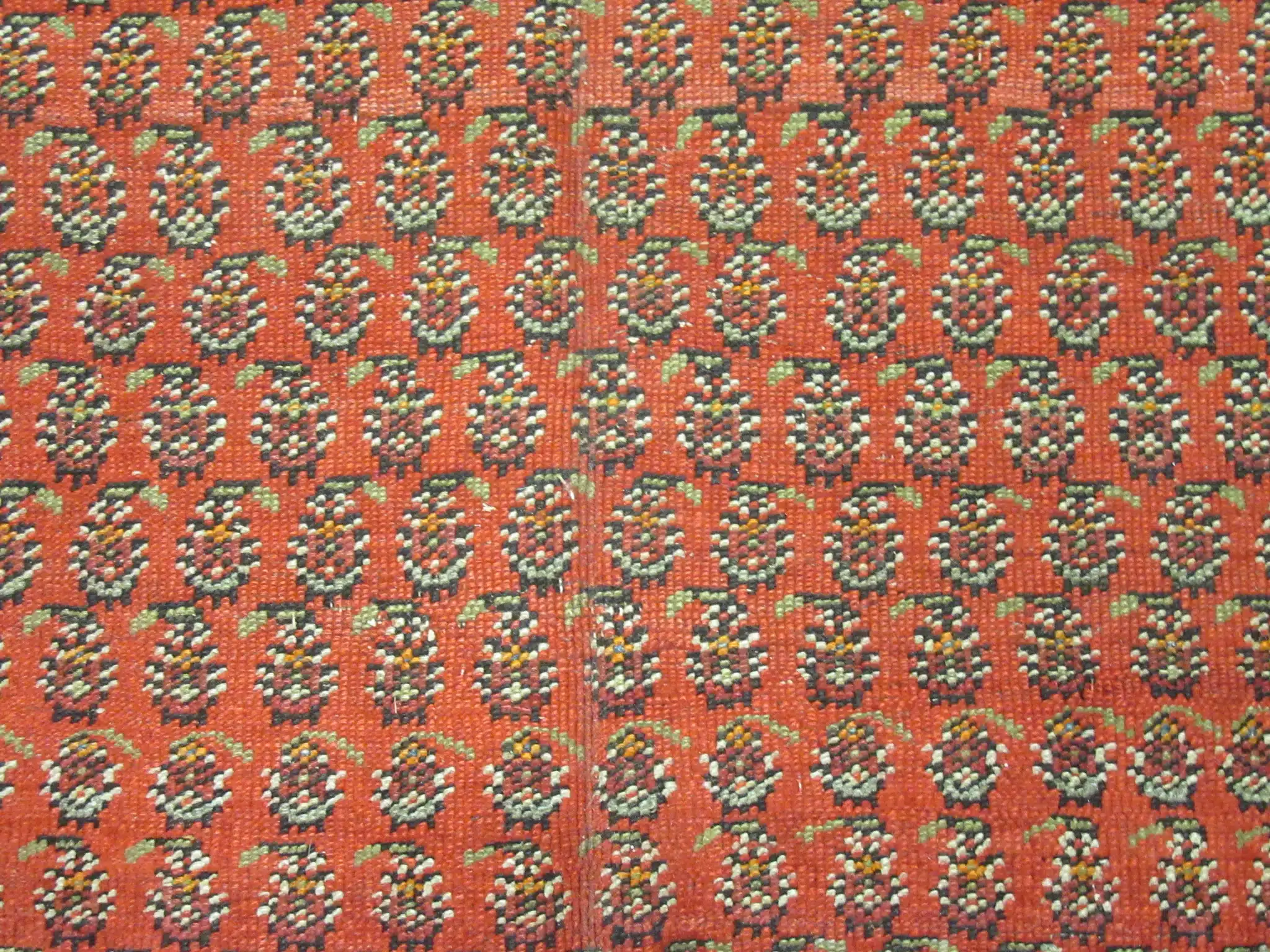 The warm brick red background is enriched by subtle accents of indigo blue, ivory, and muted teal, all derived from natural dyes that have softened gracefully with age. The surrounding borders frame the composition with complementary geometric and floral elements, enhancing the rug’s structure and visual depth.