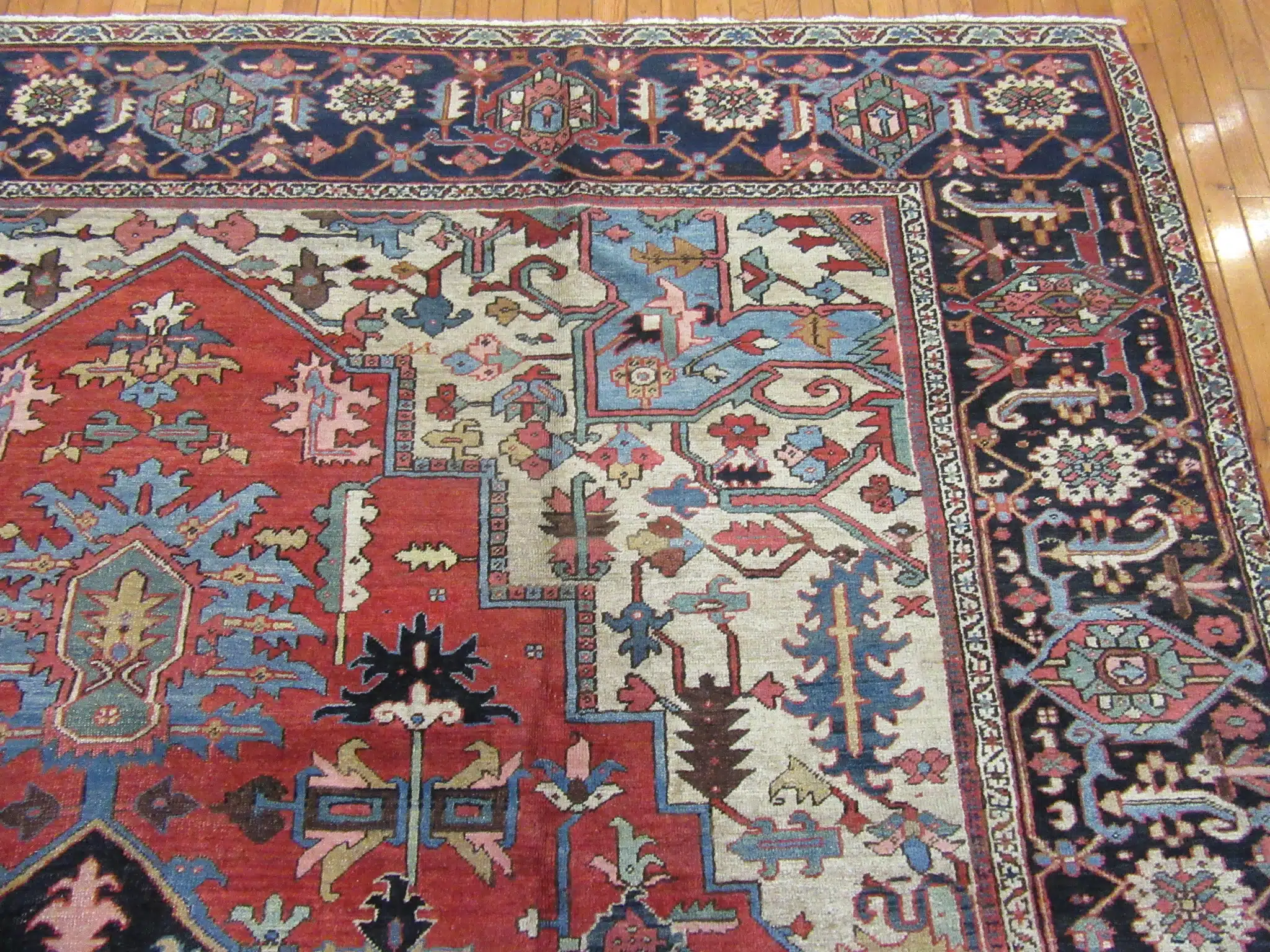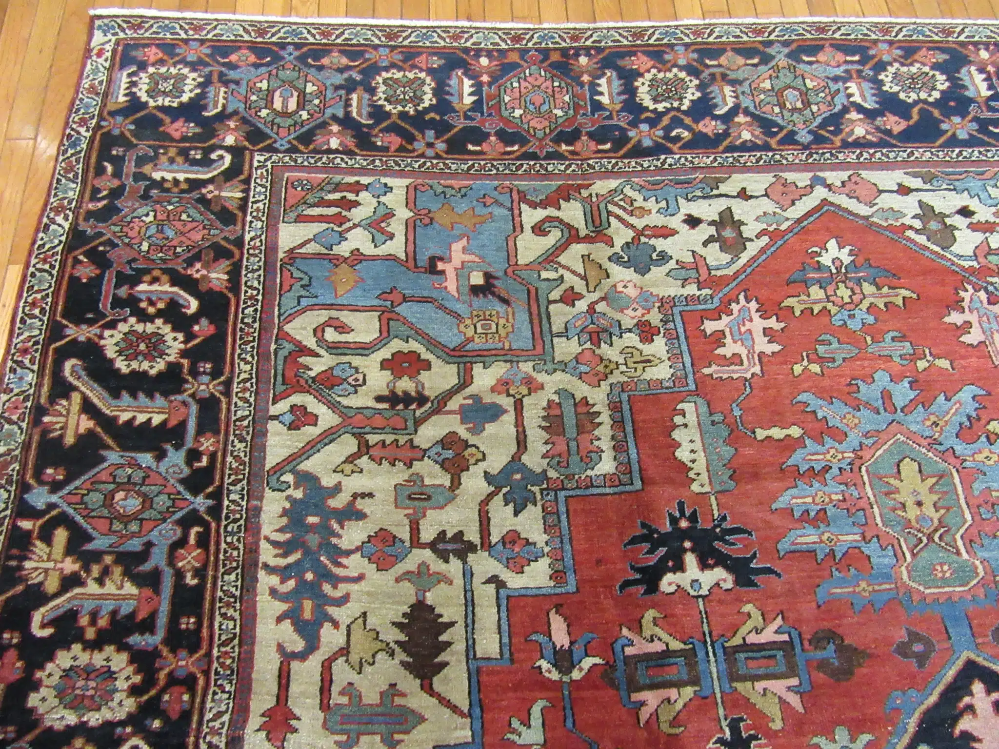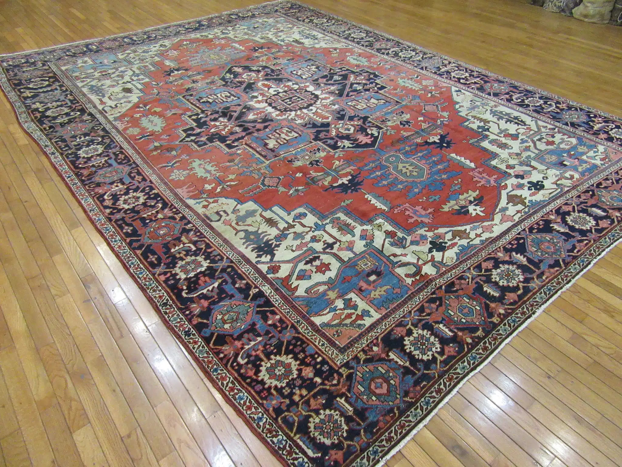 Serapi rugs, produced in the Heriz district of northwest Persia, are renowned for their large formats, strong geometric designs, and exceptional durability. Woven during the late 19th to early 20th century, these pieces used thick wool and natural dyes to create rugs that develop a warm, lived-in glow over time. This example showcases the classic oversized medallion and corner elements that make Serapi rugs highly sought after for their timeless strength and presence.