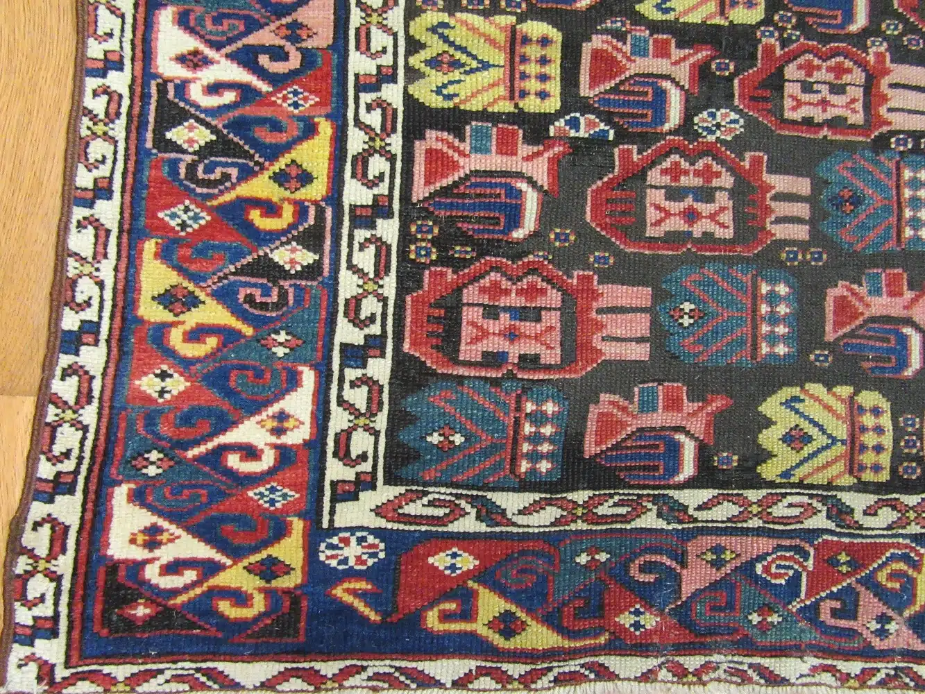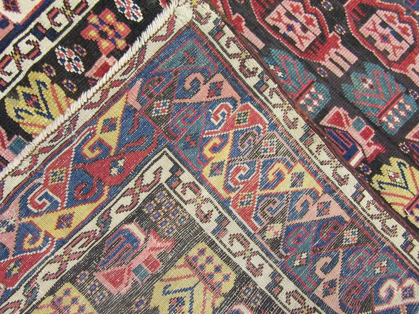 The deep navy field provides a strong visual foundation, allowing the colorful geometric elements to stand out while maintaining a cohesive and balanced appearance. The surrounding borders are finely articulated with traditional Caucasian motifs, adding definition and visual movement along the length of the runner.