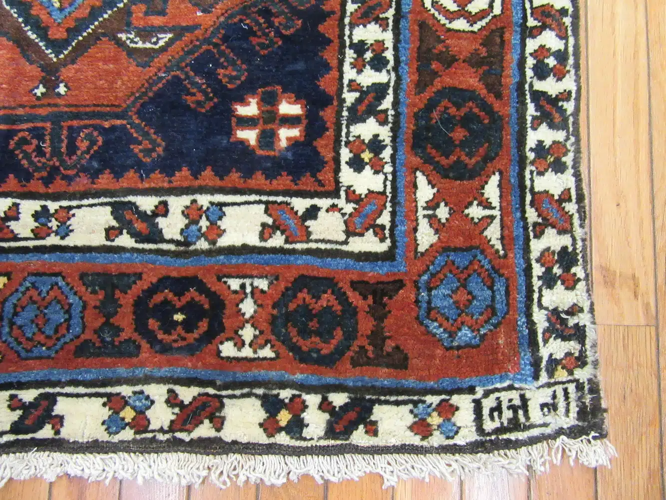 The deep navy field creates a dramatic backdrop for the warm rust and earthy tones, while accents of ivory and soft blue add contrast and definition to the tribal motifs. The angular patterns and symbolic forms reflect the strong nomadic weaving traditions of Persia, where design language often carried cultural and protective meaning.
