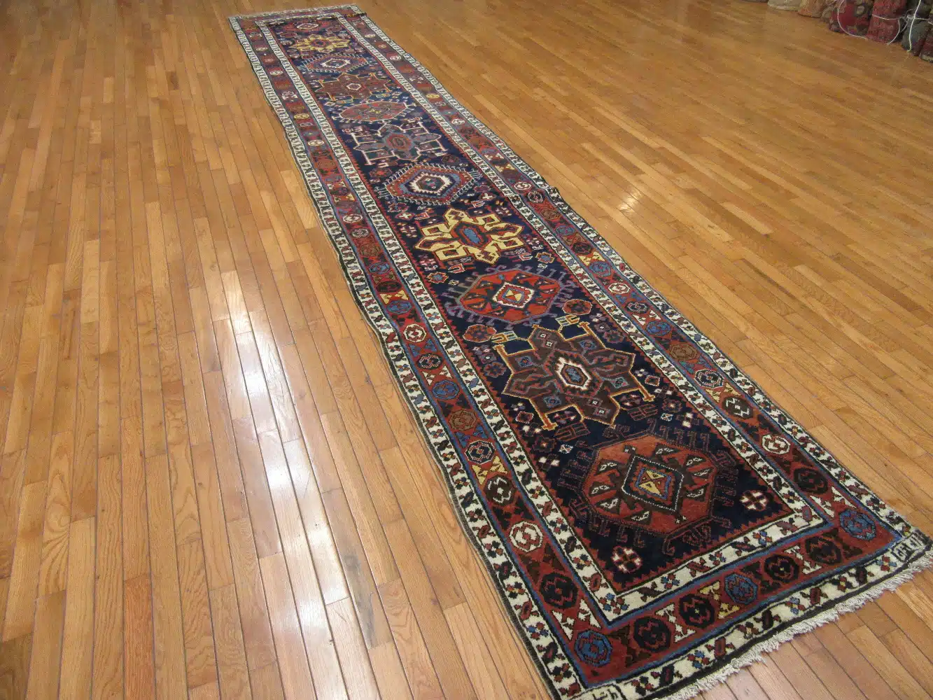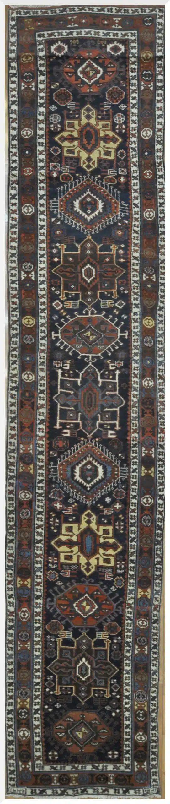 This long Persian tribal runner showcases a bold and rhythmic composition built around stacked geometric medallions framed by richly decorated guard borders. The elongated format emphasizes movement and symmetry, making the design feel dynamic while remaining grounded and balanced.