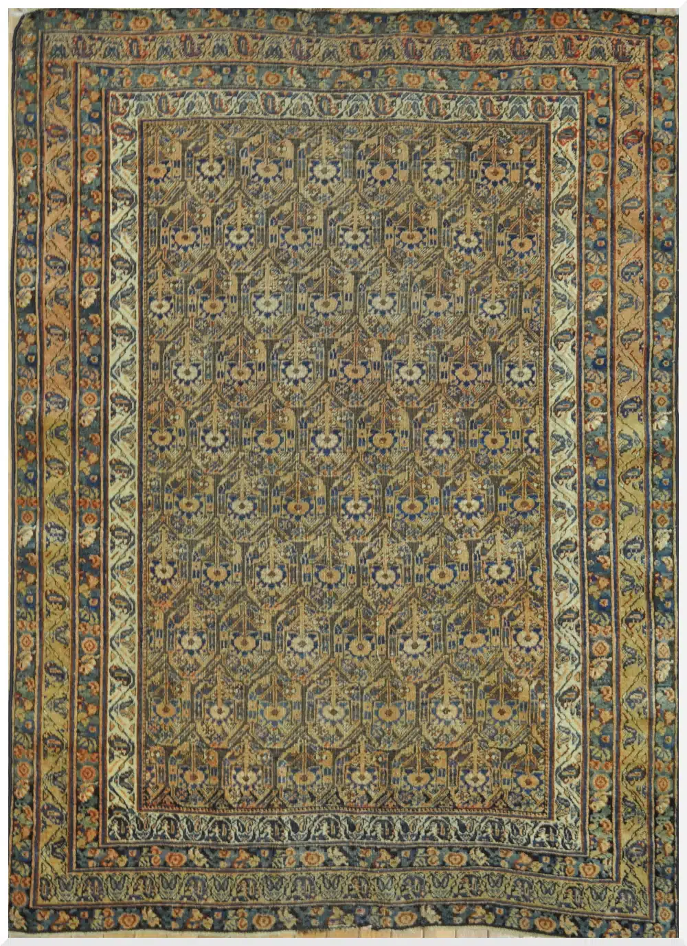 An antique Persian rug with a classic allover design on a rich blue field. Its balanced pattern and timeless colors make it a versatile piece for refined interiors. Read the full description to discover its craftsmanship and history.