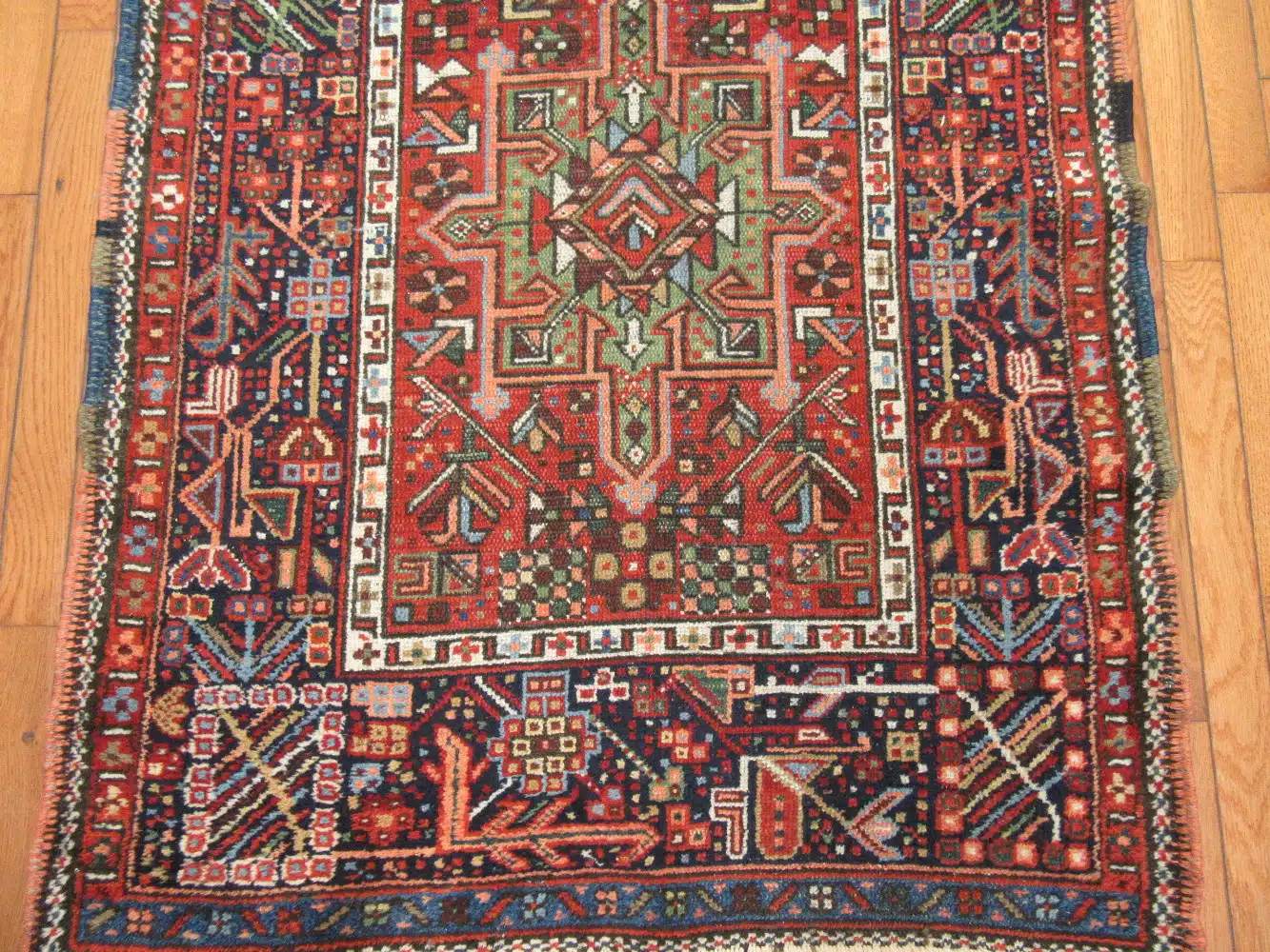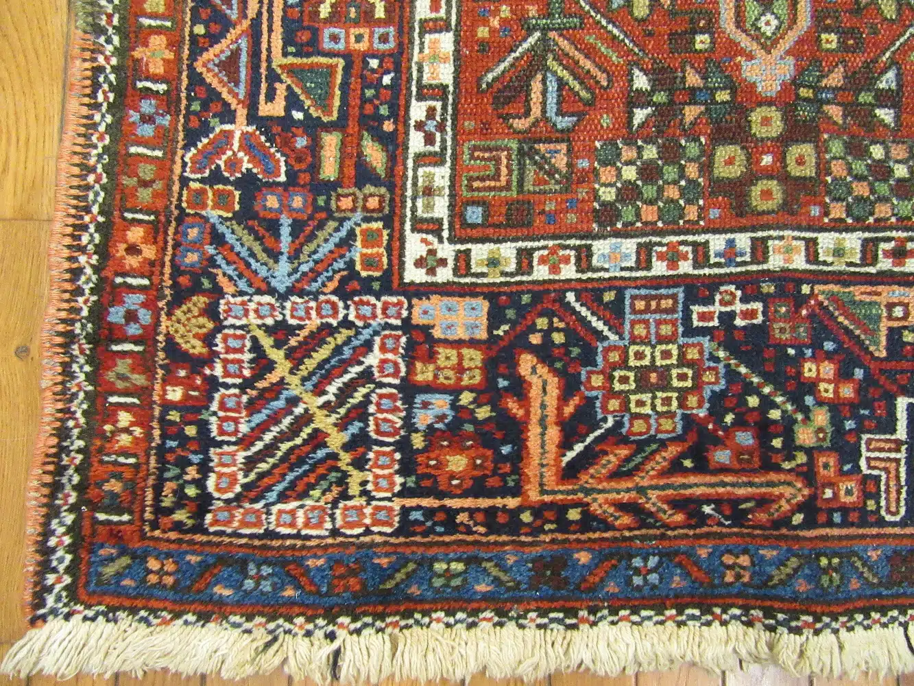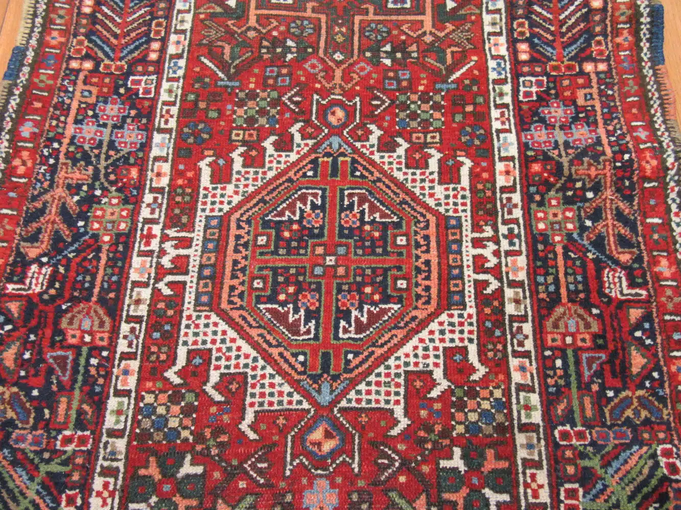 The rich brick red field provides a dramatic backdrop for contrasting navy blue, ivory, and teal elements. These bold colors, derived from natural dyes, have aged beautifully over time, giving the rug depth, warmth, and an authentic antique presence.