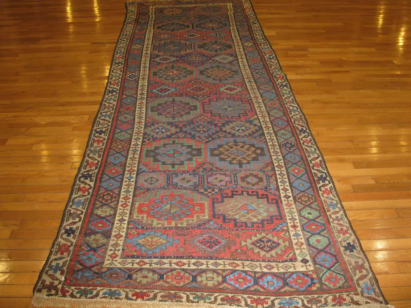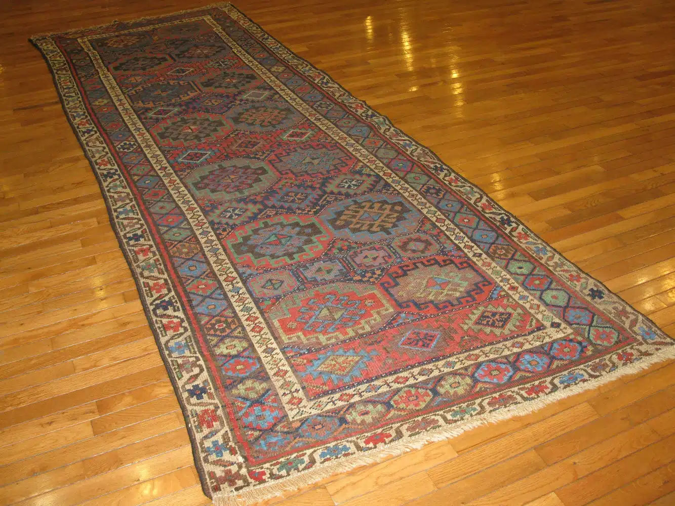 With its long runner proportions, this rug is ideally suited for hallways, entryways, kitchens, or narrow living spaces where a strong statement and authentic craftsmanship are desired. A genuine antique Persian Kurdish rug that offers history, character, and timeless tribal design.