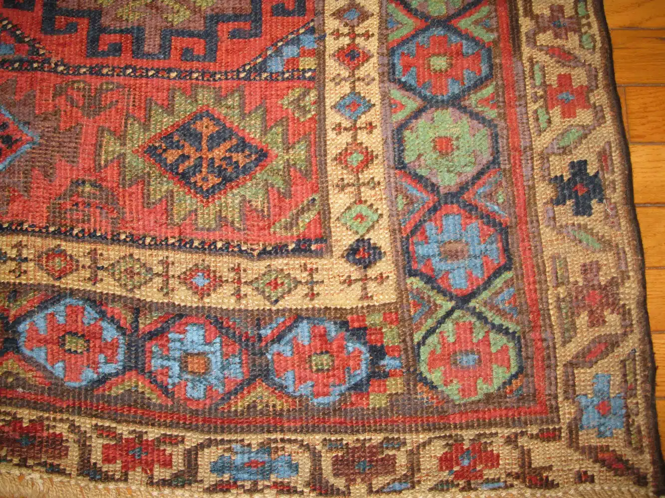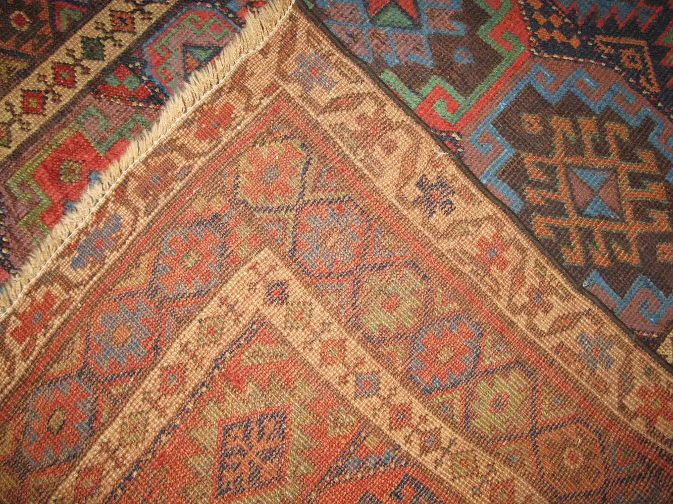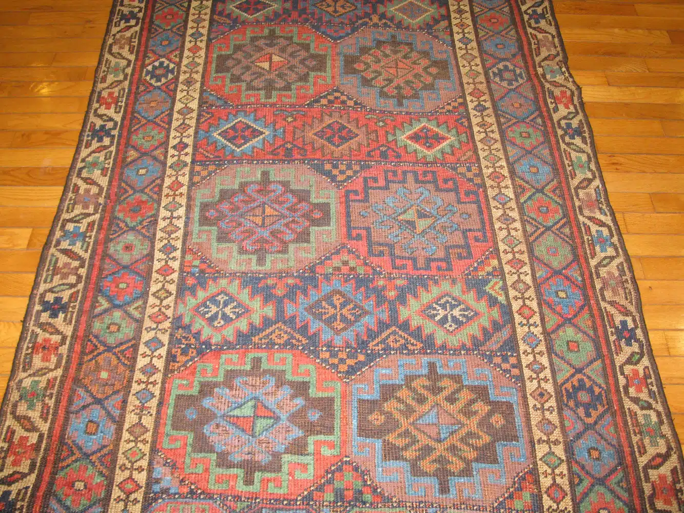 Naturally aged dyes have softened beautifully over time, giving the rug a warm, earthy patina without losing its clarity or character. The wool pile remains resilient, enhancing both the texture and longevity of the piece.