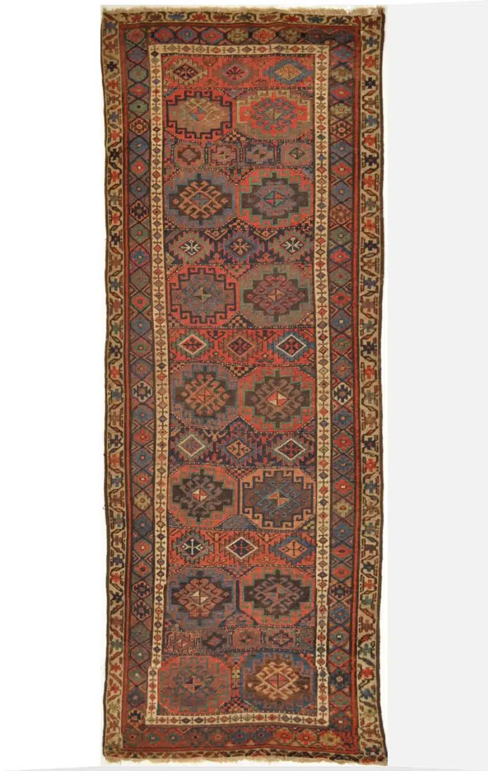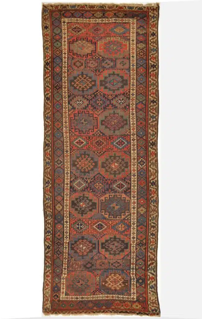 This antique Persian Kurdish runner showcases a striking vertical arrangement of bold geometric medallions set against a warm brick red field, framed by intricately patterned tribal borders. The strong linear composition and rhythmic repetition of motifs reflect the authentic nomadic weaving traditions of the Kurdish regions of western Iran.