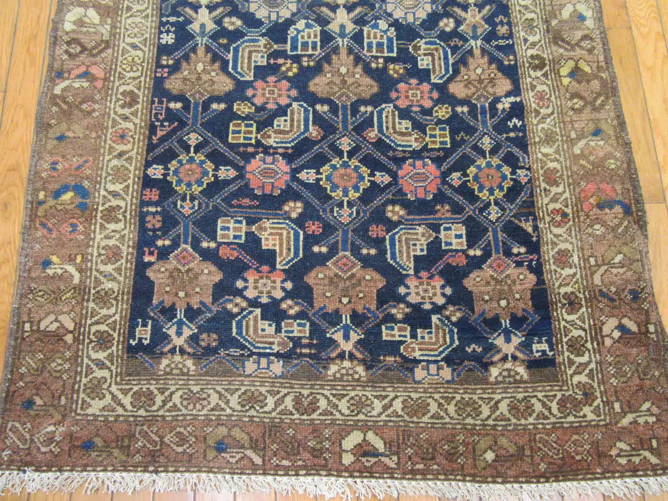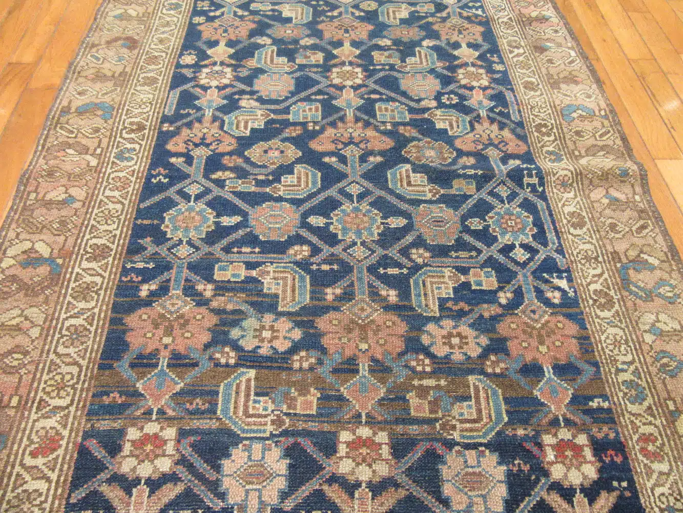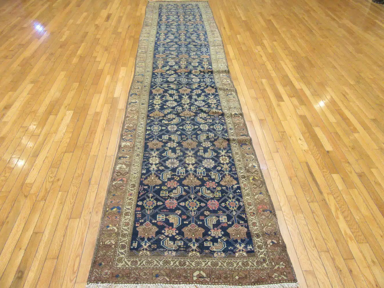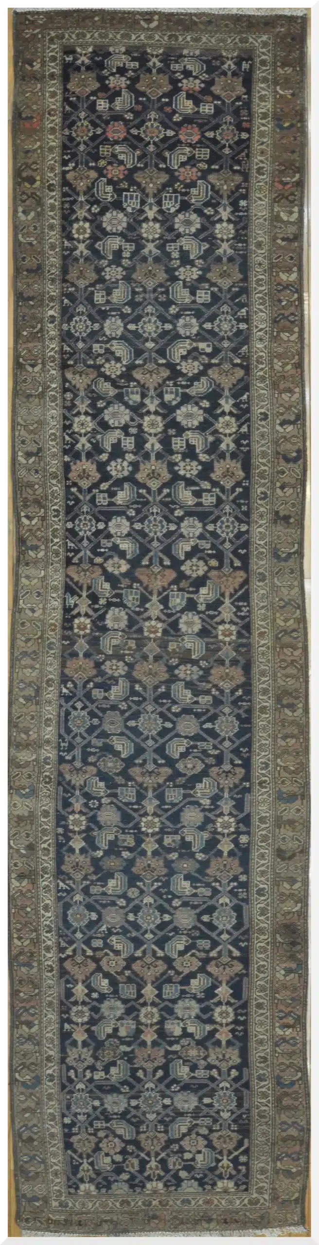 Its antique character, harmonious color palette, and classic Persian village design make this Malayer runner a refined and collectible addition to any interior.