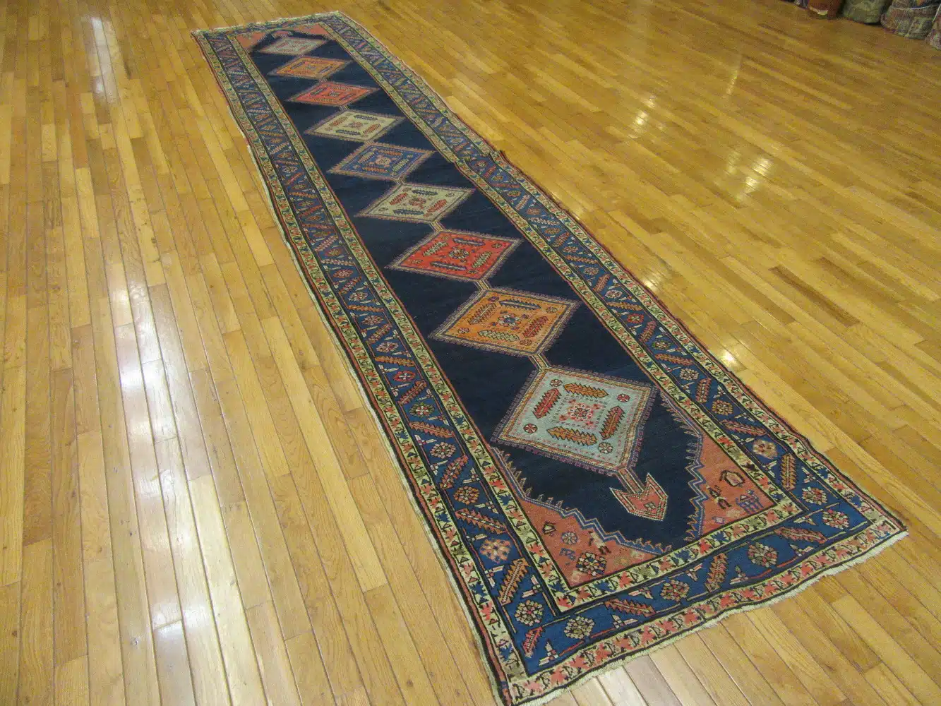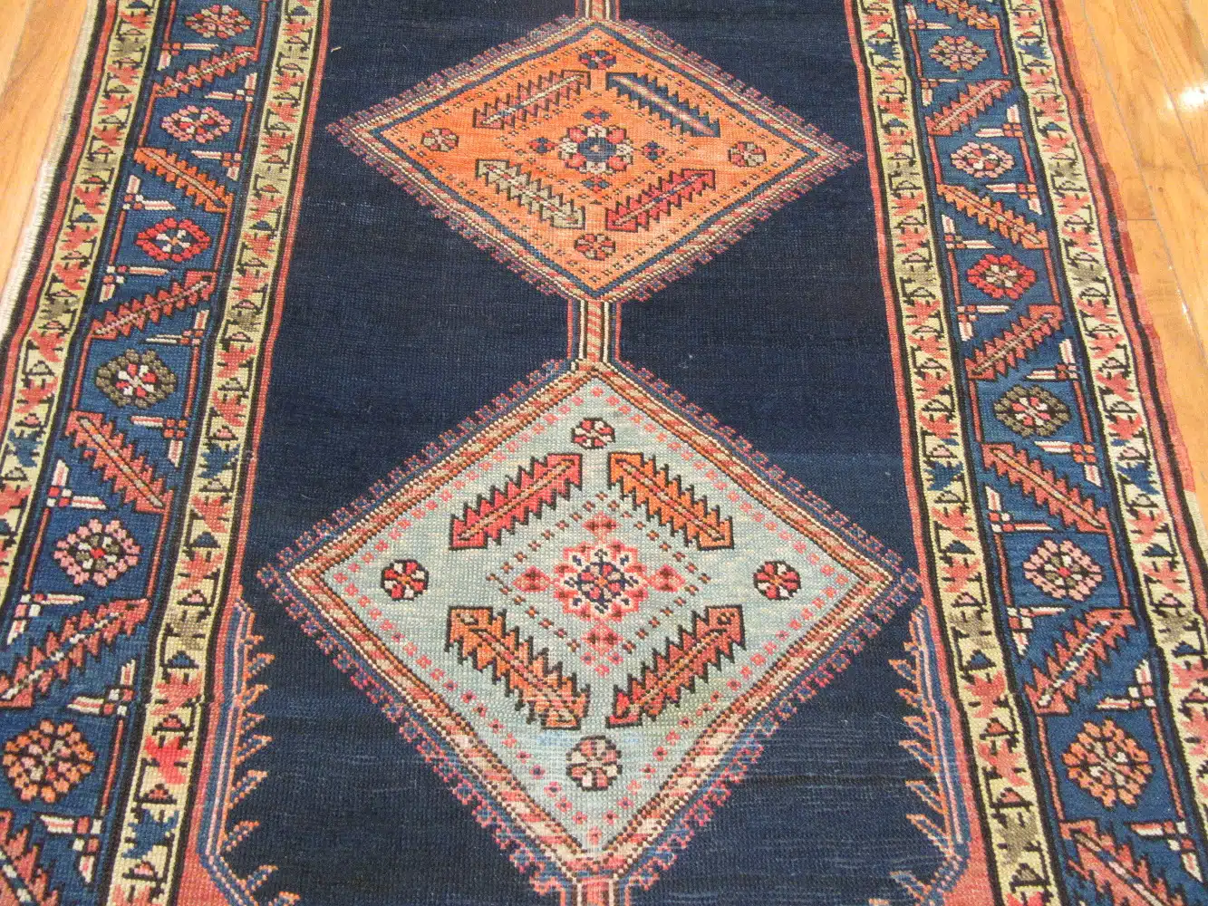 This runner fits well in hallways, long entryways, or beside furniture in narrow rooms, adding bold pattern and warmth to the space. The deep navy with warm orange accents complements wood floors and traditional or rustic interiors. Its sturdy wool build handles regular traffic while the antique colors soften nicely over time.