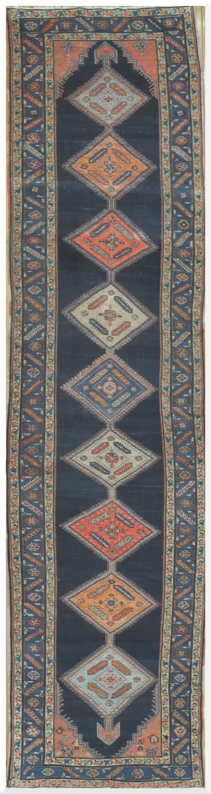 This antique Caucasian tribal runner displays two large stacked diamond medallions in bright terracotta-orange with intricate geometric centers and sharp hooked edges on a rich navy background. The medallions connect through smaller tribal symbols, forming a clean vertical pattern that suits narrow spaces. Wide borders contain repeating diamond chains, zigzag lines, and stylized floral guards in orange, blue, and ivory, creating a balanced and strong tribal appearance.