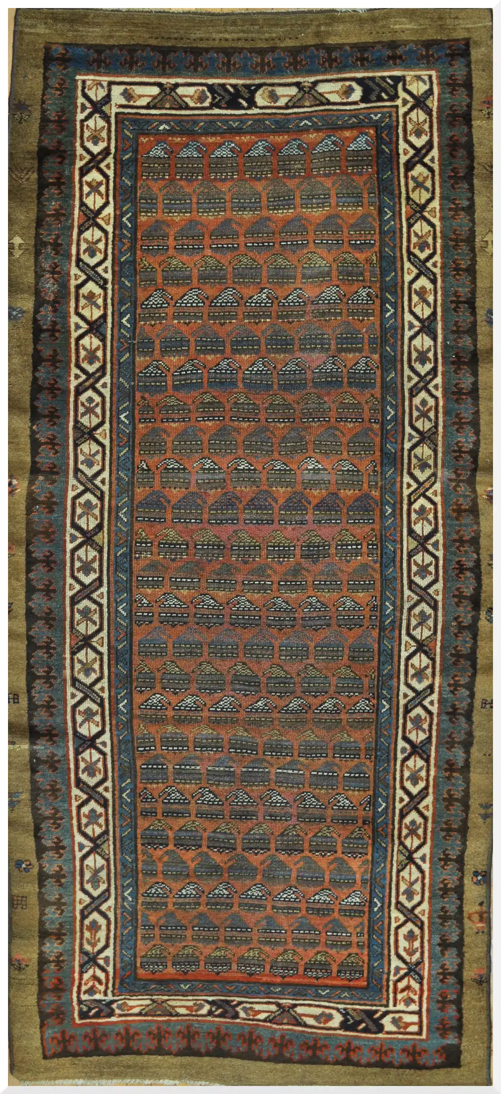 This antique Persian runner showcases a refined repeating lattice and boteh-inspired motif arranged in precise horizontal rows, a design language often associated with village and tribal weaving traditions. The elongated format emphasizes rhythm and symmetry, making it especially well-suited for hallways and narrow spaces.