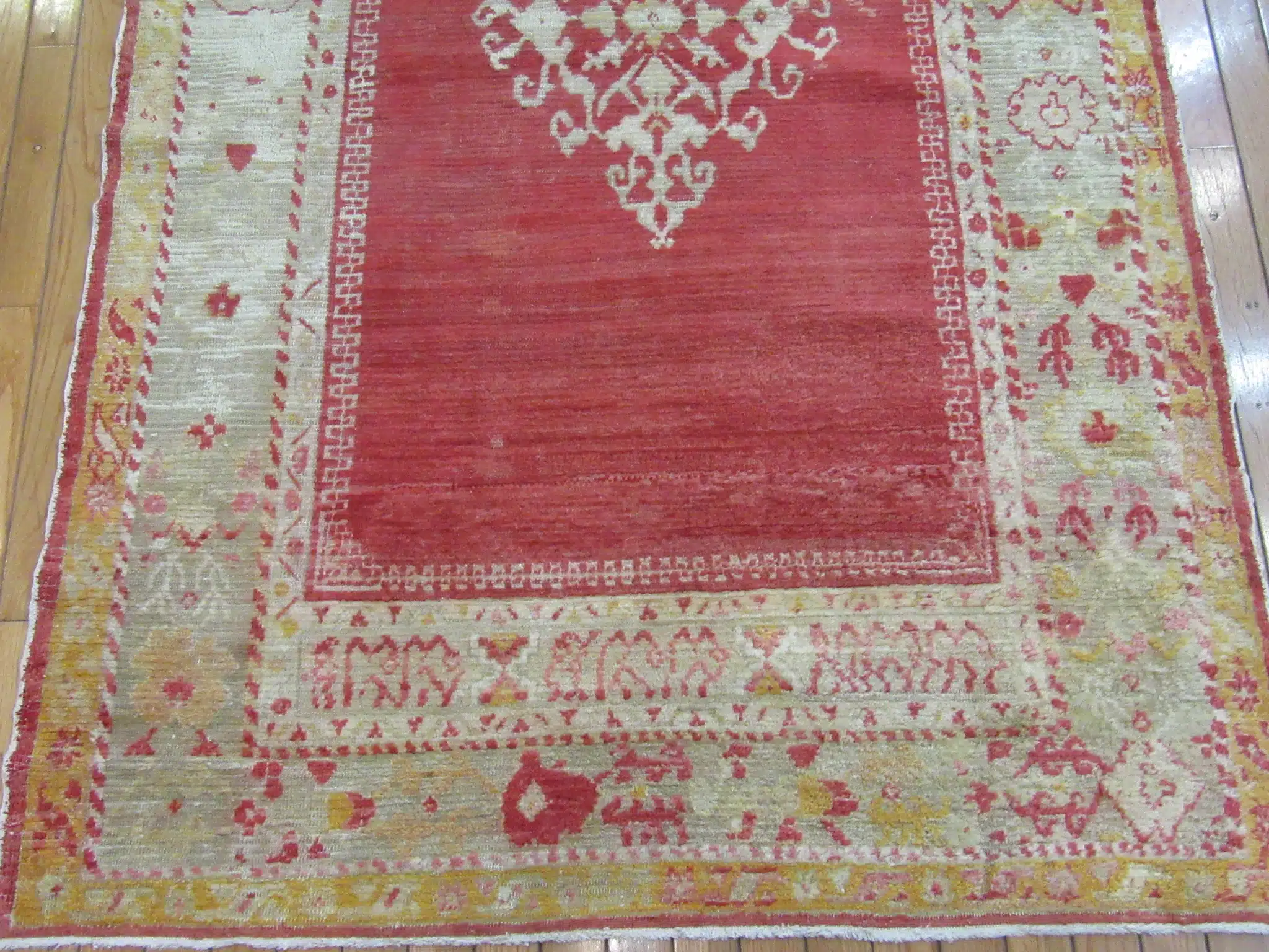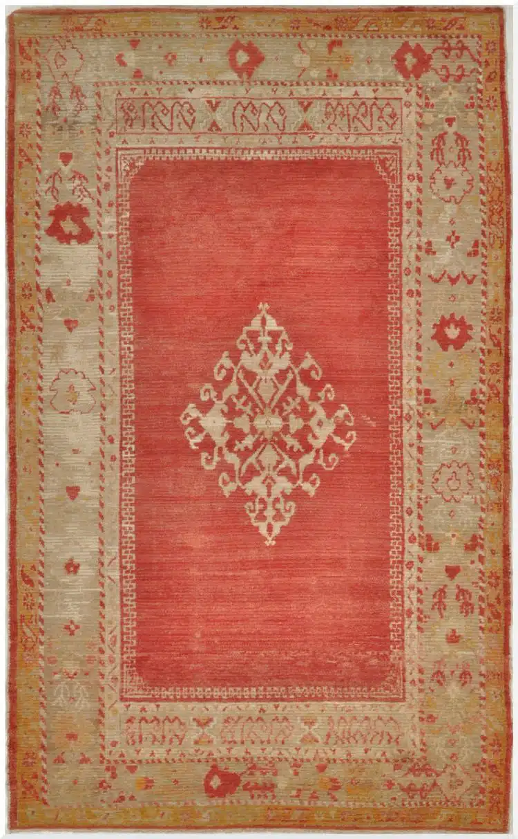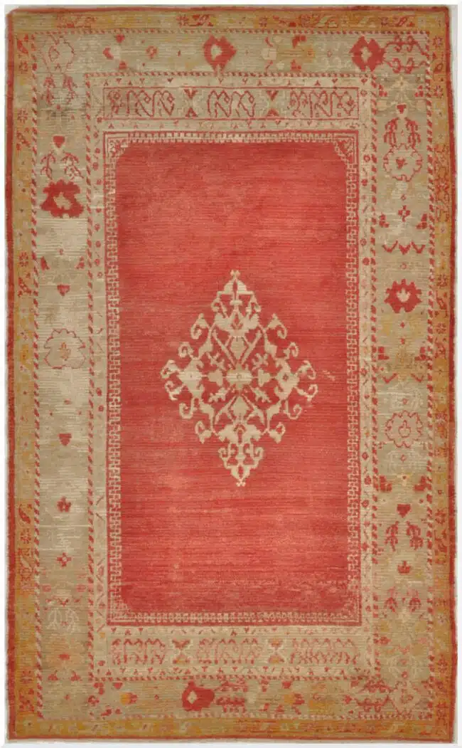 This antique Turkish Angora Oushak rug features a beautifully restrained central medallion design set against a softly aged red field. The composition is minimal yet elegant, allowing the craftsmanship and materials to take center stage rather than relying on dense ornamentation.