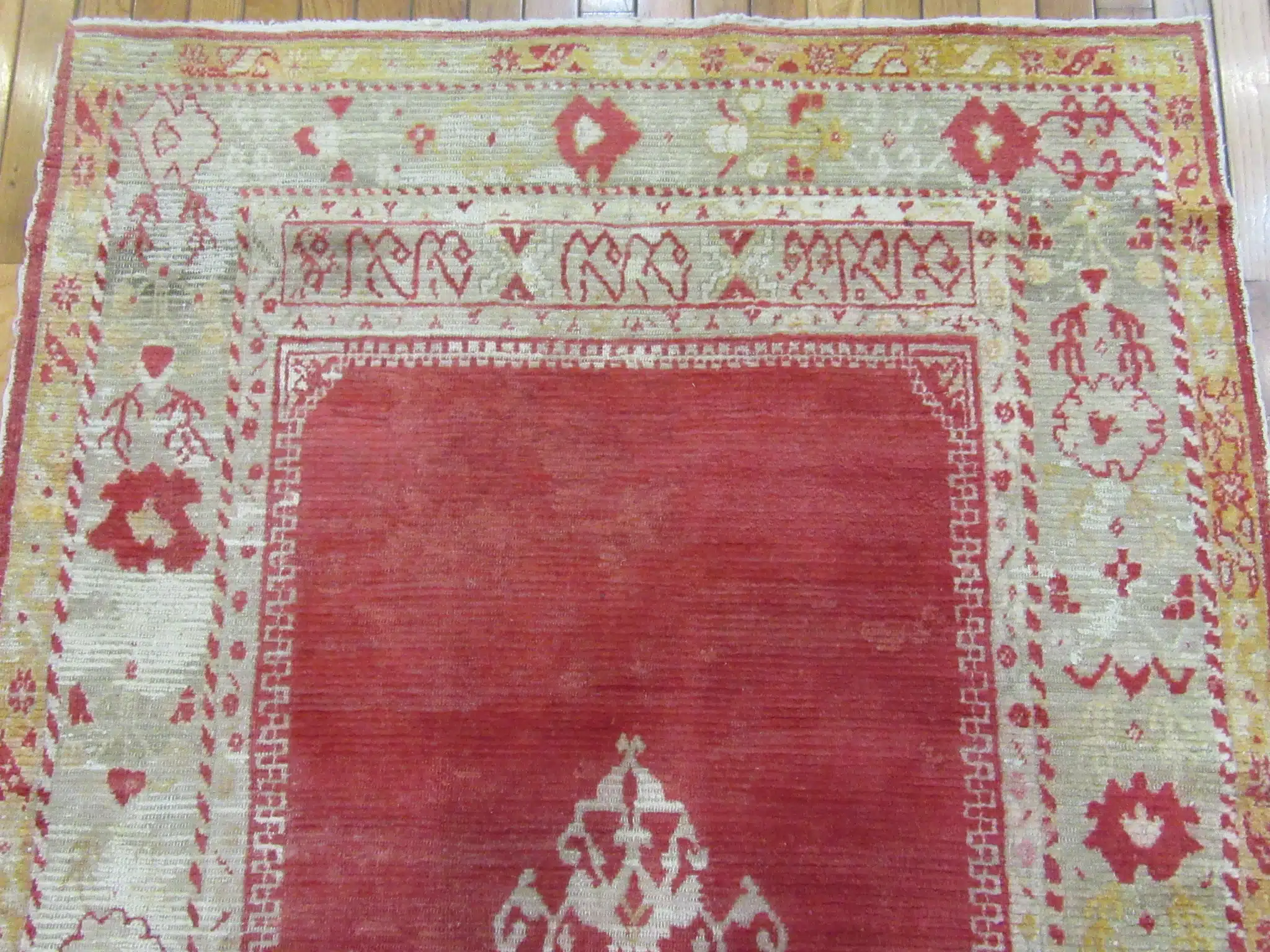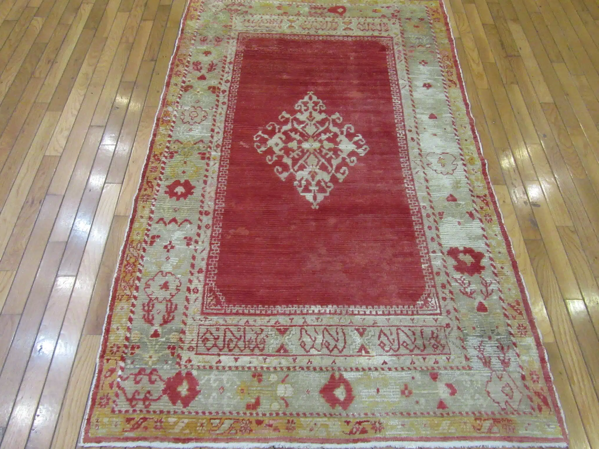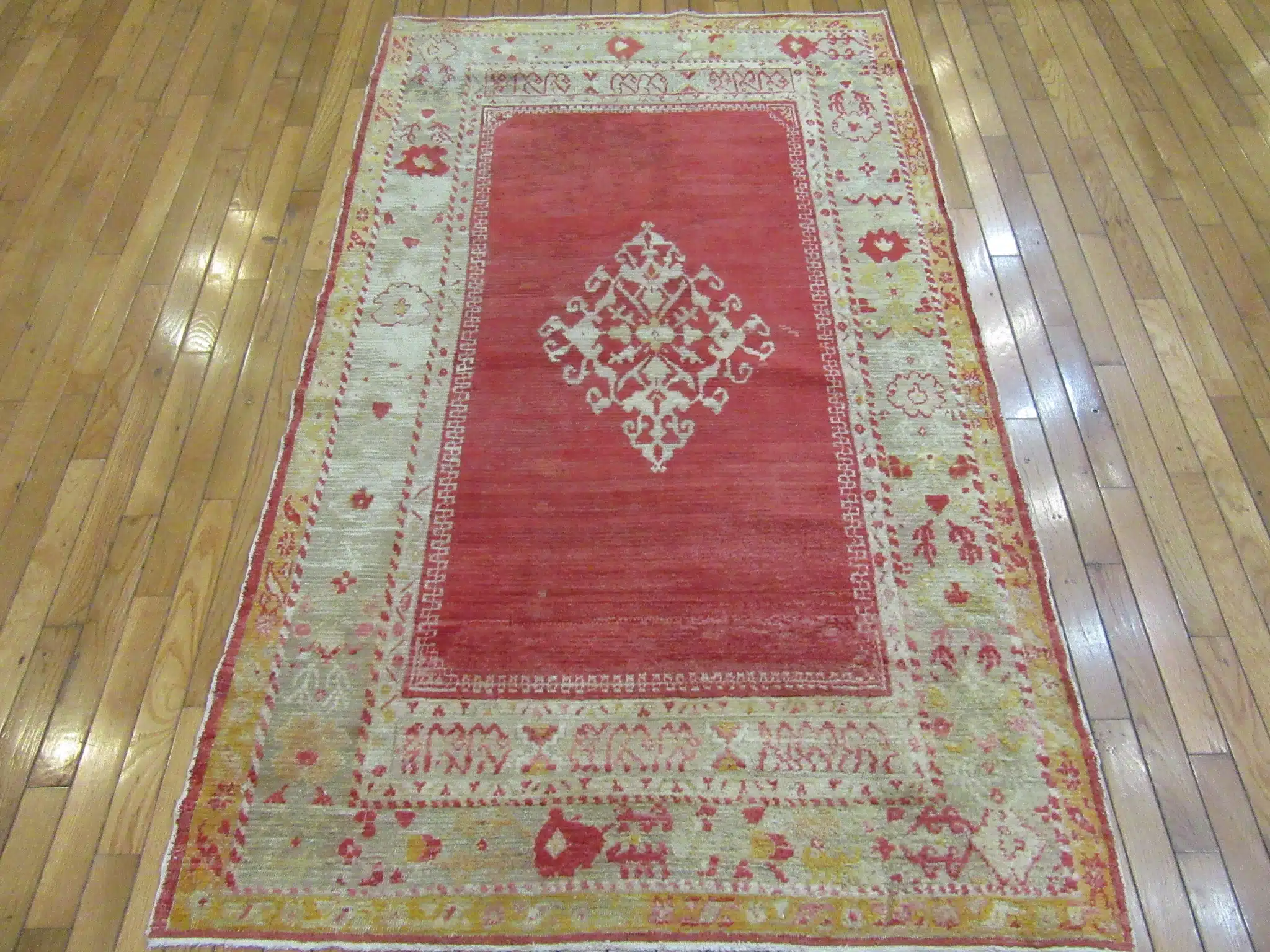 This antique Turkish Angora Oushak rug features a beautifully restrained central medallion design set against a softly aged red field. The composition is minimal yet elegant, allowing the craftsmanship and materials to take center stage rather than relying on dense ornamentation.