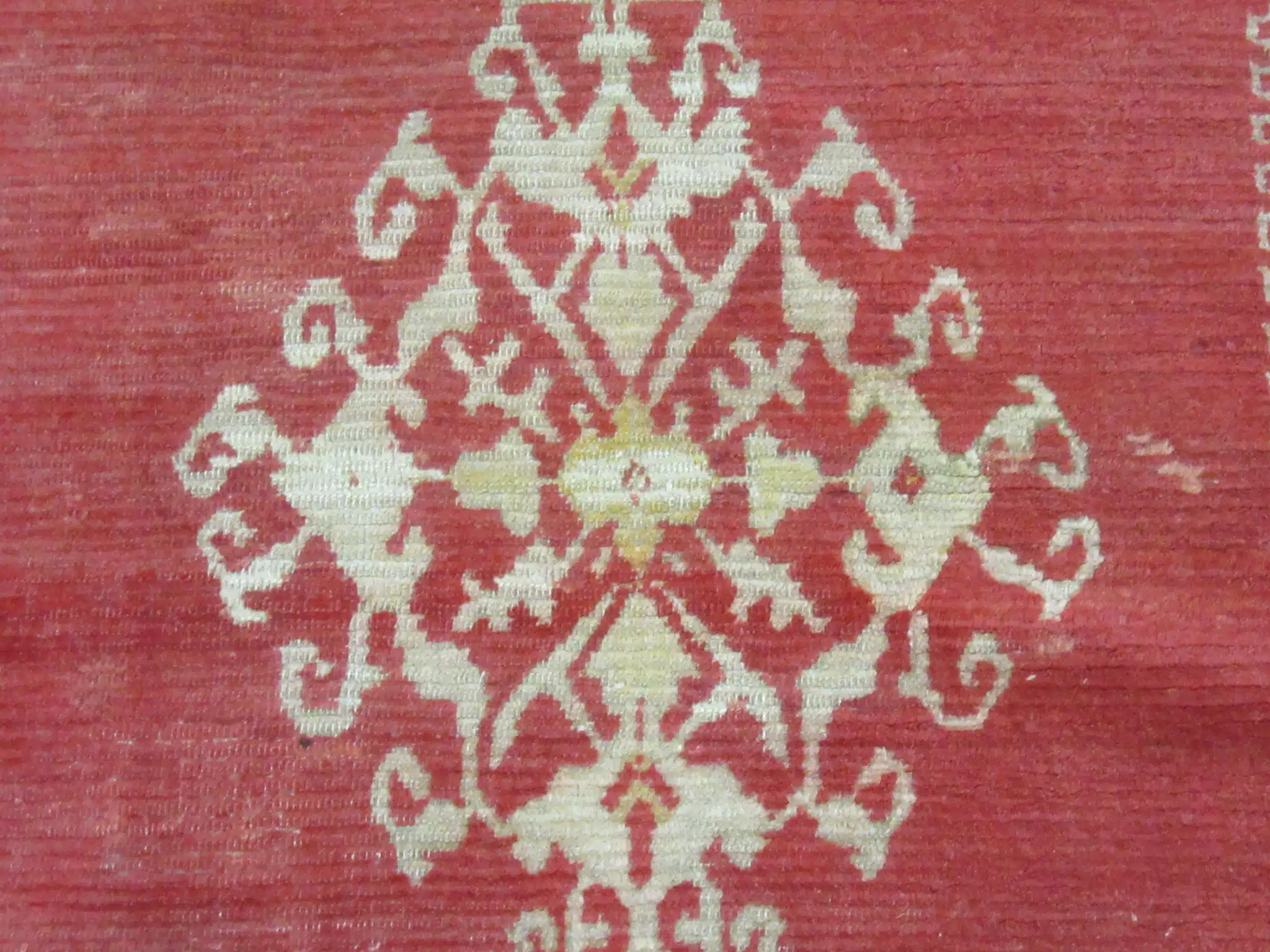 The red ground displays natural abrash, creating depth and warmth, while the ivory medallion and border motifs provide gentle contrast. Subtle touches of pale sage and light gold add refinement without overwhelming the overall softness of the palette.