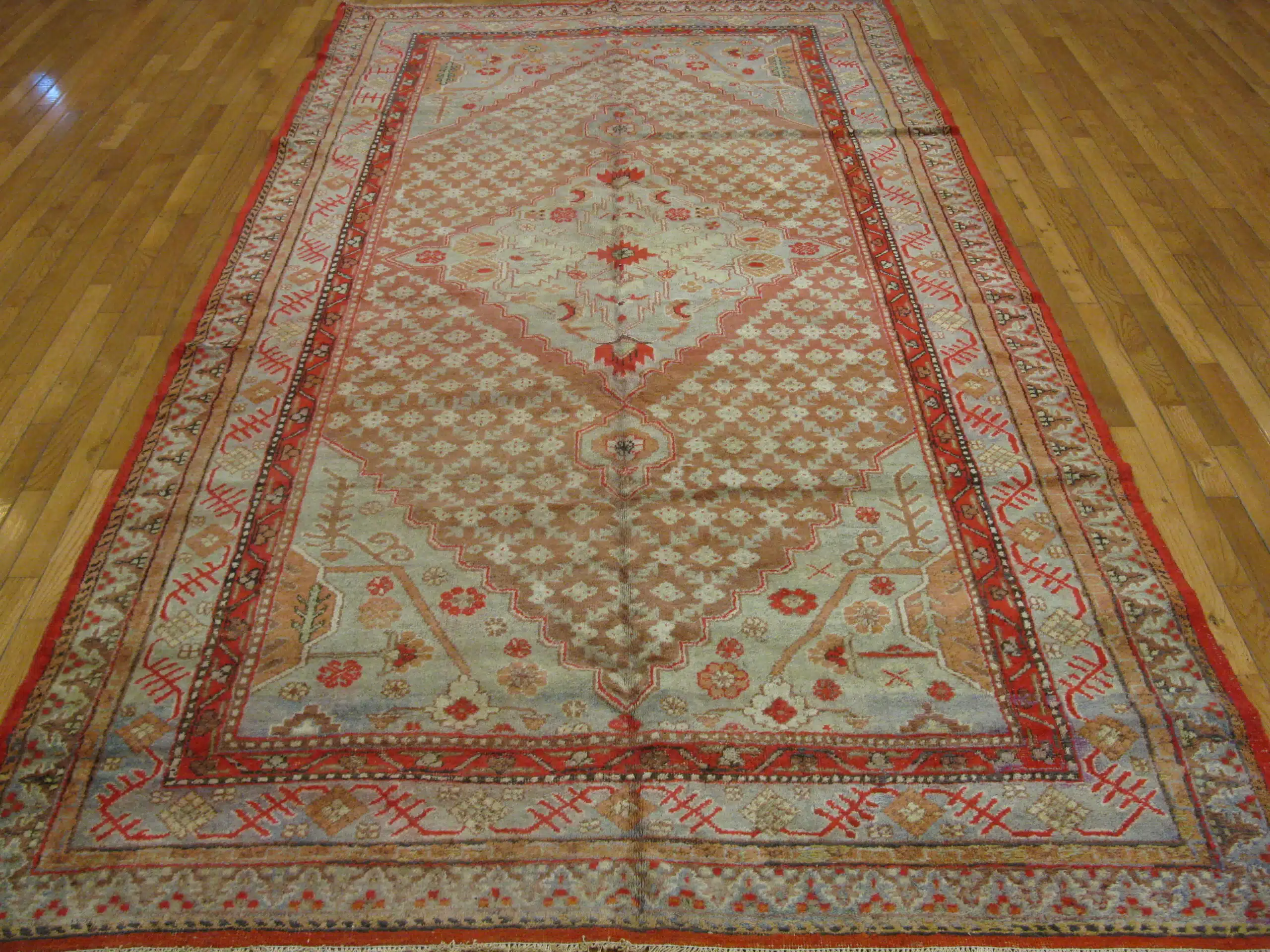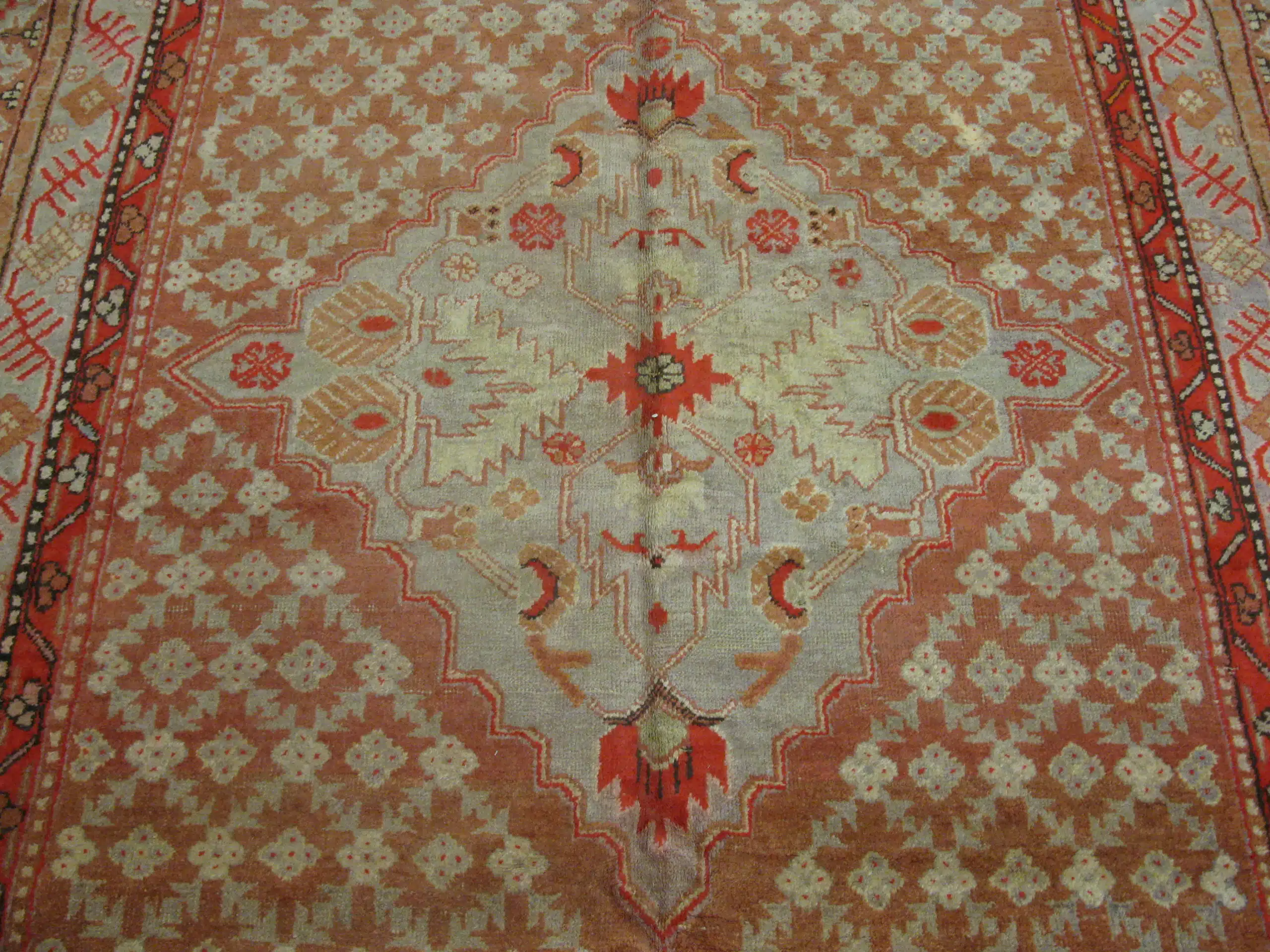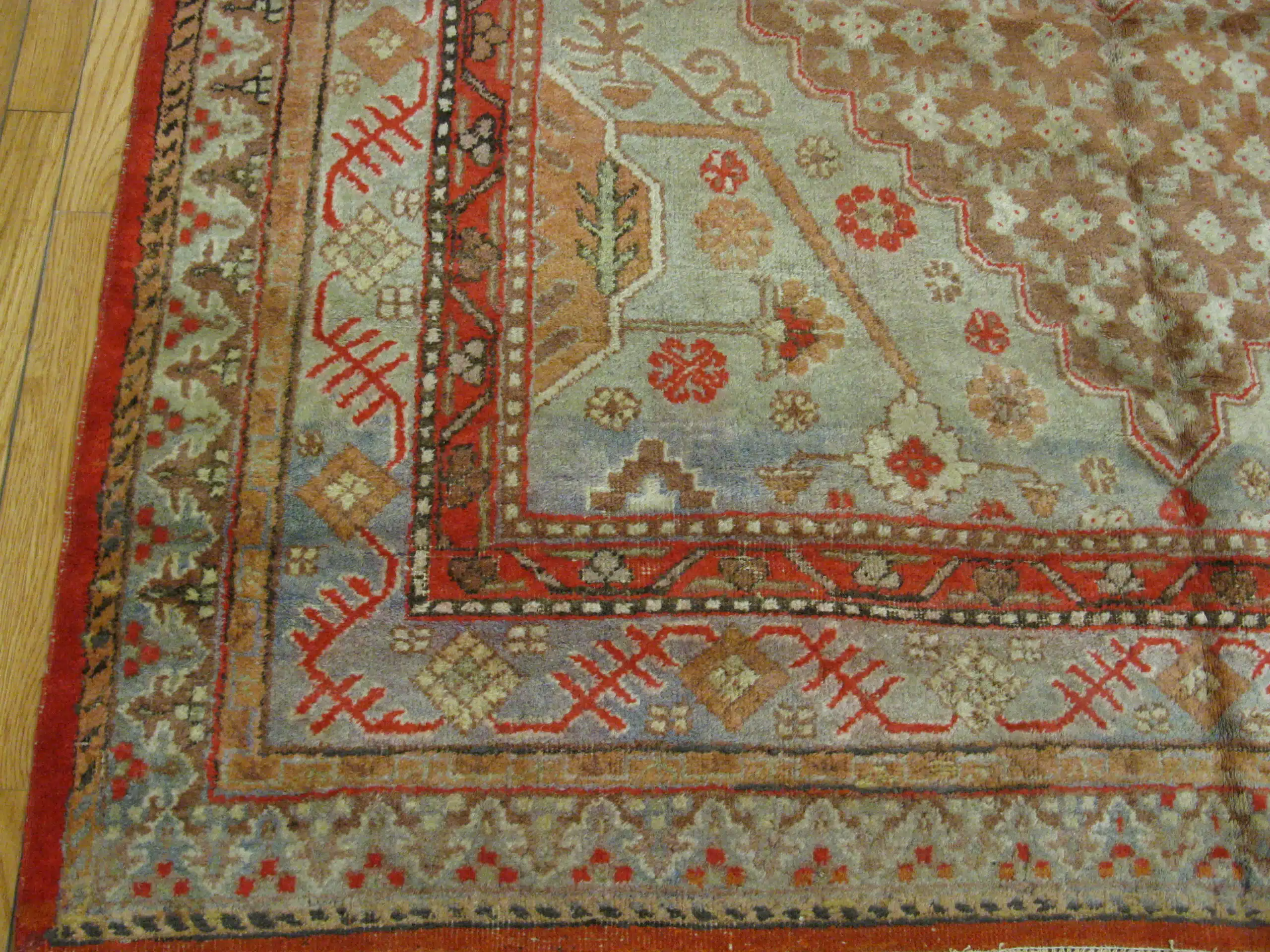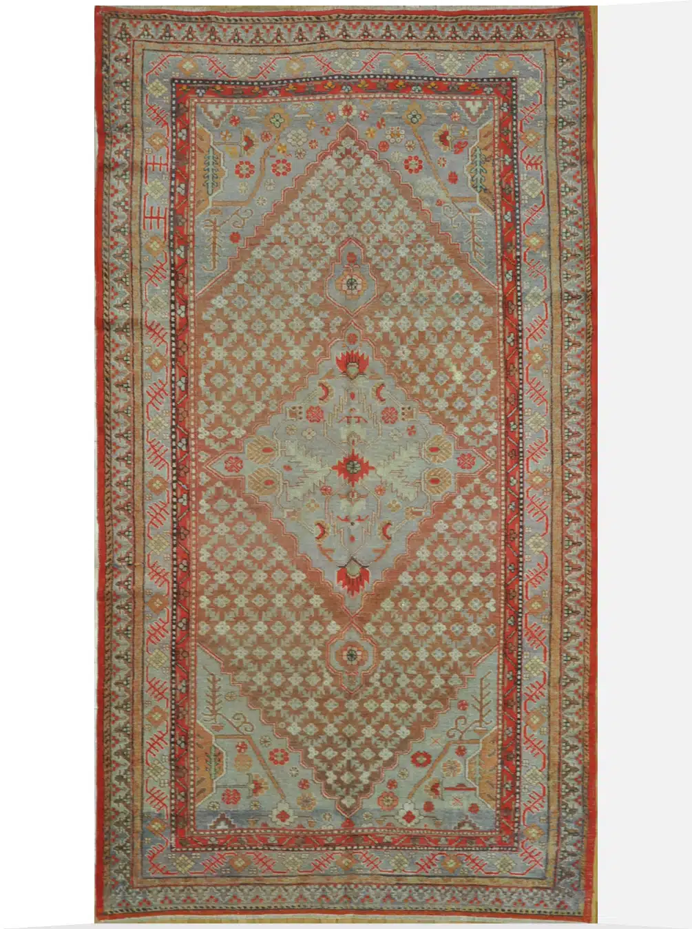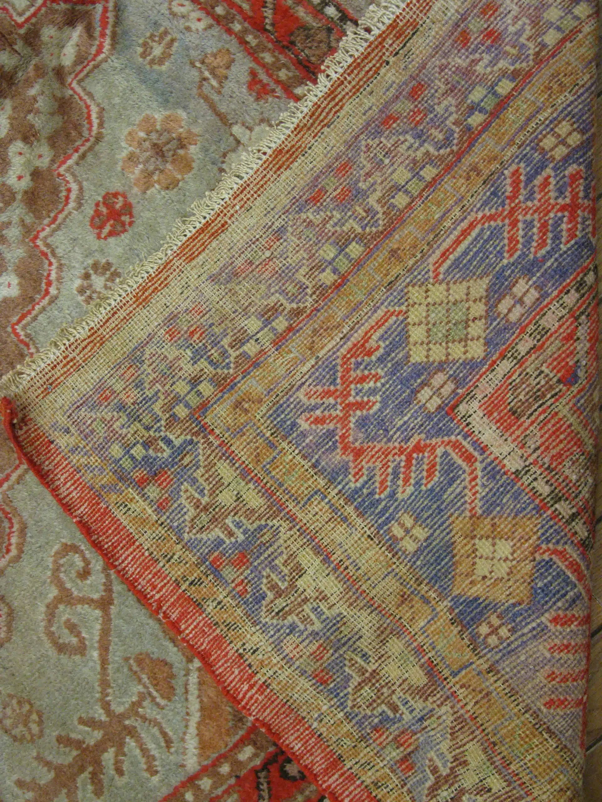 This antique Khotan gallery rug presents a refined and harmonious composition, centered around a diamond medallion set within a delicately patterned field. The design reflects the classical aesthetics of Khotan weaving, known for blending Persian influence with East Asian symmetry and balance.