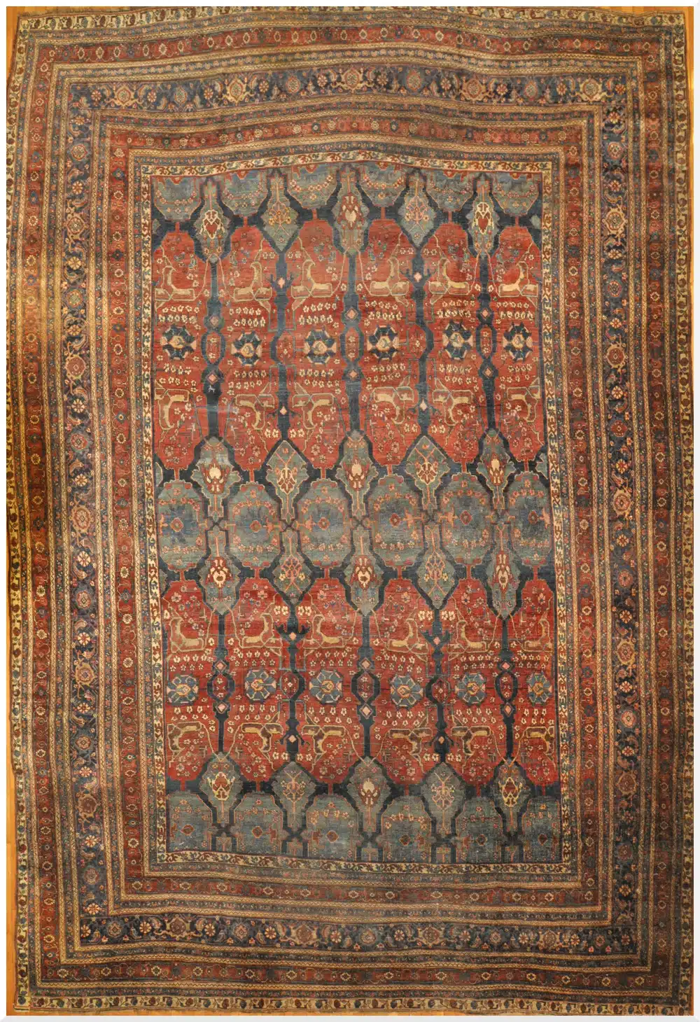 Bidjar rugs from the late 19th century are among the most revered Persian village weavings, known for their exceptional knot density, durability, and artistic all-over designs. Nicknamed “the iron rugs of Persia” due to their stiff, tightly woven construction, these pieces from the Kurdistan region often feature the Herati pattern in varied scales. This large, rare example showcases the peak of Bidjar craftsmanship with its unique all-over pattern, deep colors, and timeless elegance.