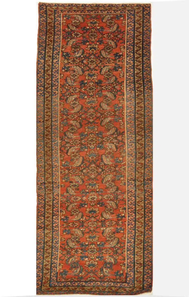 Perfect for long hallways, entryways, or beside a kitchen island, this runner adds vibrant color and traditional character to narrow areas. The terracotta field with cool blue accents complements wood floors and pairs well with rustic, traditional, or eclectic interiors. Its sturdy wool construction handles heavy foot traffic while the antique fading adds authentic depth and warmth.