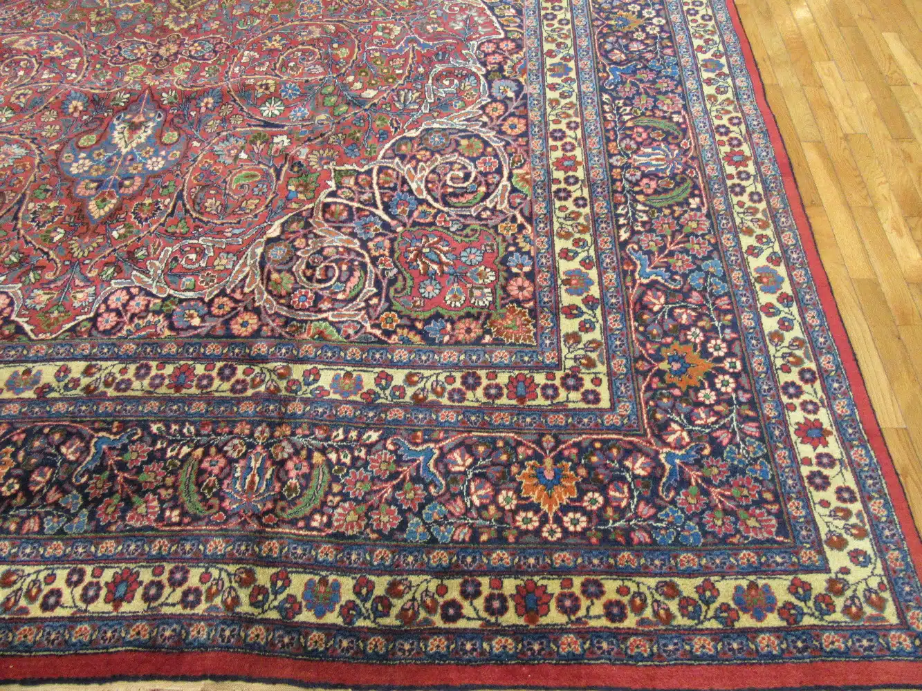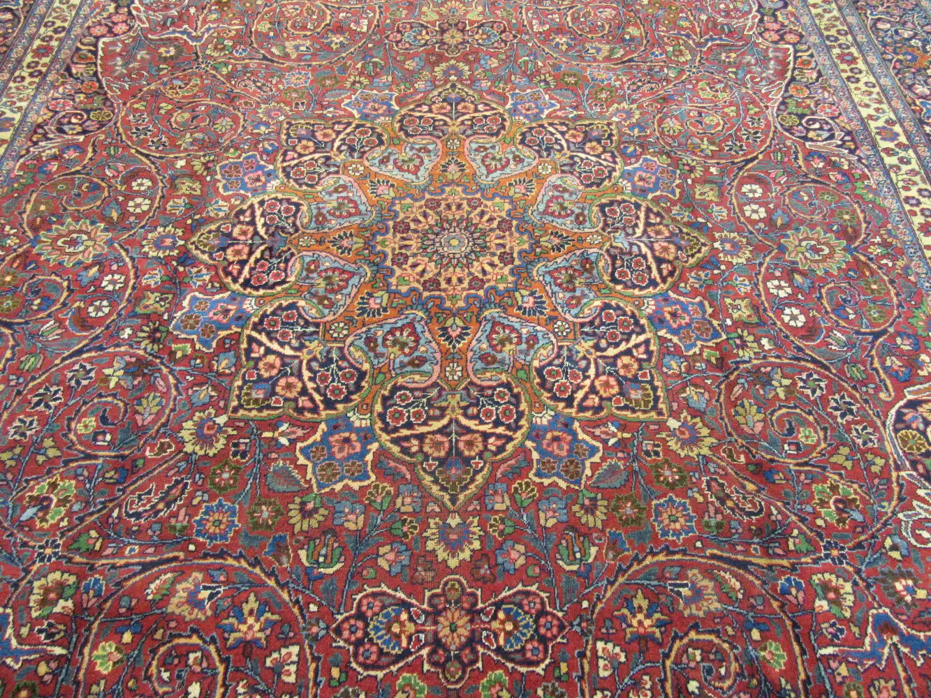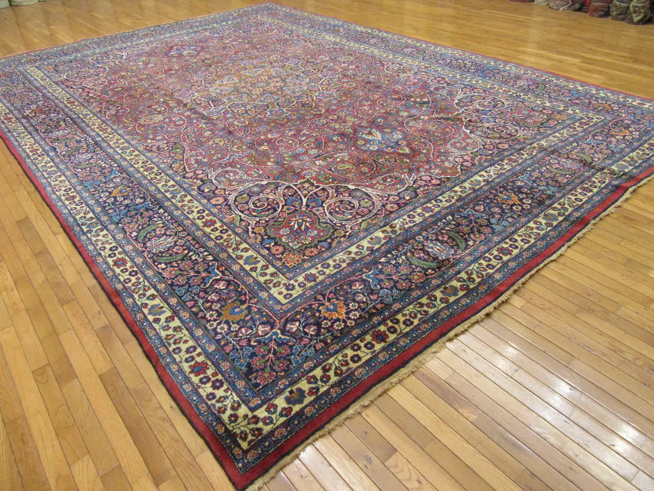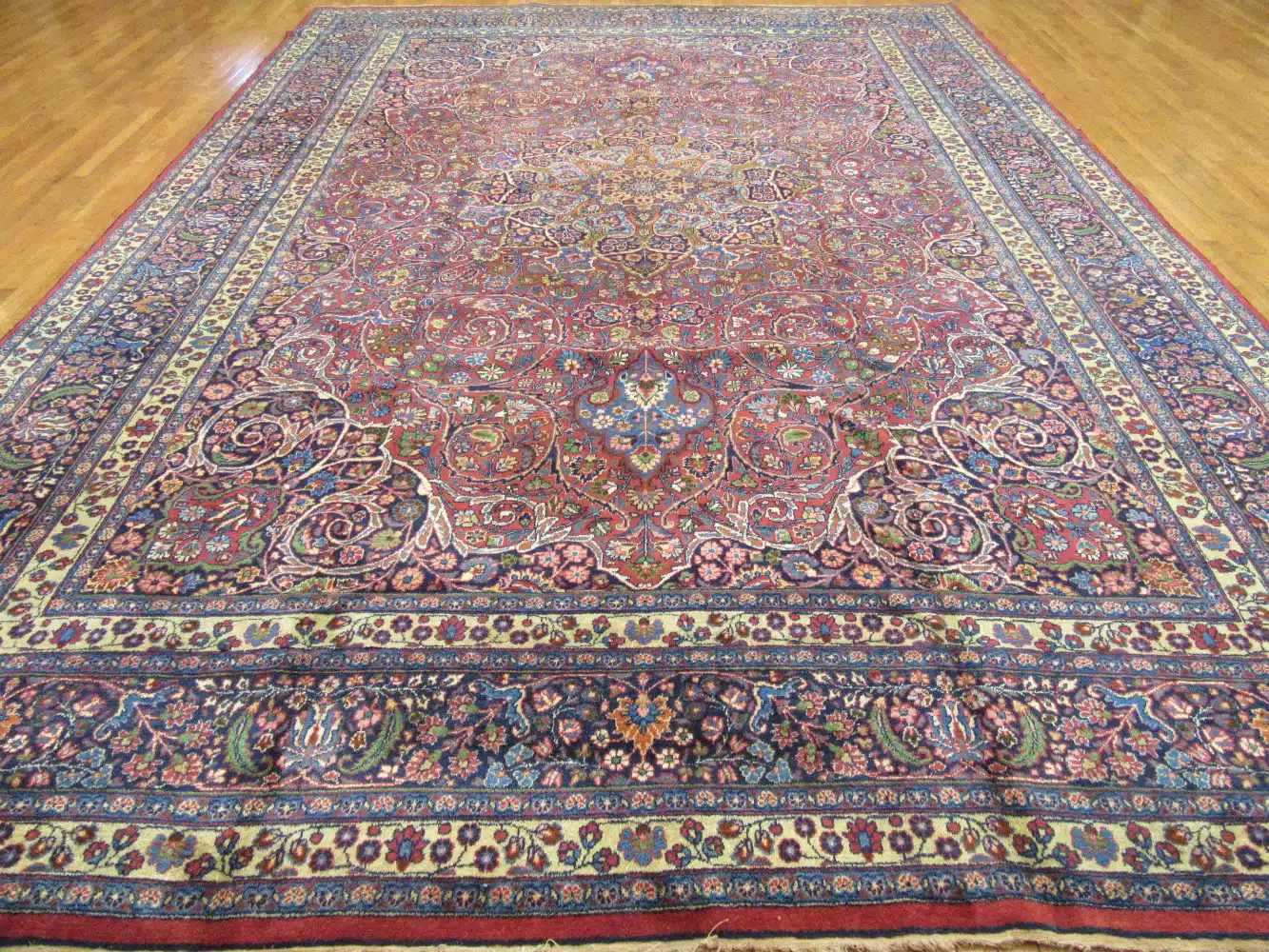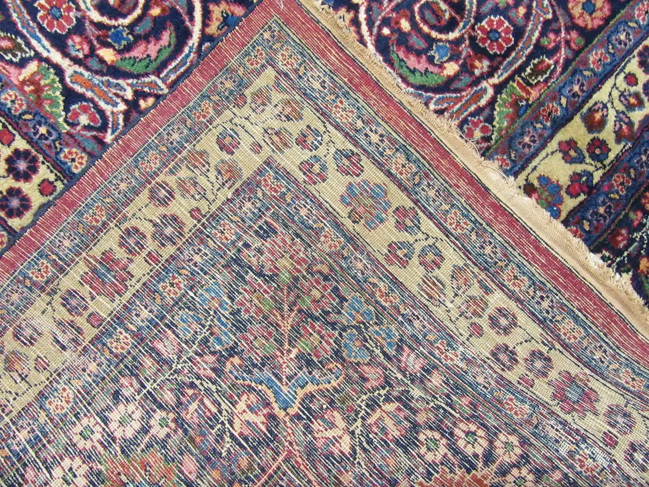 The hand-knotted wool pile is finely executed with high knot density, offering a plush yet durable texture suitable for grand living rooms, formal dining areas, or large open spaces with moderate to high traffic. Its generous proportions and deep, jewel-toned palette provide dramatic elegance and warmth, pairing perfectly with ornate antiques, Persian-style furnishings, or sophisticated traditional interiors. As a vintage piece in great condition, regular gentle vacuuming and periodic professional cleaning will preserve its intricate details and vibrant natural colors for continued appreciation.