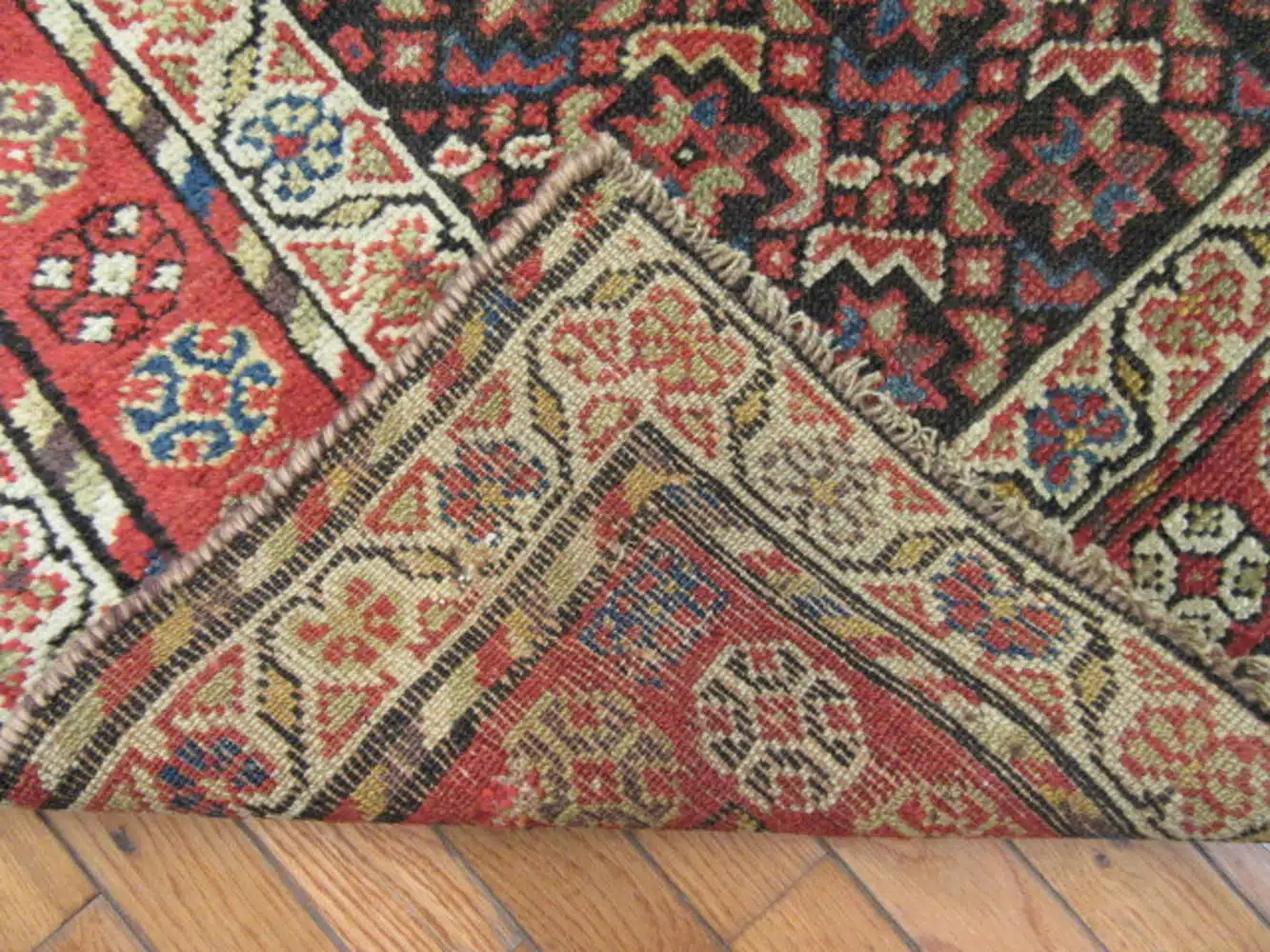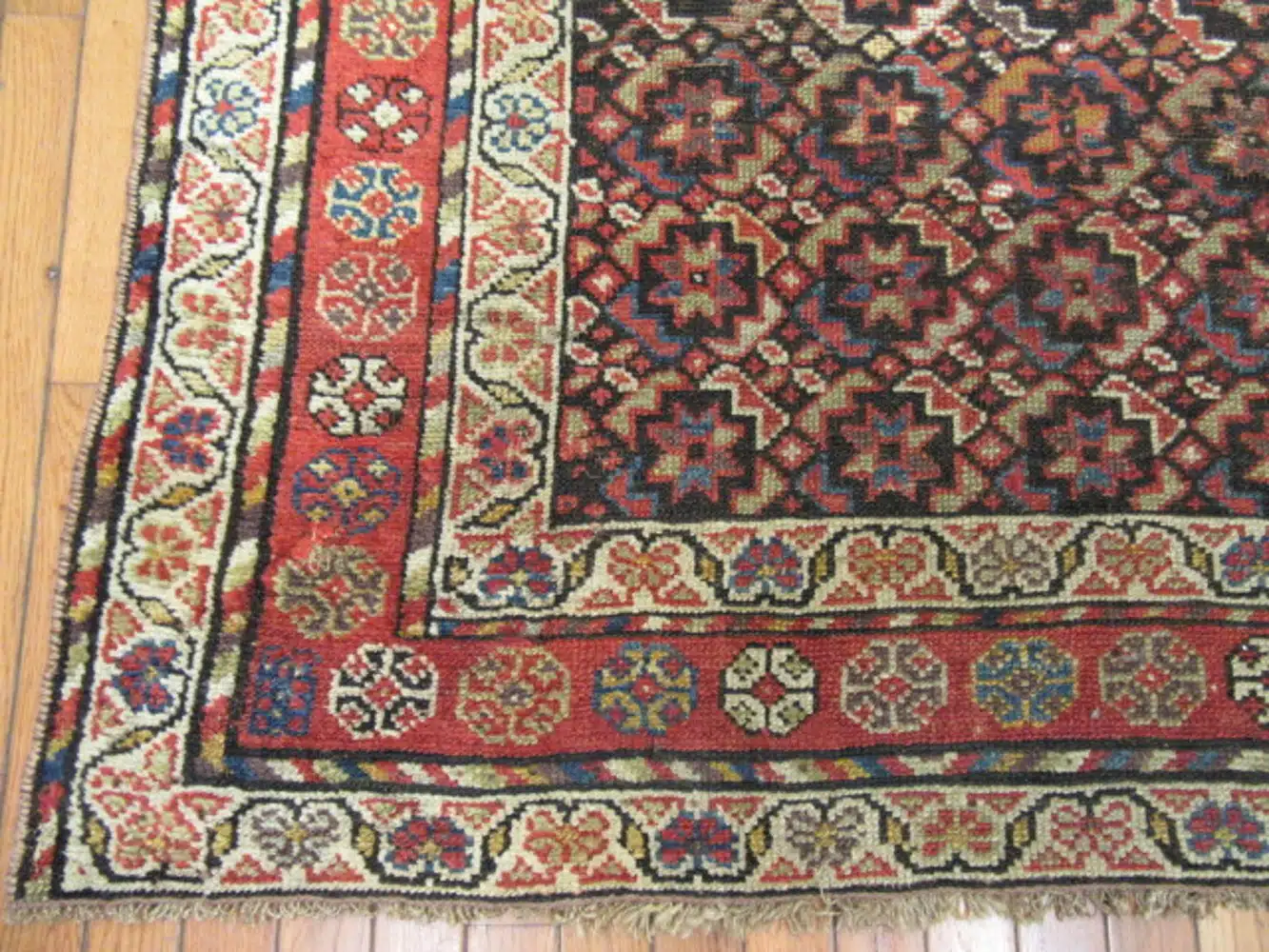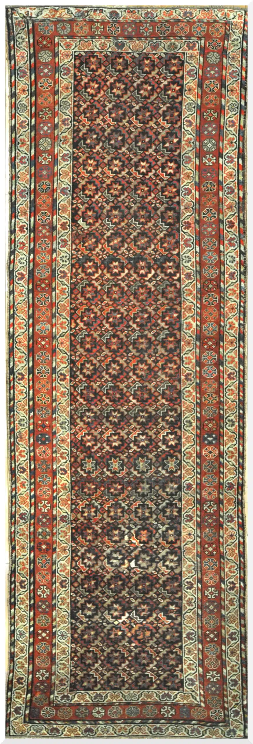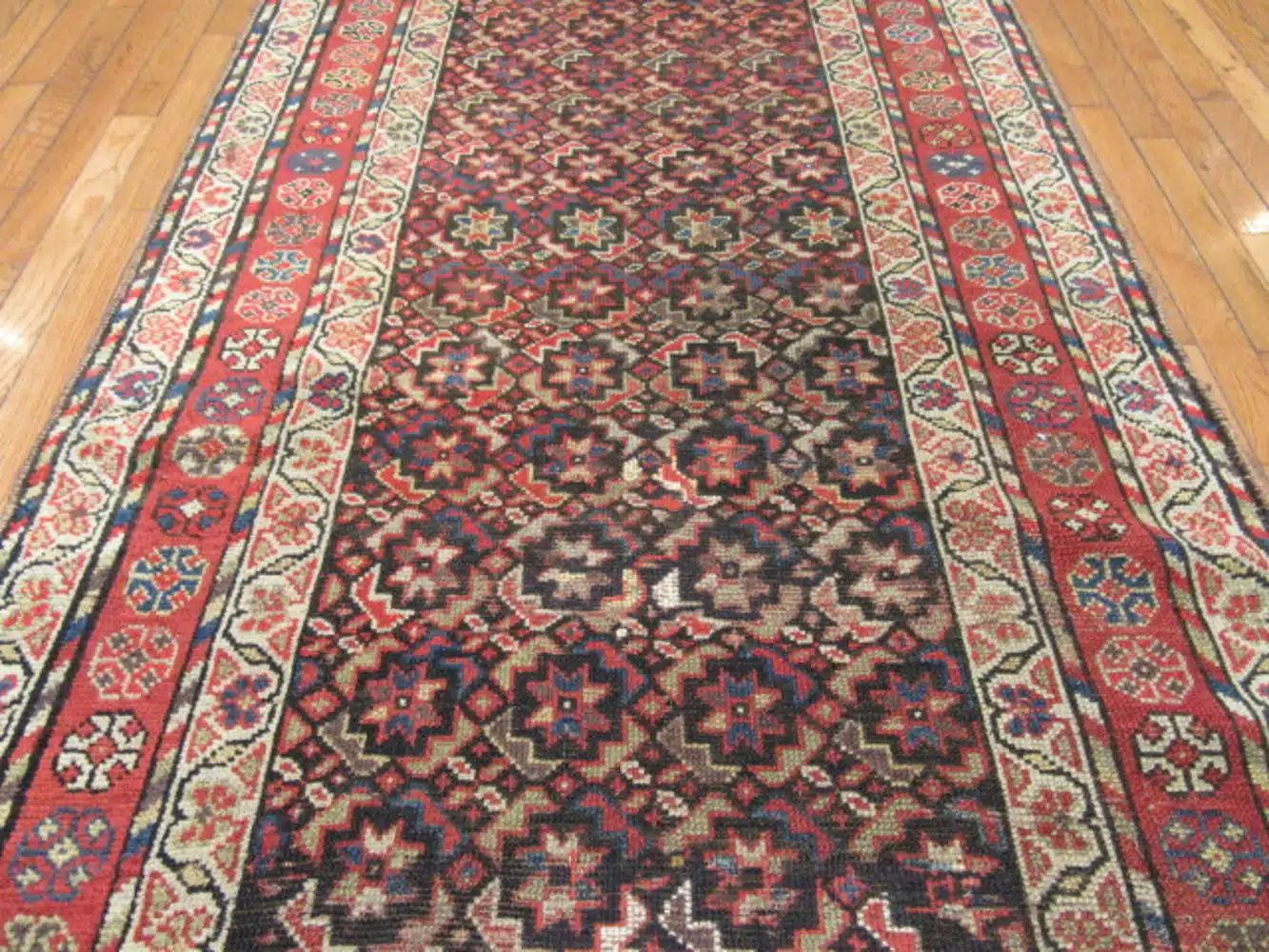 Kurdish rugs from the western region of Iran, particularly around the areas bordering Iraq and Turkey, were woven by nomadic and village weavers in the late 19th and early 20th centuries. These pieces are known for their bold geometric patterns, strong natural colors, and durable wool construction, often featuring repeating motifs like snowflakes or hooked diamonds suited to long runner formats for hallways and corridors.