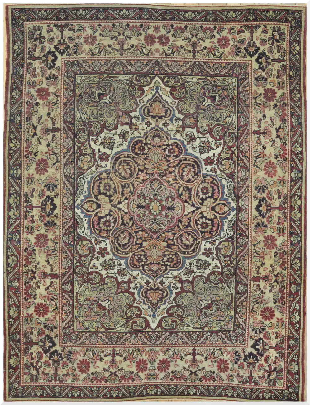 This antique Persian Lavar Kerman rug showcases the refined elegance and intricate artistry for which Kerman weavings are renowned. The composition is centered around an elaborate floral medallion, surrounded by dense scrolling vines and finely drawn blossoms that fill the field with balanced symmetry.