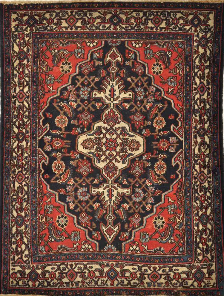 Vintage Malayer rugs from the mid-20th century are known for their village craftsmanship, combining elements of Heriz geometric boldness with finer details and softer colors. Produced in the Hamadan region of western Persia, these compact pieces often feature prominent medallions and strong borders using natural dyes on wool. This example captures the traditional Malayer style with its rich red field and detailed motifs, offering timeless appeal in a versatile small size.