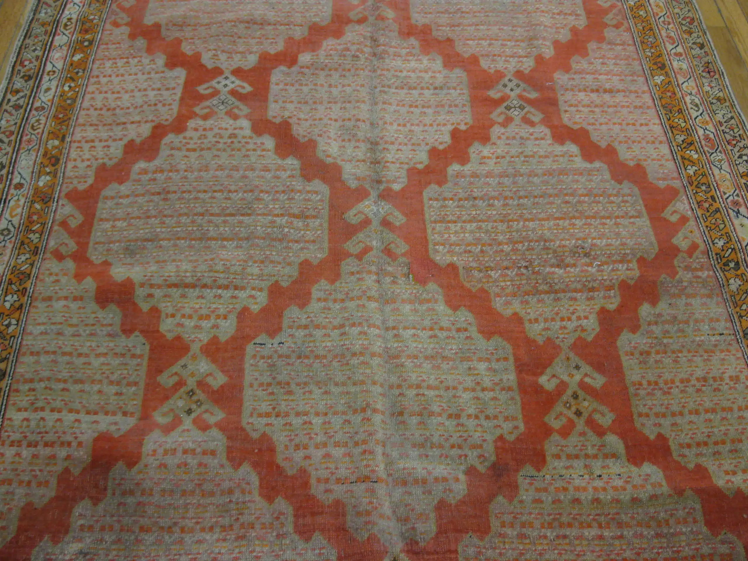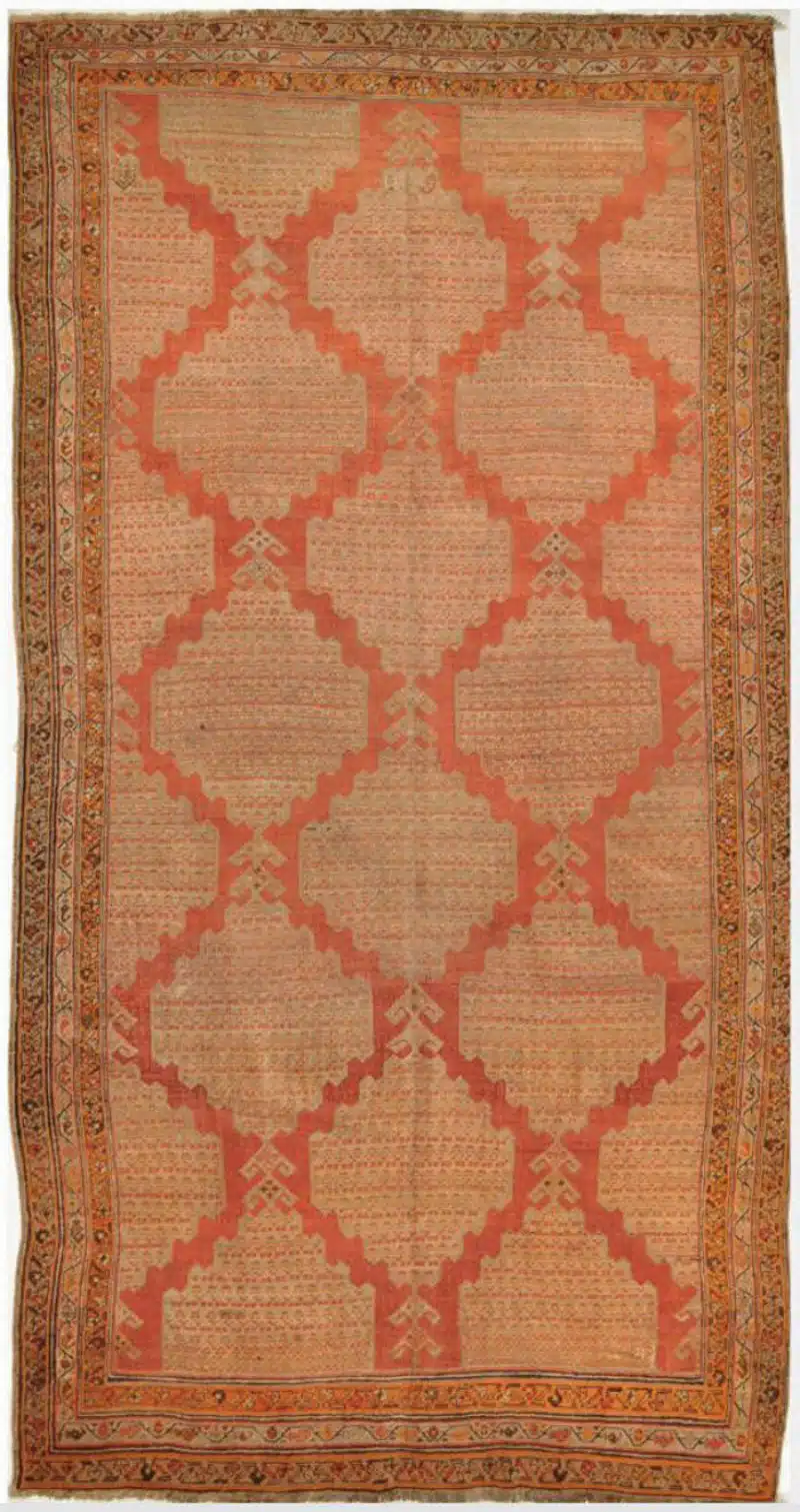 The repeating diamond lattice design creates a sense of movement and elegance, while the warm peach and terracotta palette adds softness and visual warmth to any room. The narrow border frames the field gracefully, allowing the pattern to remain the centerpiece.