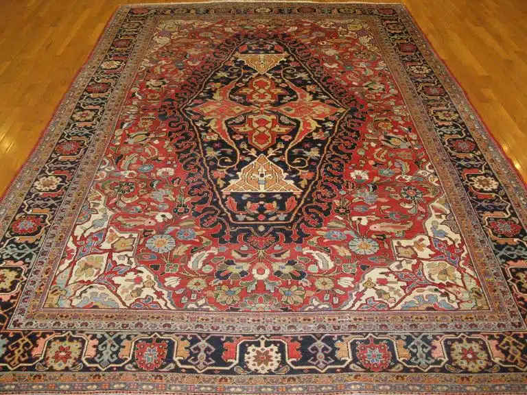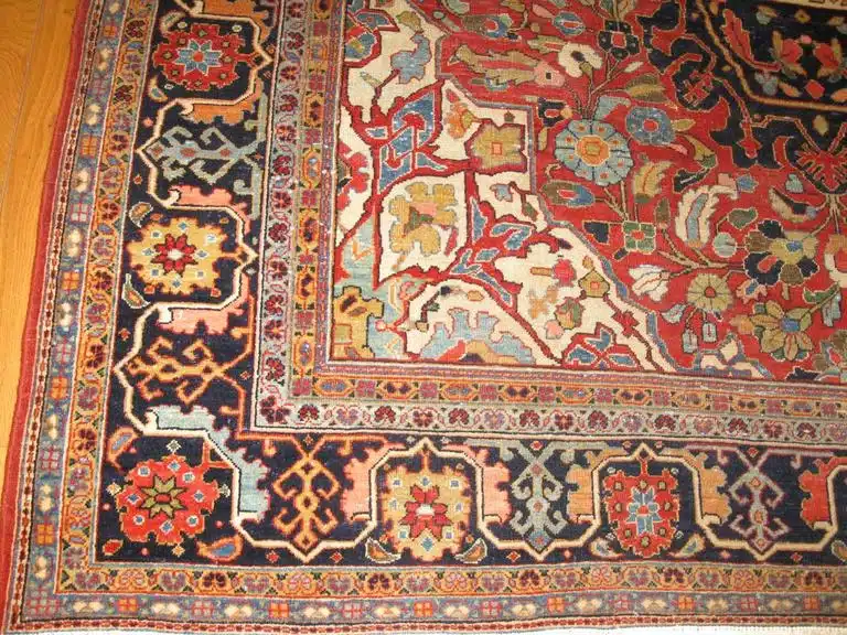 The classic border features multiple guard stripes with floral elements, framing the field beautifully. This piece brings timeless warmth and sophistication to traditional or eclectic interiors, pairing well with wood furniture and neutral walls.