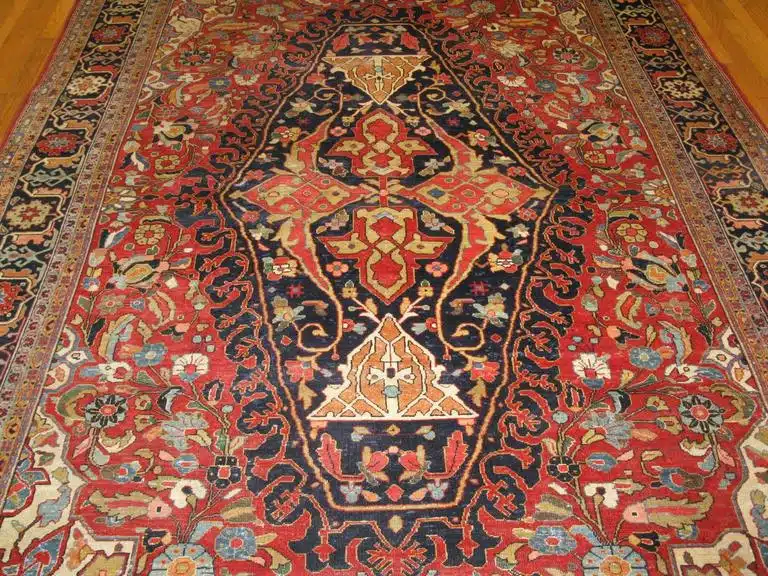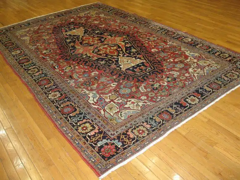 This antique-inspired Persian Sarouk rug in the Farahan style showcases a detailed allover pattern with floral motifs, curving vines, and a central medallion in navy outlined in ivory. The rich red background is filled with intricate Herati-like designs, creating a balanced and elegant look typical of fine Persian weaving.