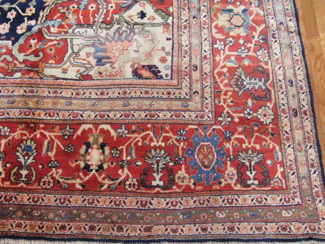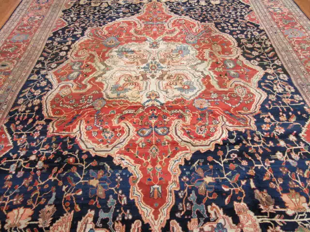 This oversized antique Persian Sarouk Farahan rug features a grand central medallion in navy and ivory with elaborate floral scrolling, set against a rich red field densely covered in curving vines and palmettes. The wide borders include multiple layers of floral guards and cartouches, creating a luxurious frame that draws the eye inward.