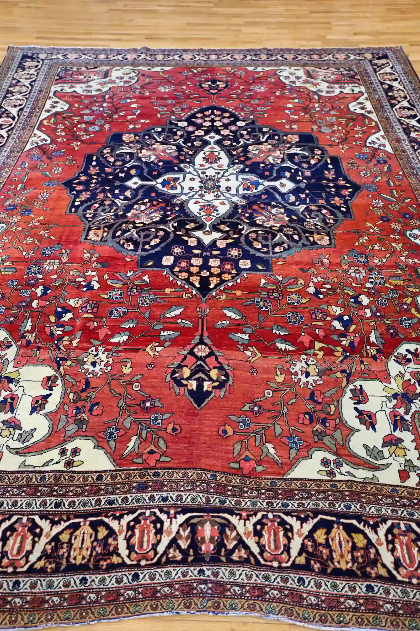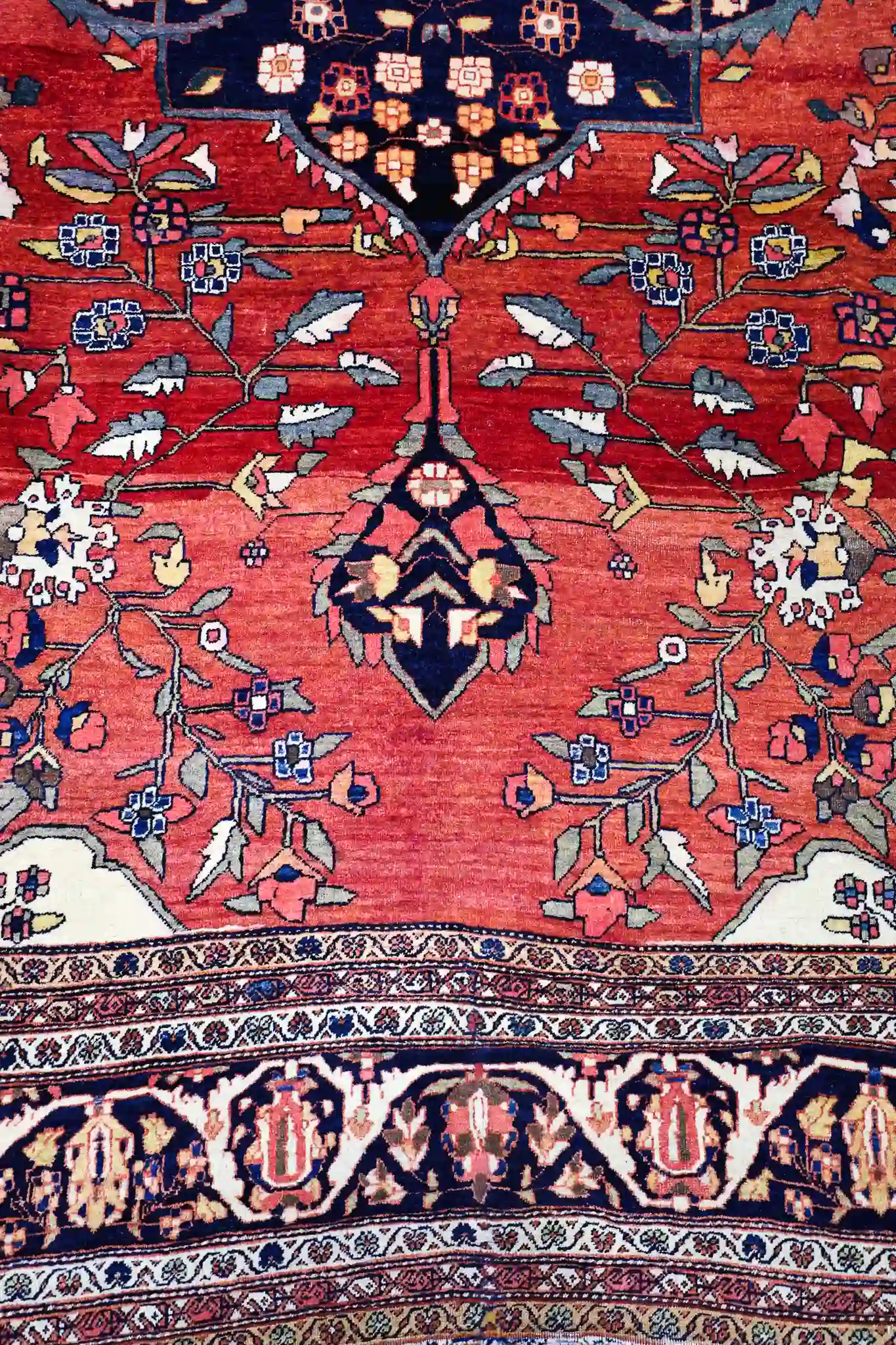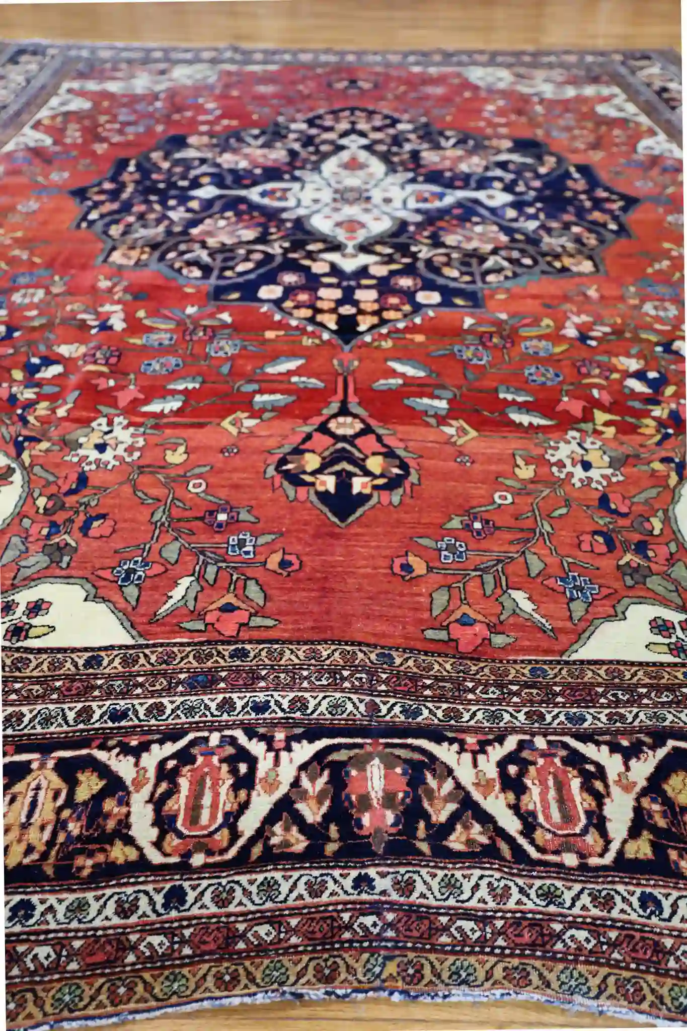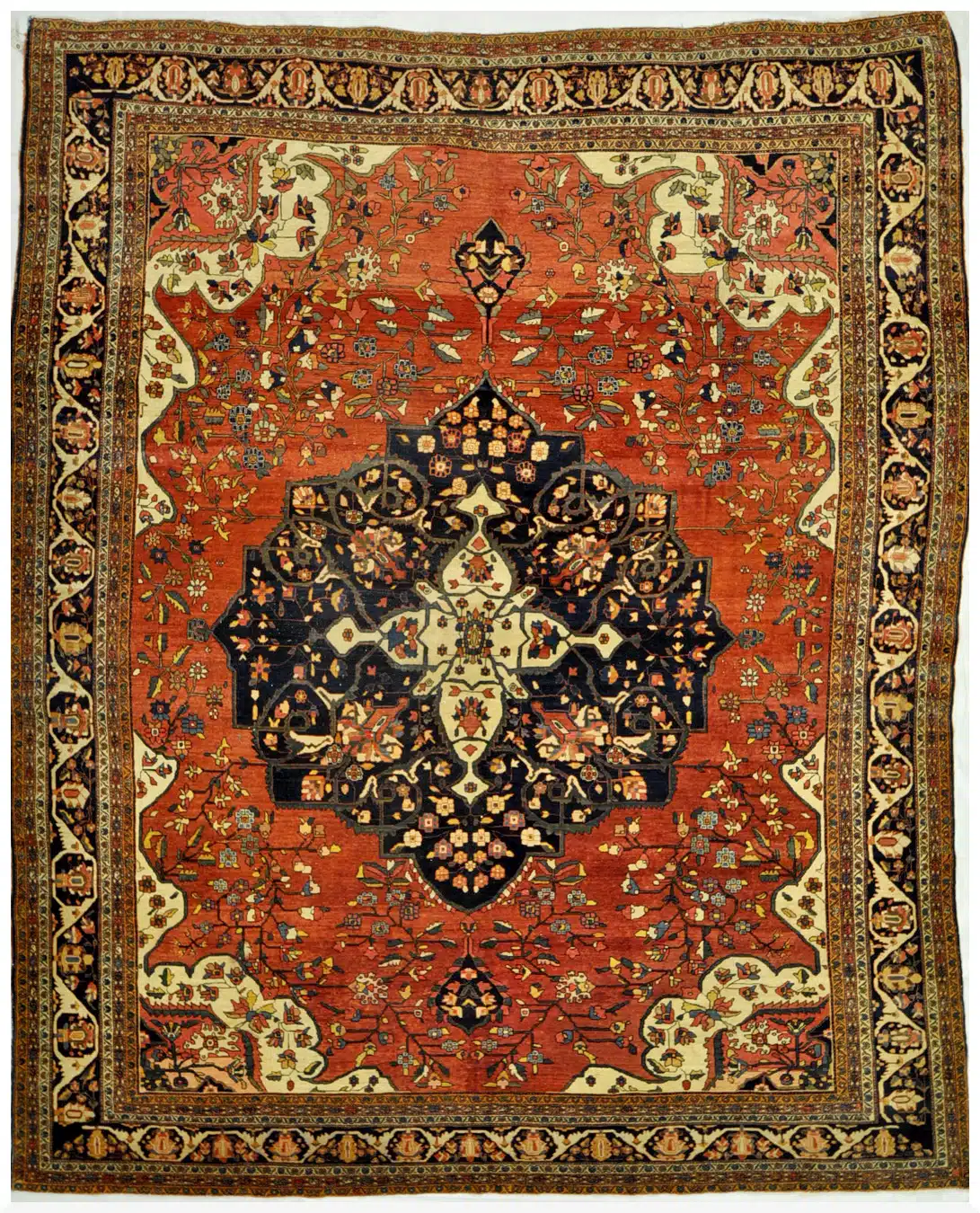 This antique Persian Sarouk Farahan rug from circa 1900 features a magnificent large central medallion with intricate floral arabesques and geometric details, surrounded by an open rust-red field and elegant corner spandrels. The design is framed by multiple borders with repeating palmettes and vines in contrasting navy and ivory, creating a sophisticated, balanced composition characteristic of late 19th-century Farahan weaving.