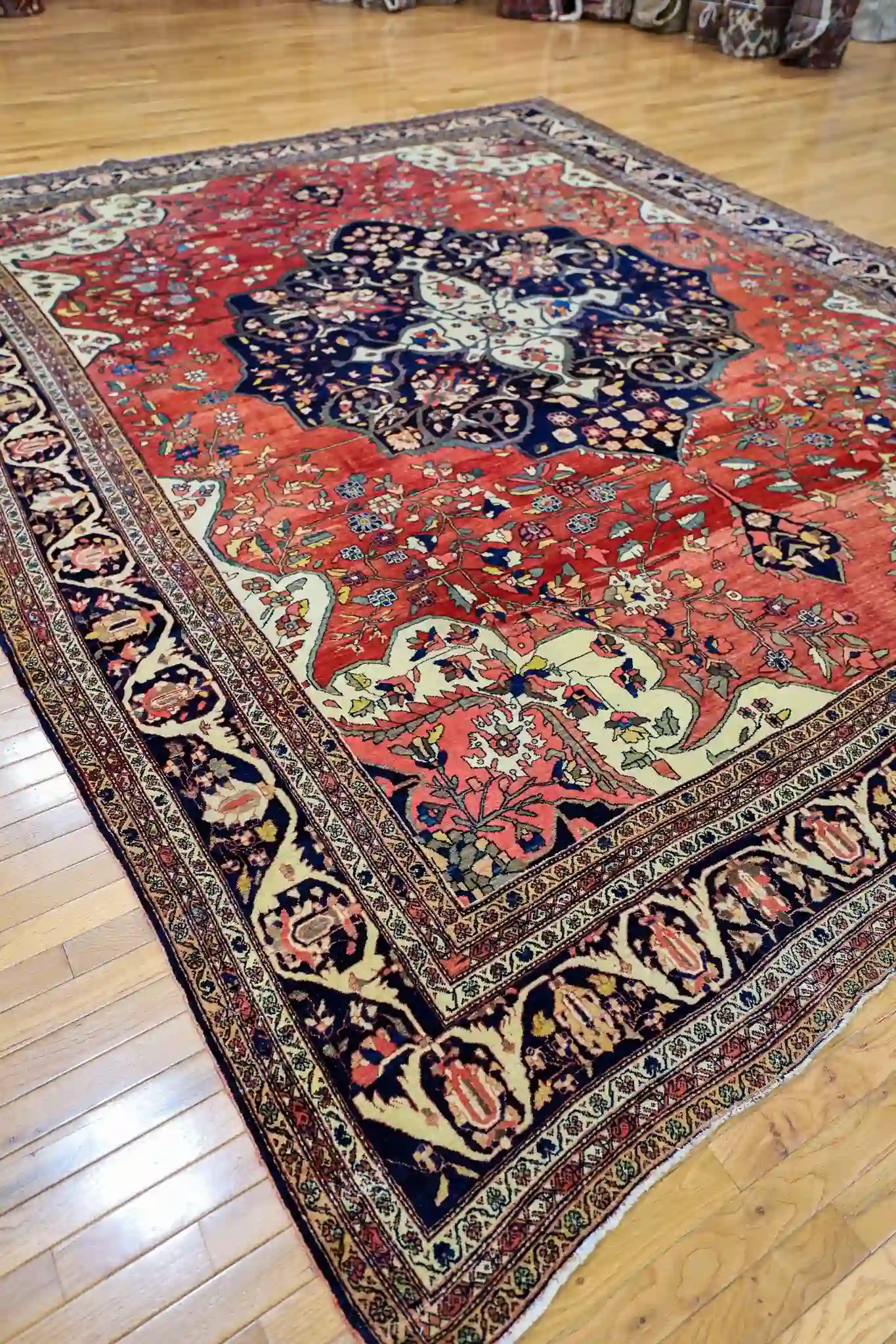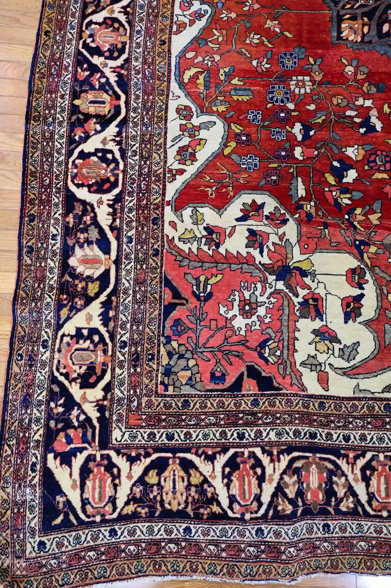 The hand-knotted wool pile is in excellent condition for its age, providing a medium density and smooth texture suitable for formal living rooms, dining areas, or larger bedrooms with moderate traffic. Its generous size and rich red palette offer timeless warmth and luxury, pairing beautifully with antique furniture, traditional decor, or refined transitional interiors. Gentle vacuuming without a beater bar and occasional professional cleaning will help preserve the natural dyes and maintain the rug’s exceptional condition for years to come.
