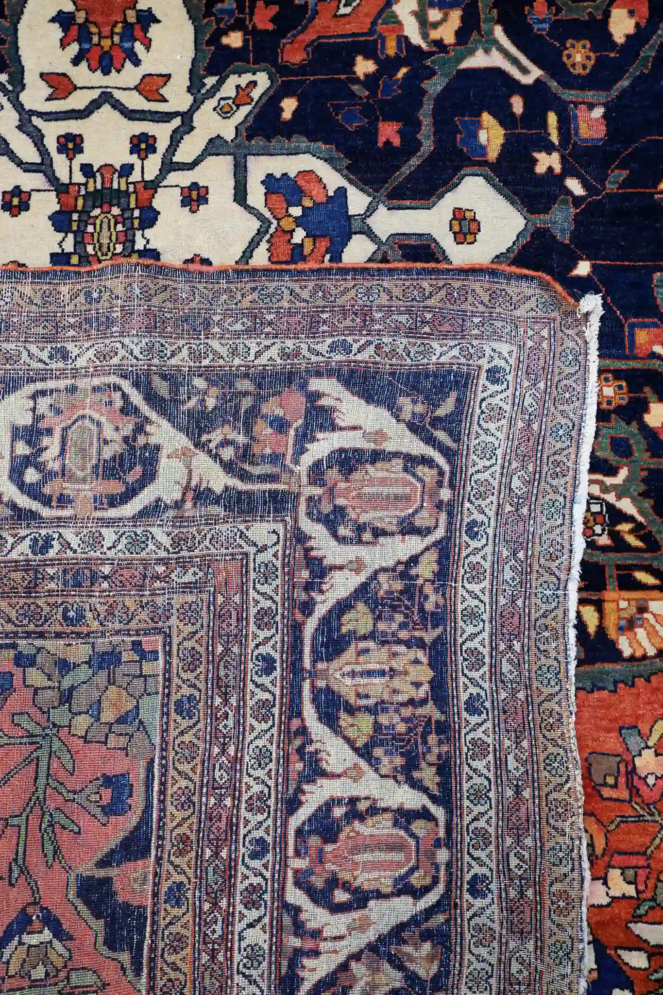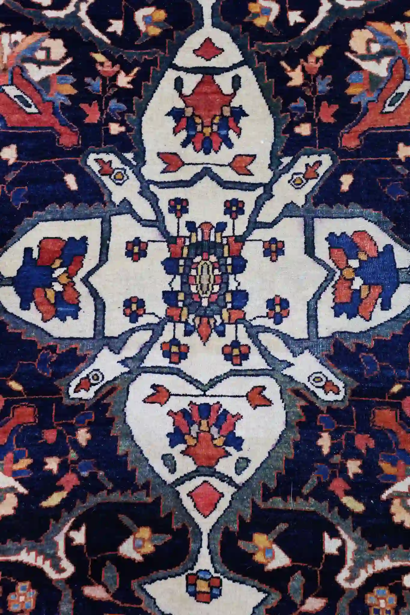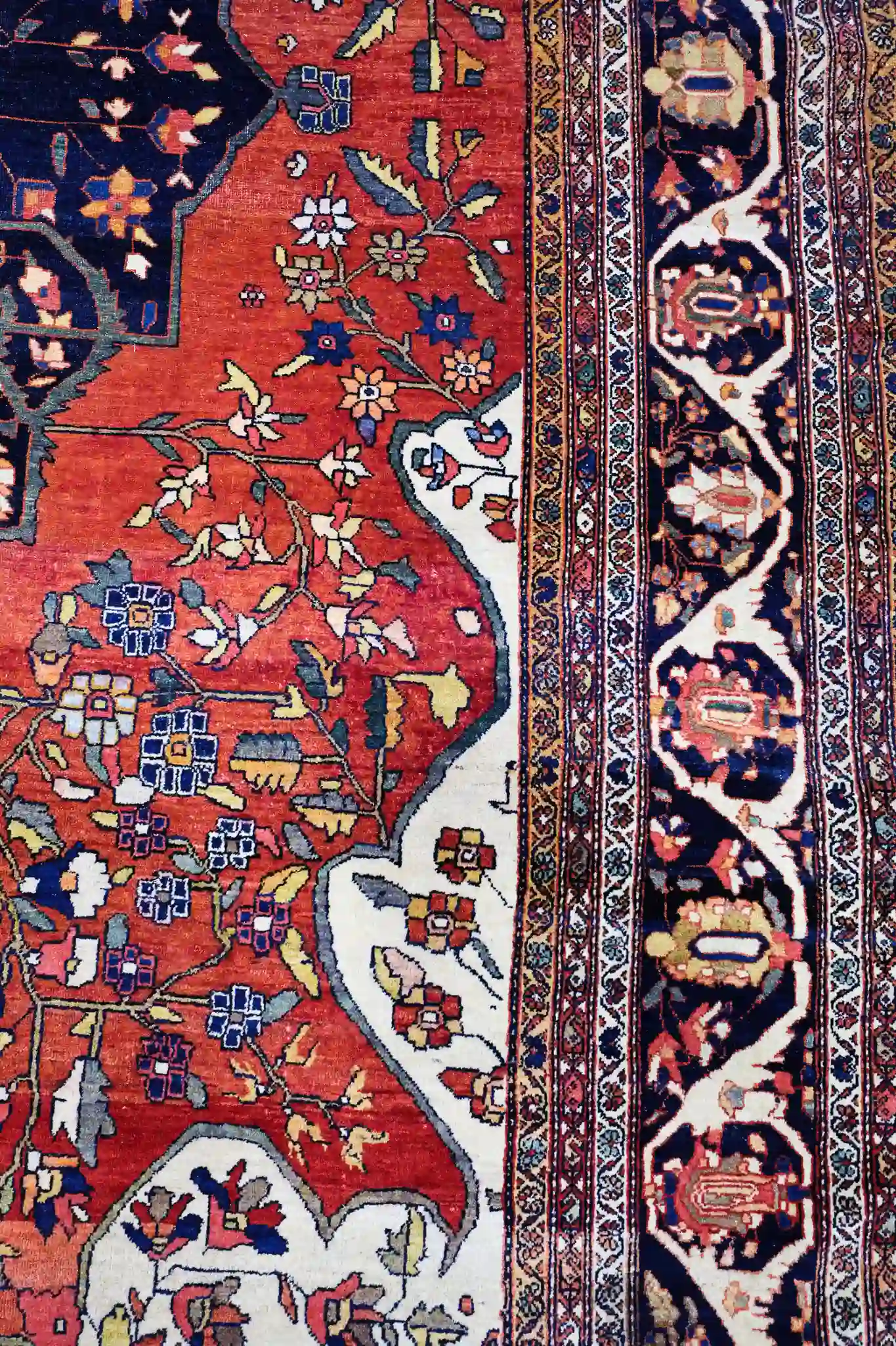 Rich madder red, deep midnight blue, creamy ivory, soft turquoise, warm coral, subtle camel tones