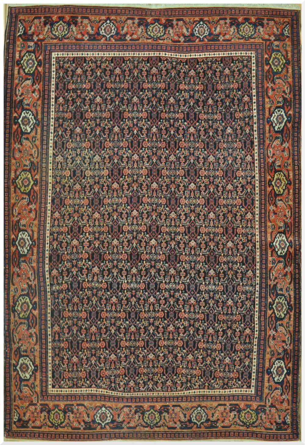 This antique Persian Senneh rug is a graceful example of the refined weaving tradition of the Senneh (Sanandaj) region, known for producing some of the most delicate and tightly knotted rugs in Persia. The rug features an exquisite all-over “Boteh” and floral lattice pattern, each element meticulously rendered with outstanding precision. The dense navy field provides a rich backdrop for the repeating motifs, creating depth, harmony, and visual texture.