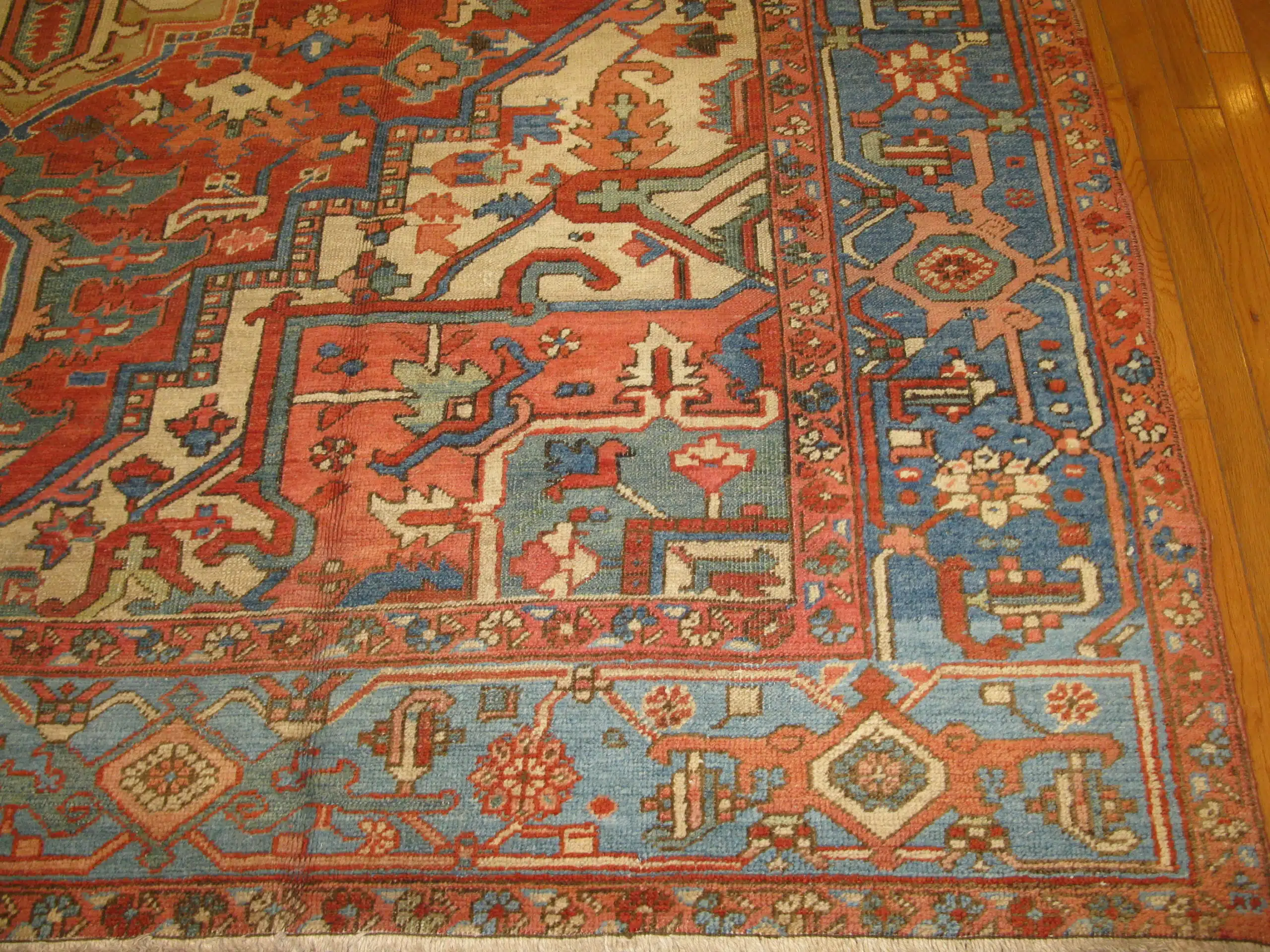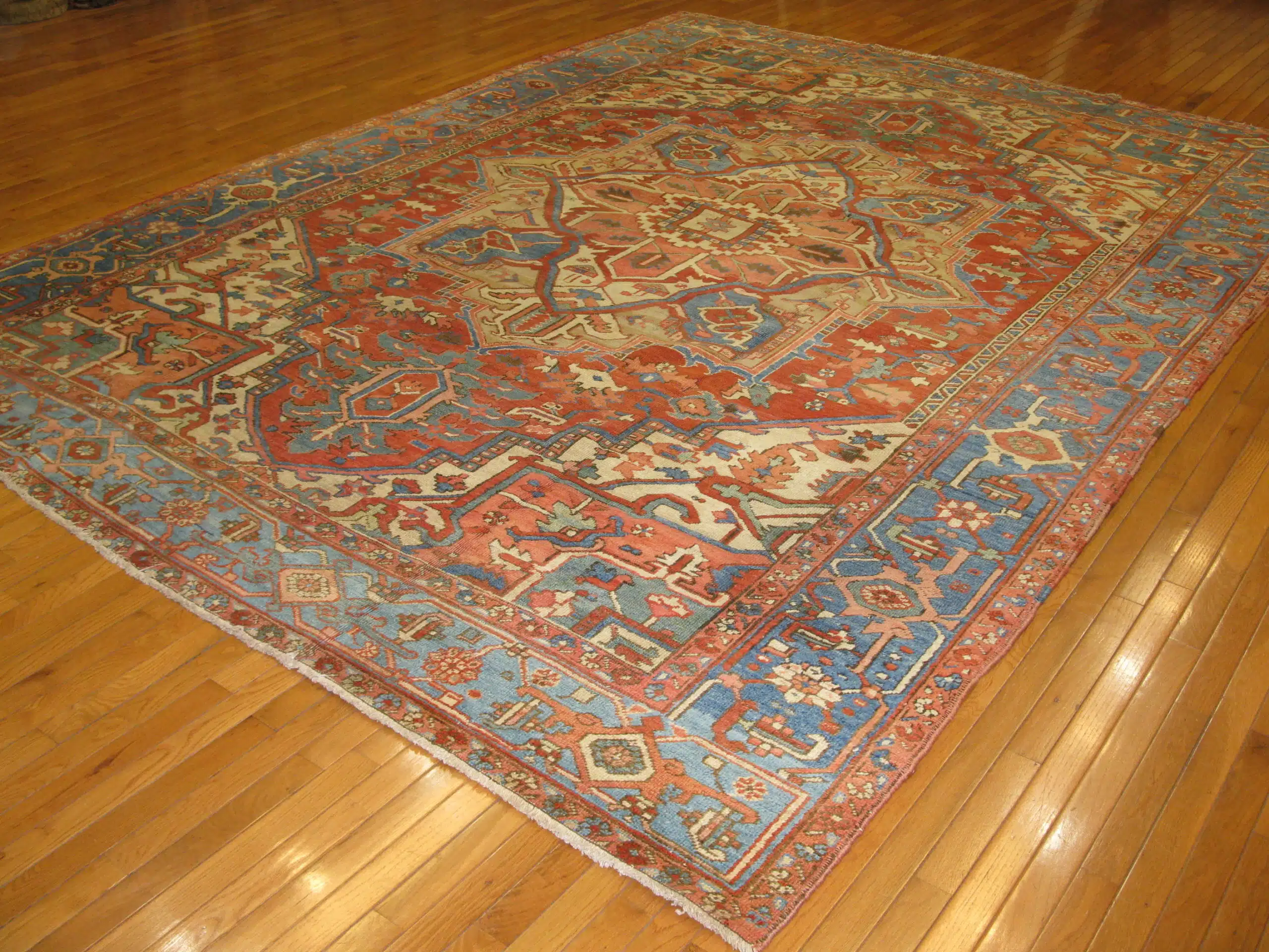 This antique Persian Serapi rug is a powerful and elegant example of Northwest Persian craftsmanship, showcasing a bold geometric medallion set against a rich rust-red field. The commanding central design is framed by strong angular motifs and a beautifully balanced soft blue border, creating a striking yet harmonious composition.
