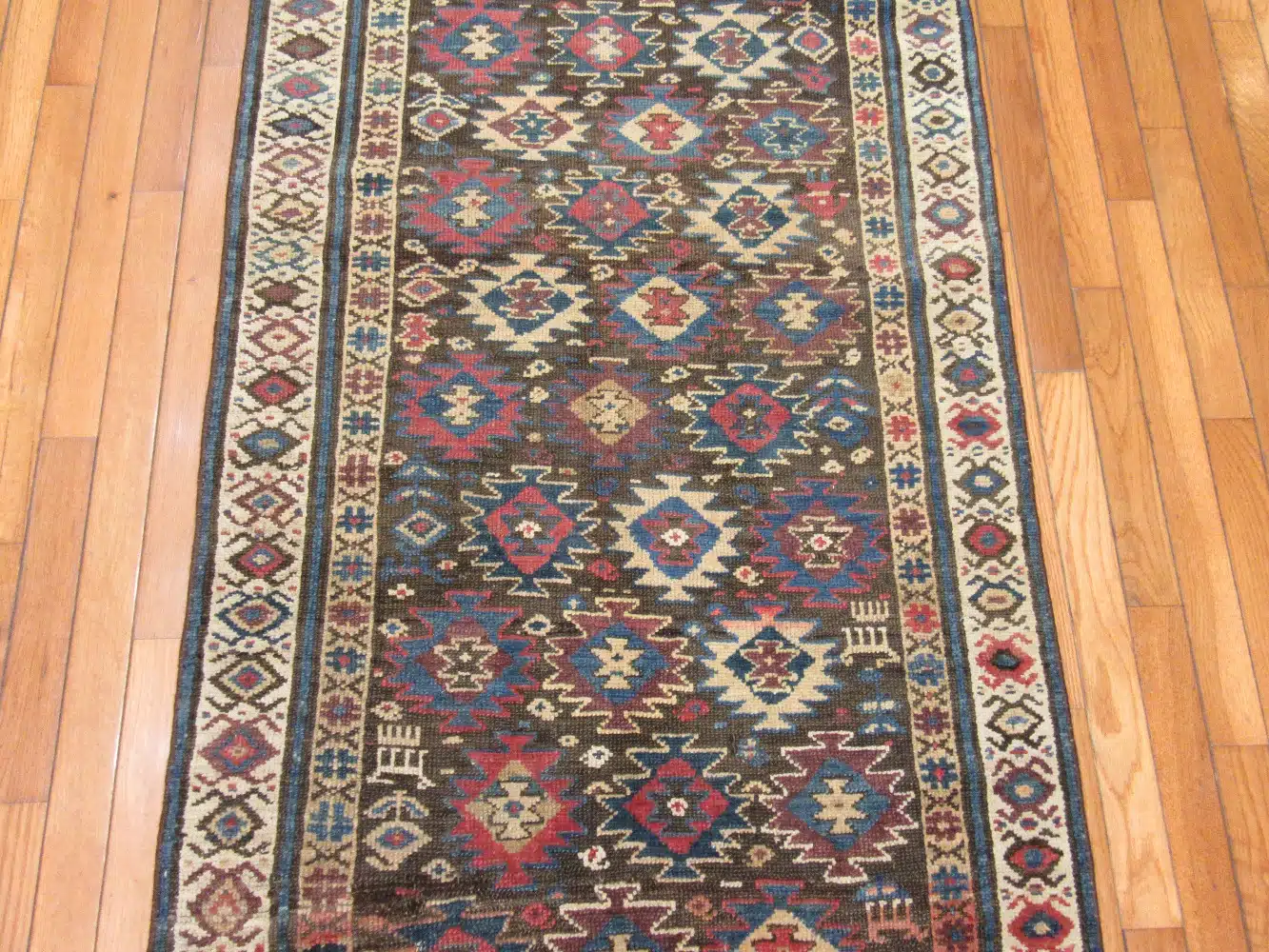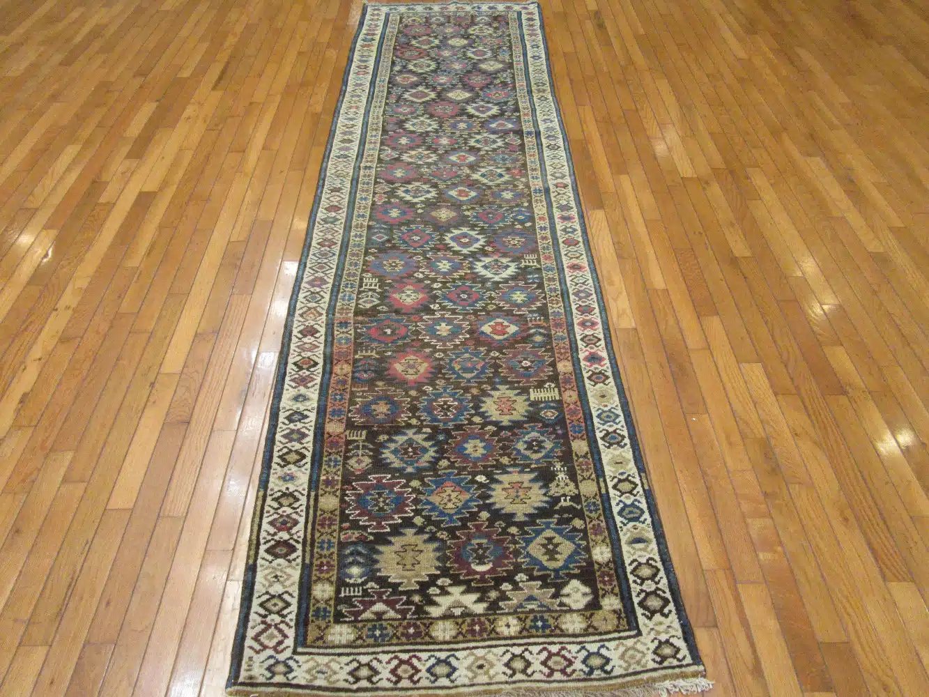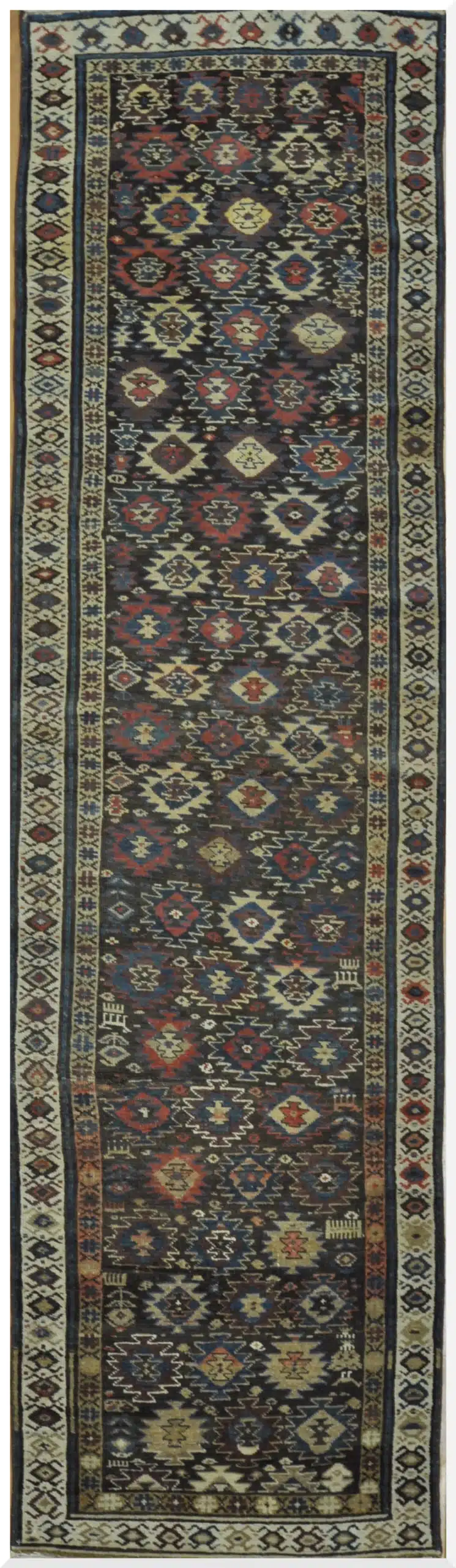 This tribal runner features a rhythmic geometric composition rooted in traditional Caucasian weaving styles. Repeating diamond and star motifs run vertically across the field, creating movement and visual depth while maintaining a strong sense of balance and symmetry.