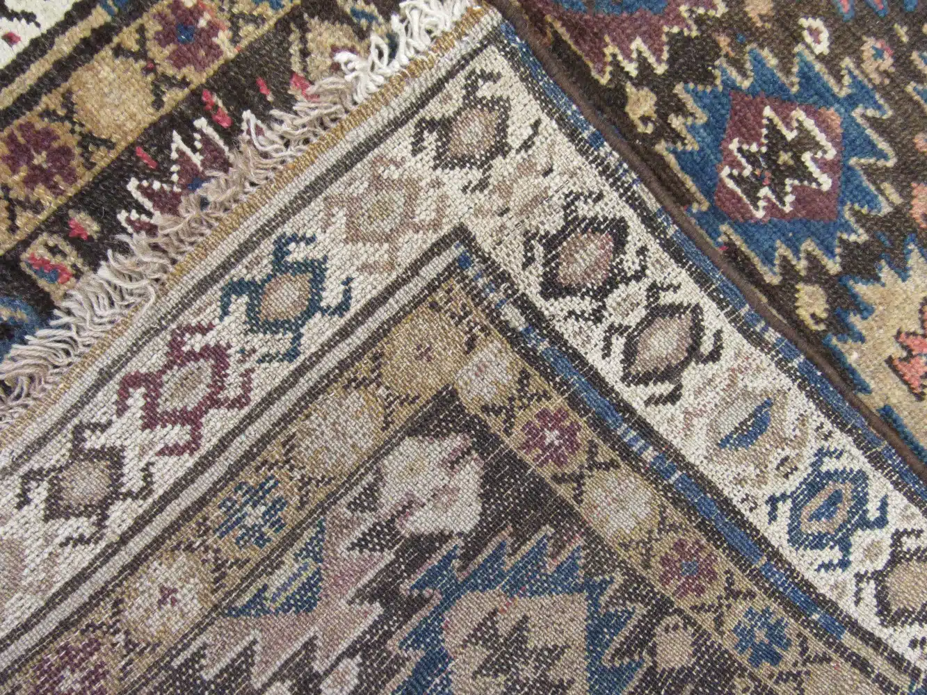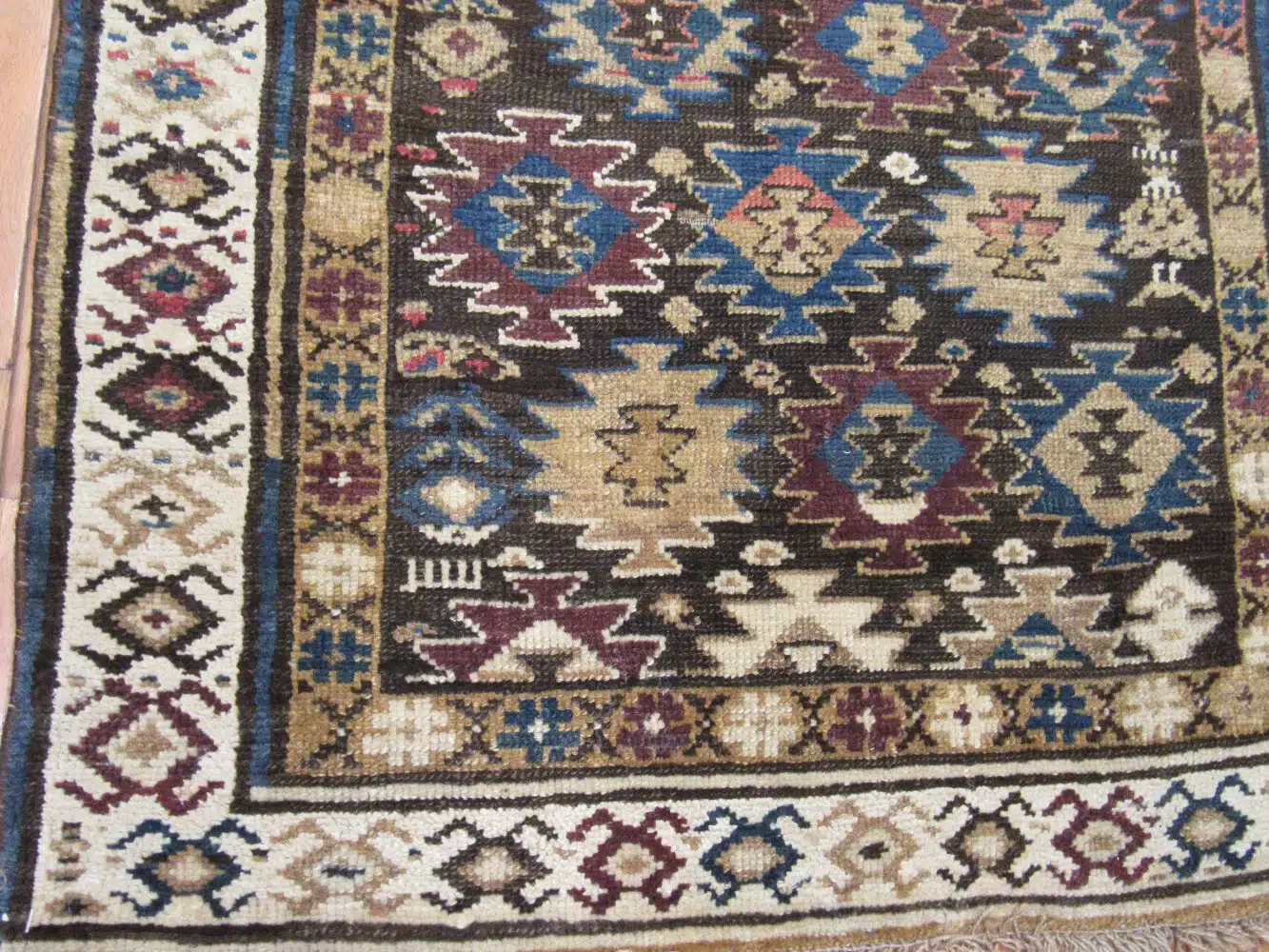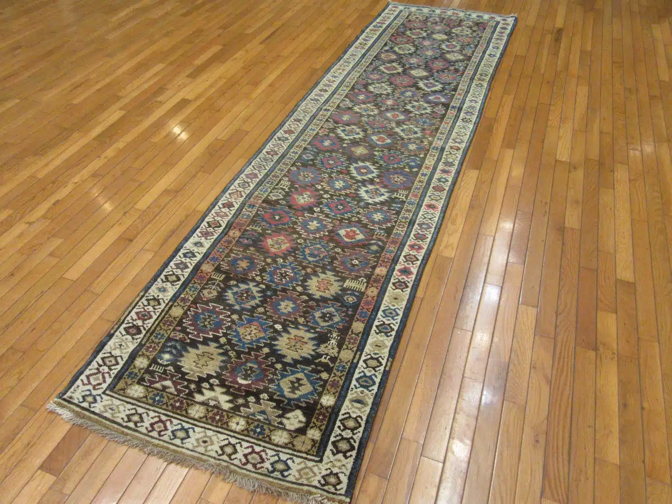 This tribal runner features a rhythmic geometric composition rooted in traditional Caucasian weaving styles. Repeating diamond and star motifs run vertically across the field, creating movement and visual depth while maintaining a strong sense of balance and symmetry.