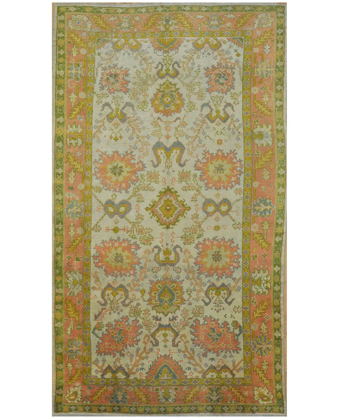 This rare antique Turkish Oushak rug from circa 1910 features a large, open central medallion surrounded by graceful flowing vines, large palmettes, and delicate floral elements on a pale beige field. The spacious design is framed by multiple wide borders with repeating motifs in soft coral and green tones, creating an airy and elegant composition. The gentle fading from age and natural dyes gives it a beautiful, harmonious patina that makes this hard-to-find large size even more special.