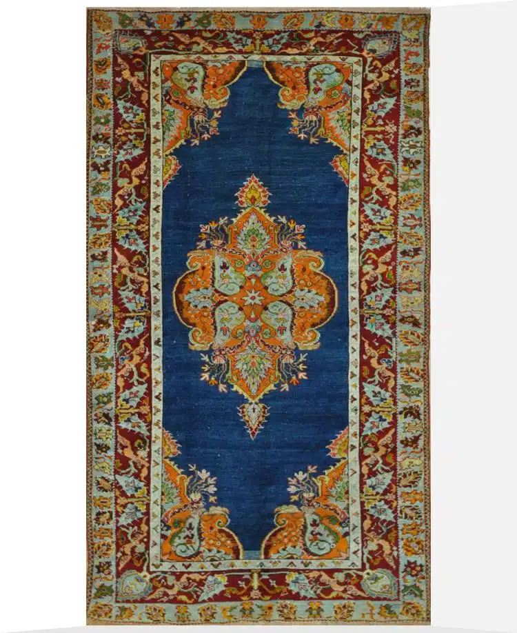 This antique Turkish Oushak rug showcases a striking central medallion with elaborate floral and arabesque patterns in contrasting warm tones, set against a deep blue field. The spacious layout includes graceful vines extending outward, framed by multiple detailed borders featuring repeating motifs in orange, green, and gold. The natural dyes have developed a beautiful soft patina over time, giving the rug an elegant, vintage depth while maintaining excellent condition.