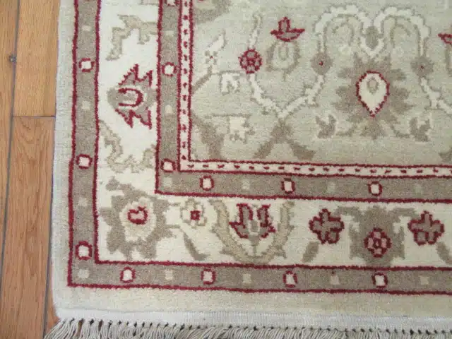 The gentle patterning is balanced and understated, allowing the rug to enhance the space without overwhelming it. A delicate border frames the design, adding definition while maintaining a light and airy appearance.