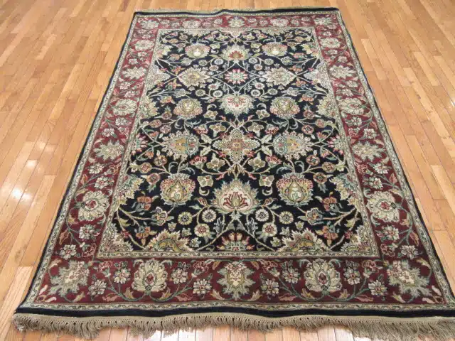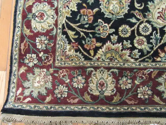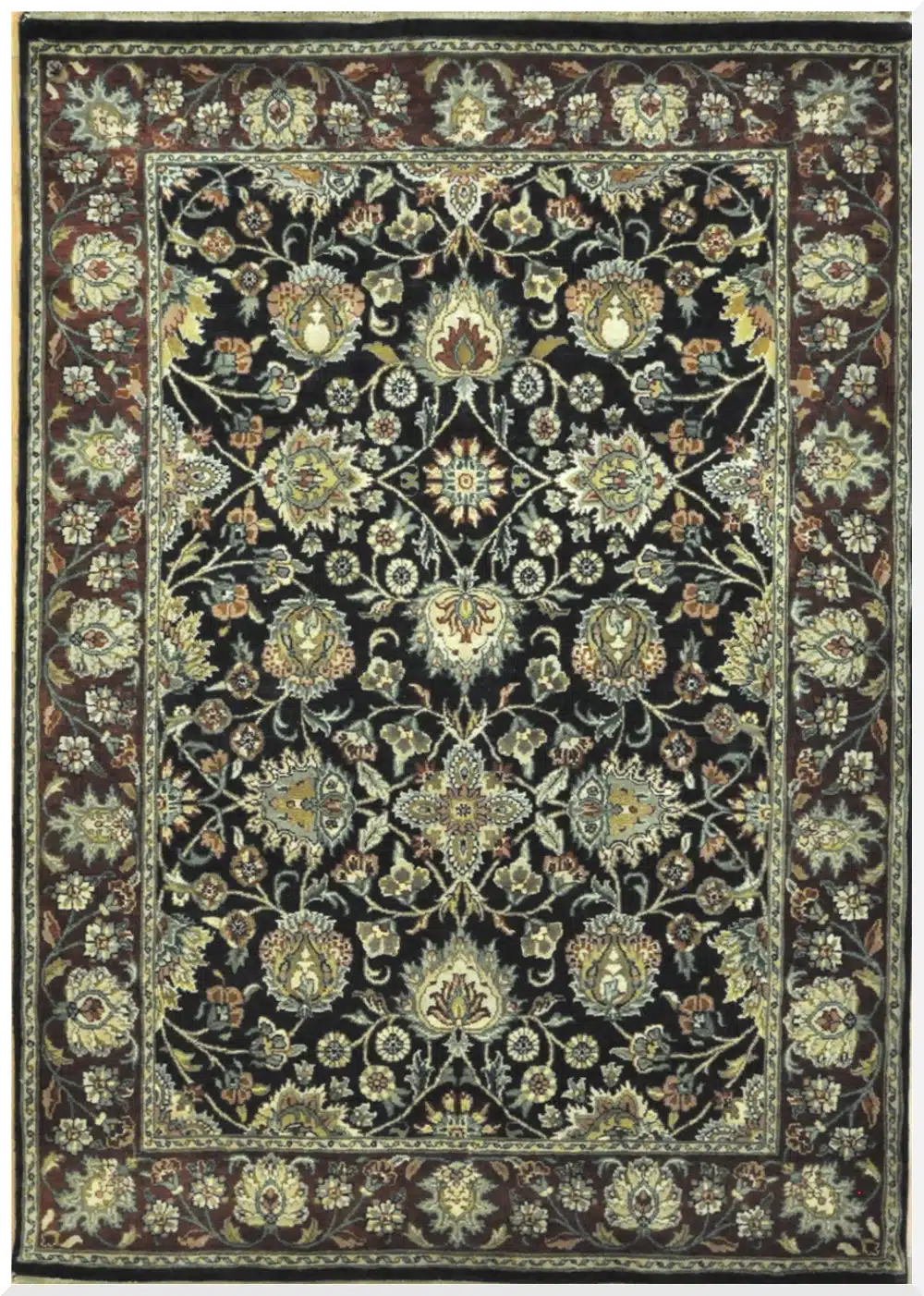 An ornate border in ivory, soft gold, and warm beige tones frames the rug beautifully, enhancing its depth and contrast while complementing the dark central field. The fine detailing throughout reflects skilled craftsmanship and careful attention to symmetry.