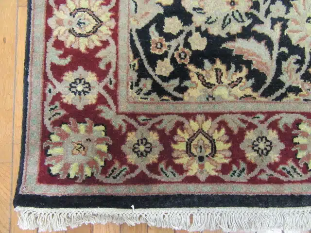 Hand knotted in India using quality wool, the rug reflects skilled craftsmanship and enduring design traditions. The floral medallions and scrolling vines are carefully rendered, creating depth and contrast while maintaining a refined, cohesive look.