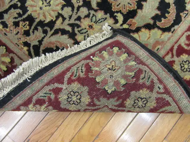 Small handmade Oriental rug with a black floral field and traditional design, hand knotted in wool and ideal for compact spaces.