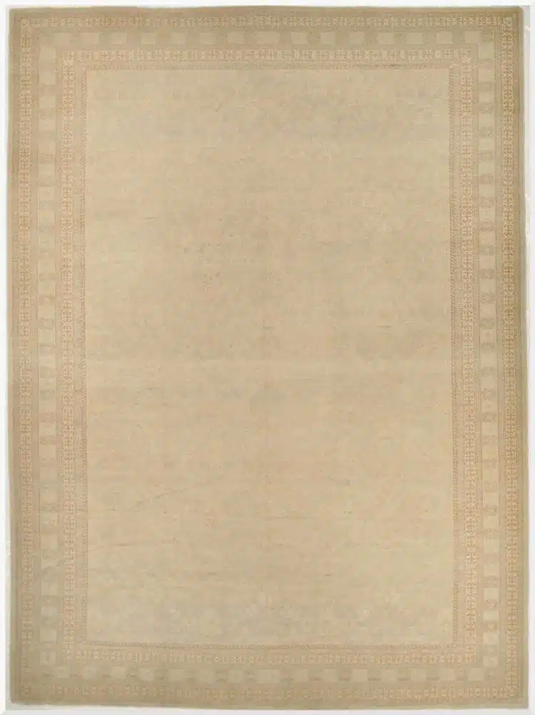 Khotan rugs from the antique period were known for their large-scale, open designs and light palettes influenced by East Turkestan traditions. Modern recreations like this one use softer neutrals and spacious layouts to evoke that classic feel while suiting contemporary spaces. Hand-knotted in wool, it offers a plush texture and subtle color variations that give it an authentic vintage charm.